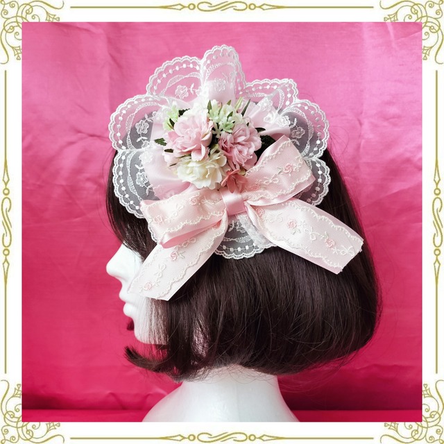 淡いピンクの薔薇を集めたヘッドドレス ミルキィなピンクのリボンにホワイトのドット入りのレースを重ねて スィートで可愛い仕上がりになりました。 ピンク好きな方にお勧めです。 裏側にクリップピンが1つついています。 直径約15cm(レース部分を含む)