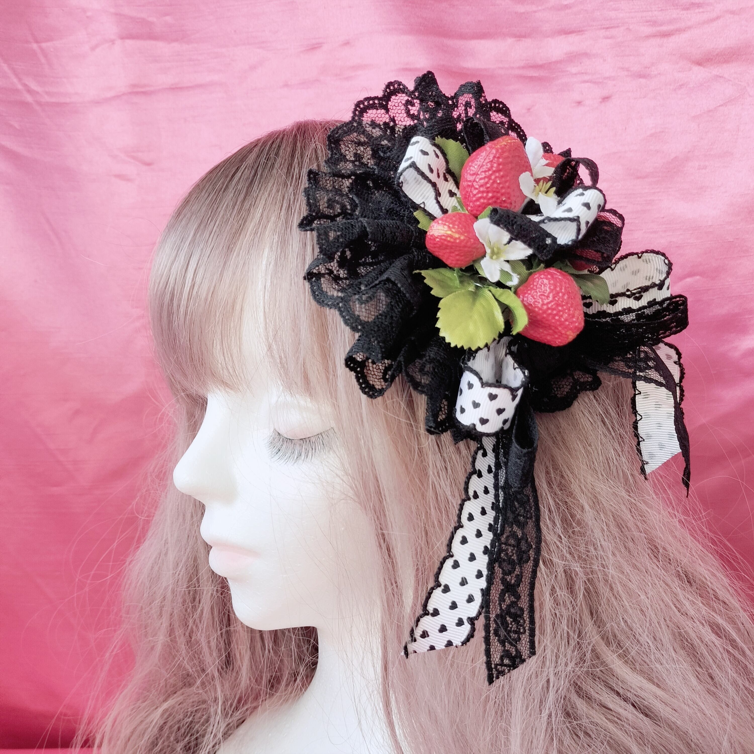 黒い小さなハートのドット入りリボンとブラックレースのリボンのWリボンがポイントです。