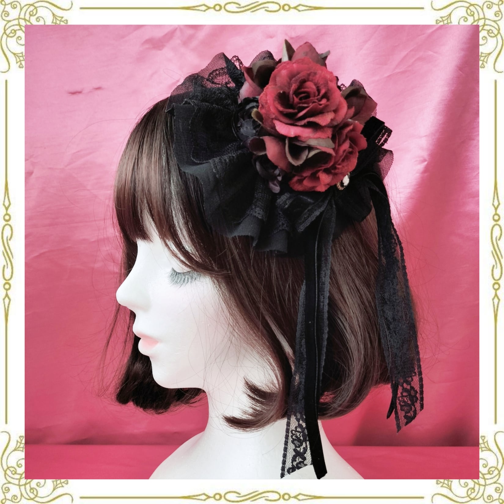 深い赤薔薇とラナンキュラスを纏めたダークなヘッドドレス