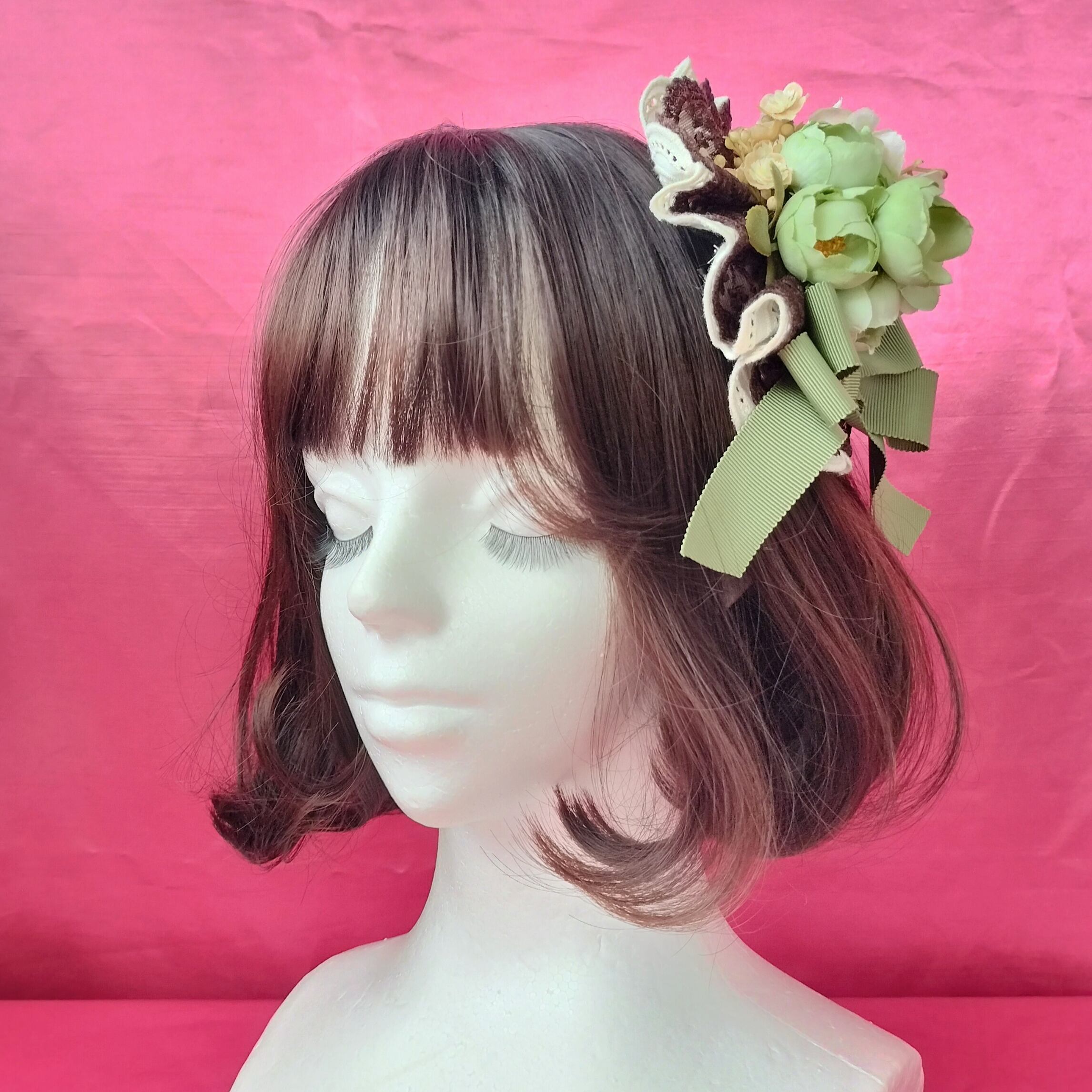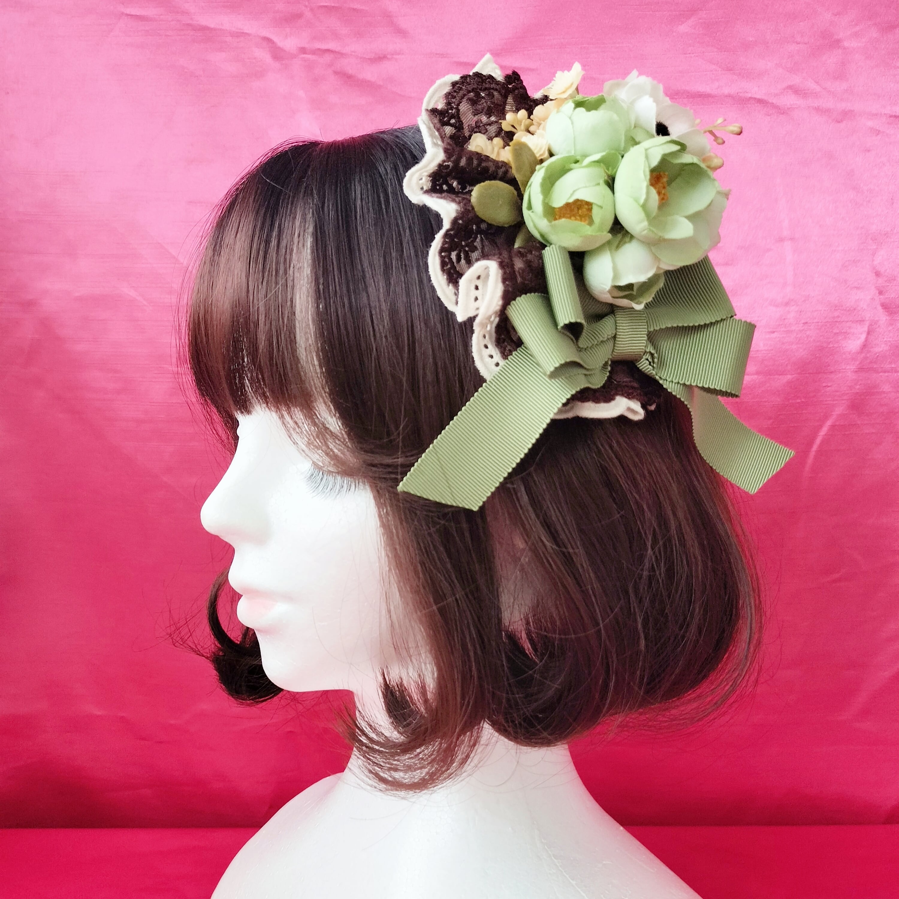 柔らかなグリーンの薔薇と生成りのアネモネや小花を集めたヘッドドレス