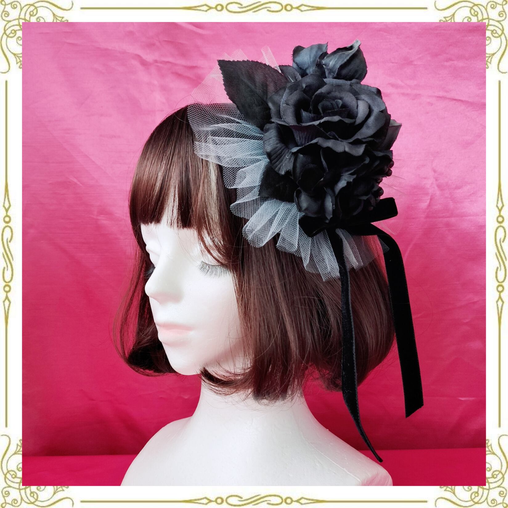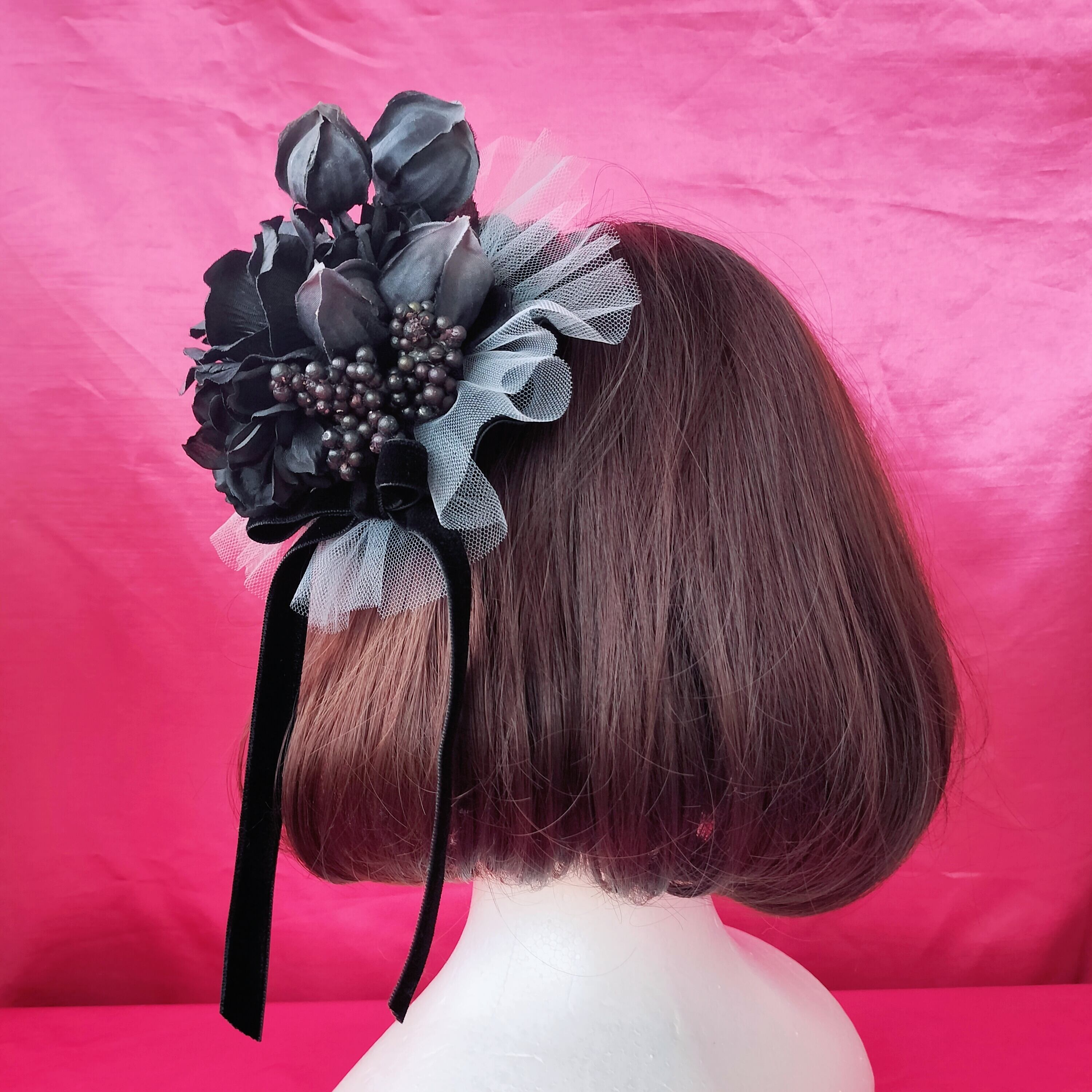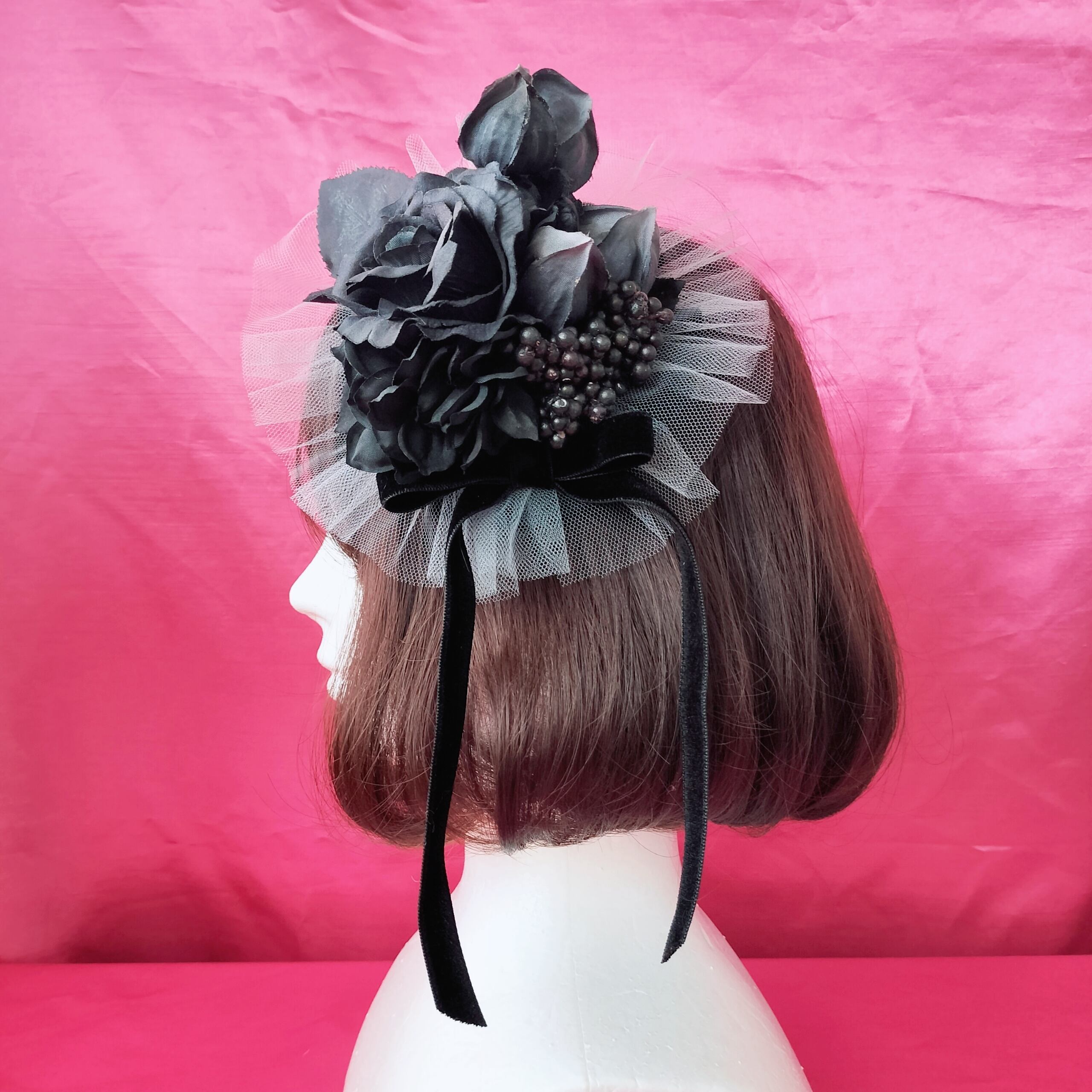 周りは黒いベロアのリボンとチュールを重ねてゴージャスに仕上げました