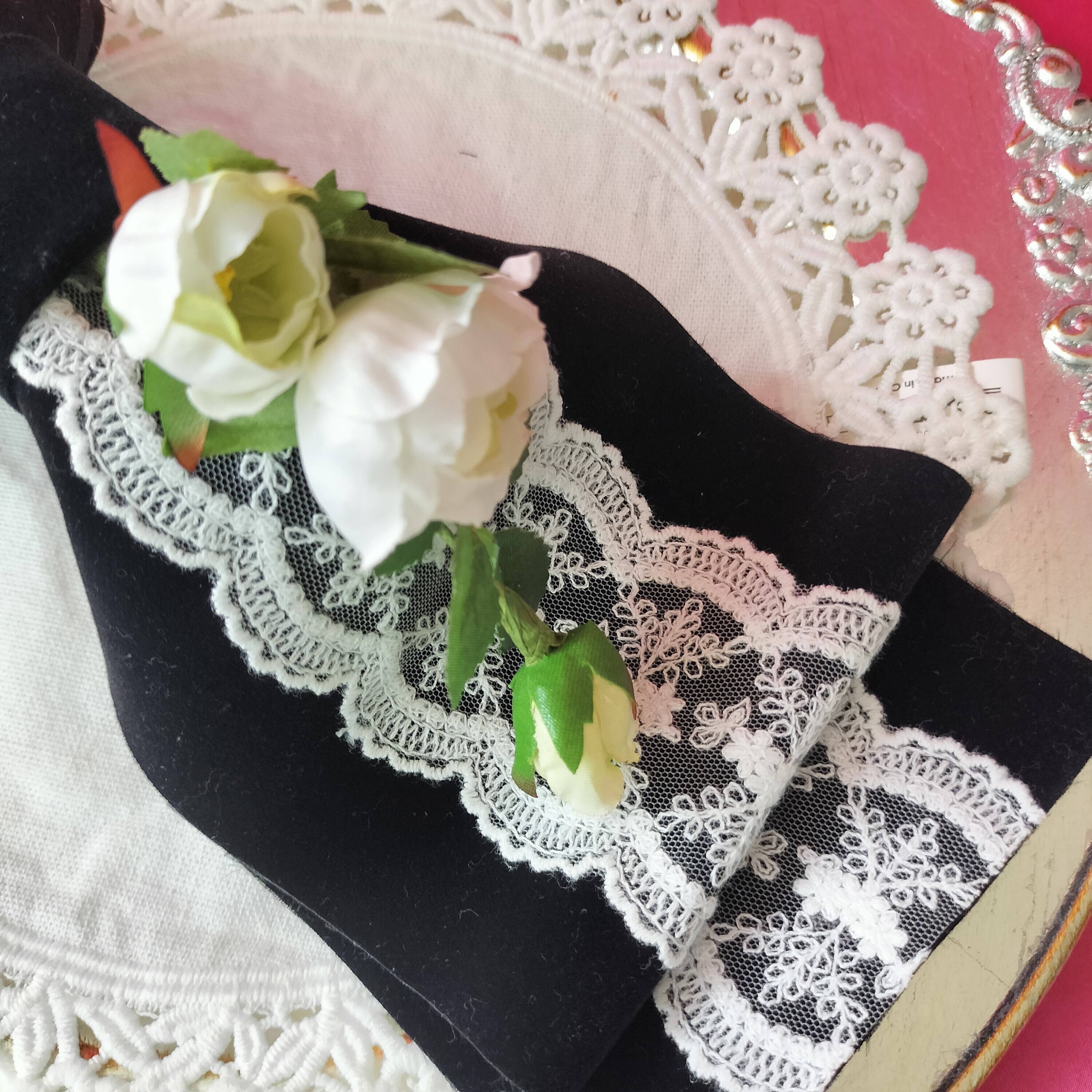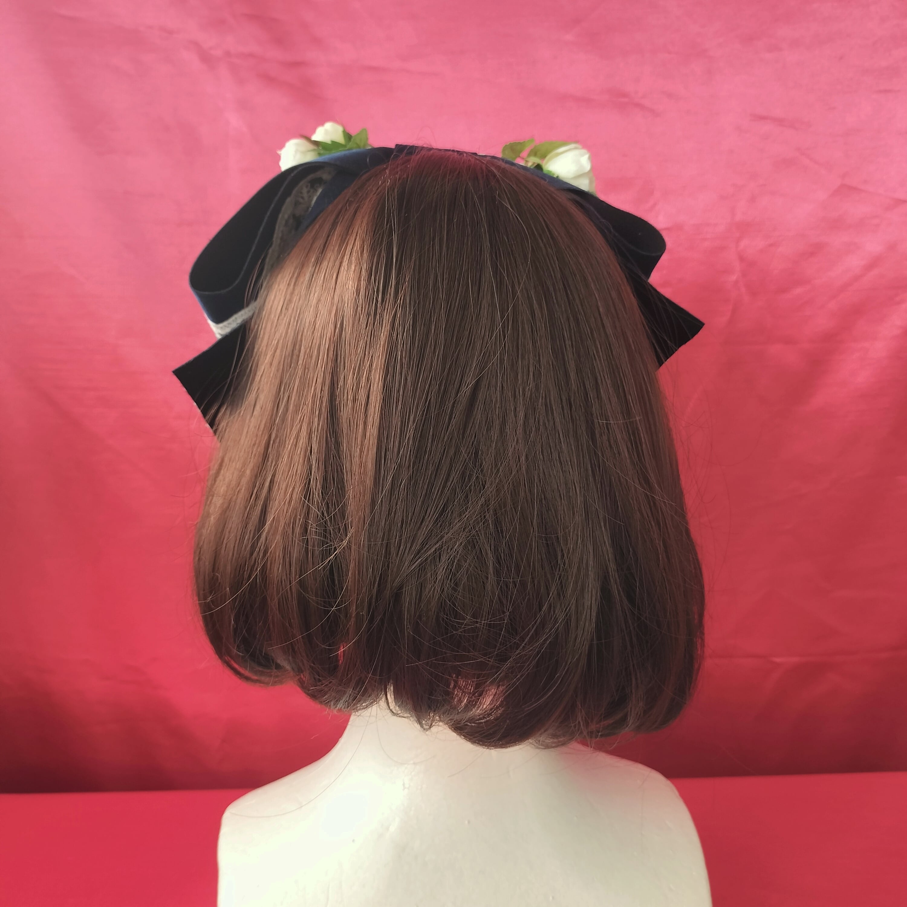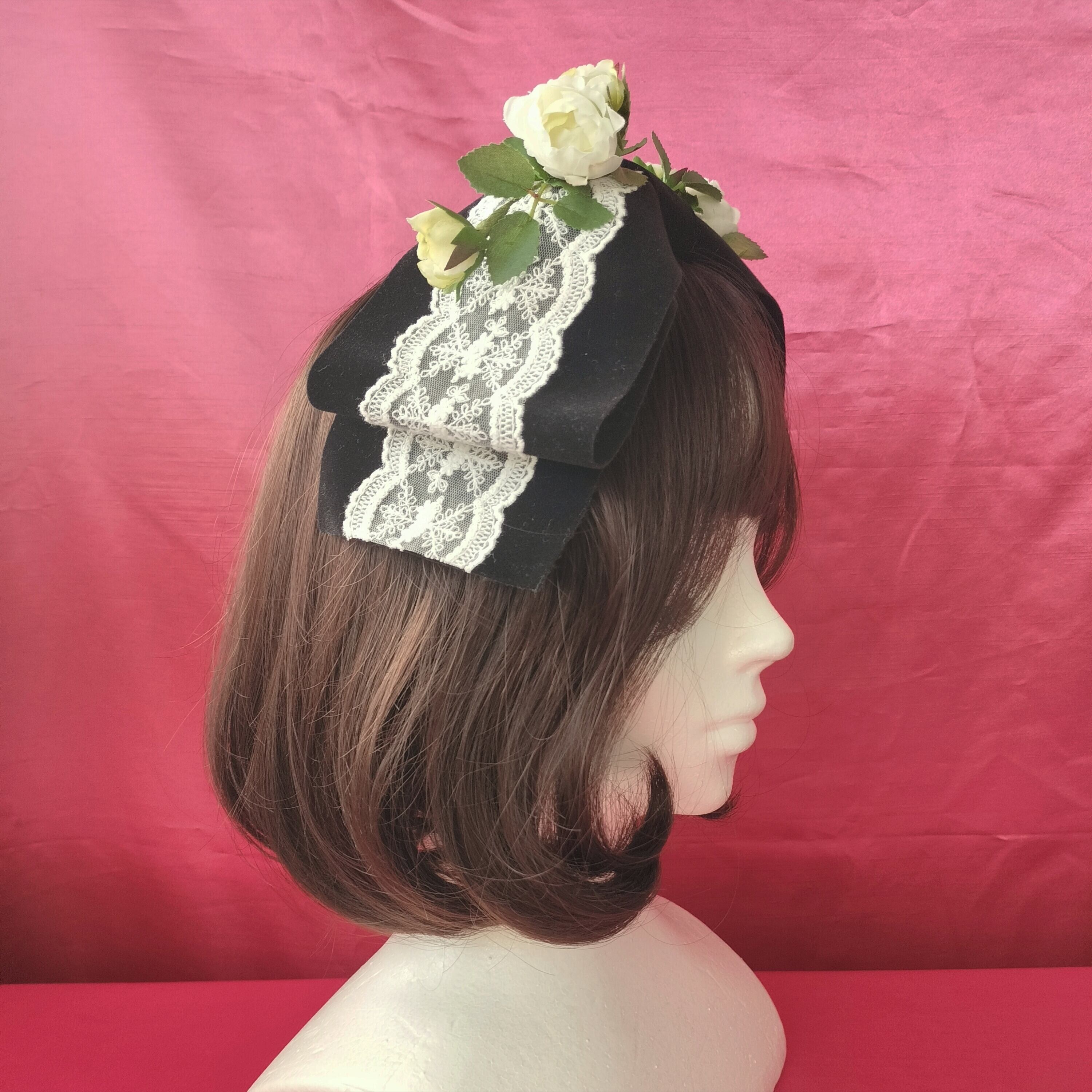 大きなベロアのリボンに美しい白薔薇をあしらったヘッドドレス