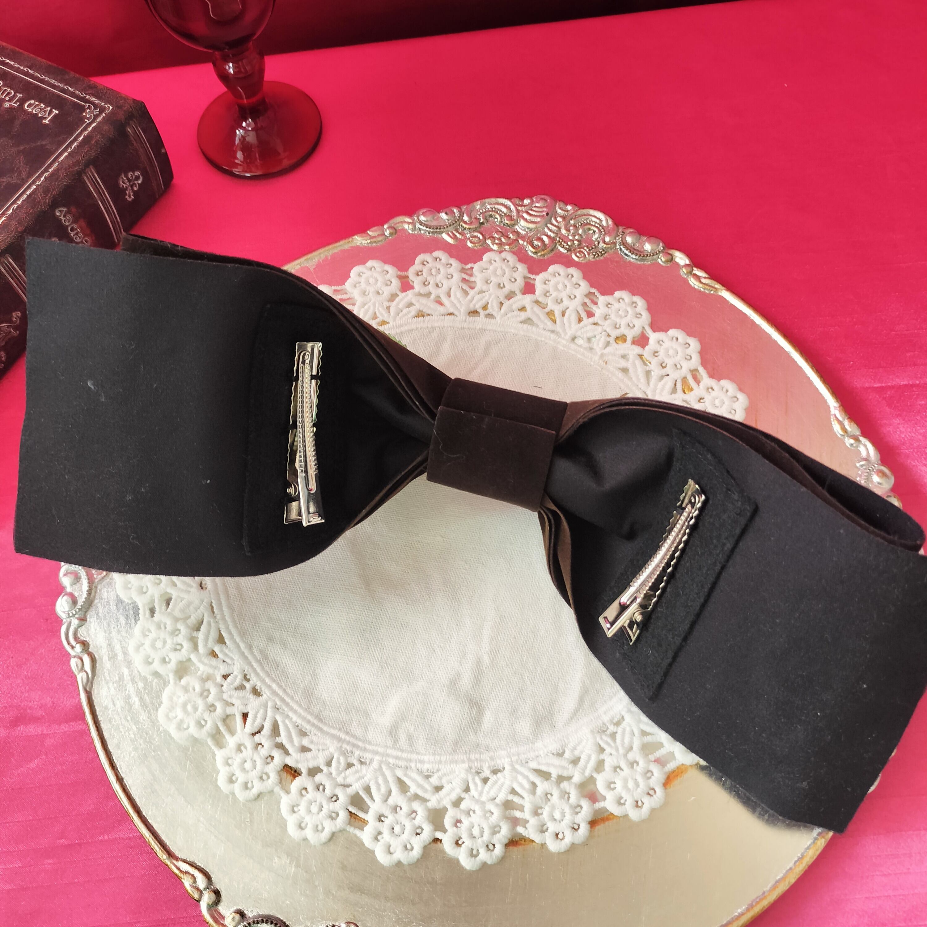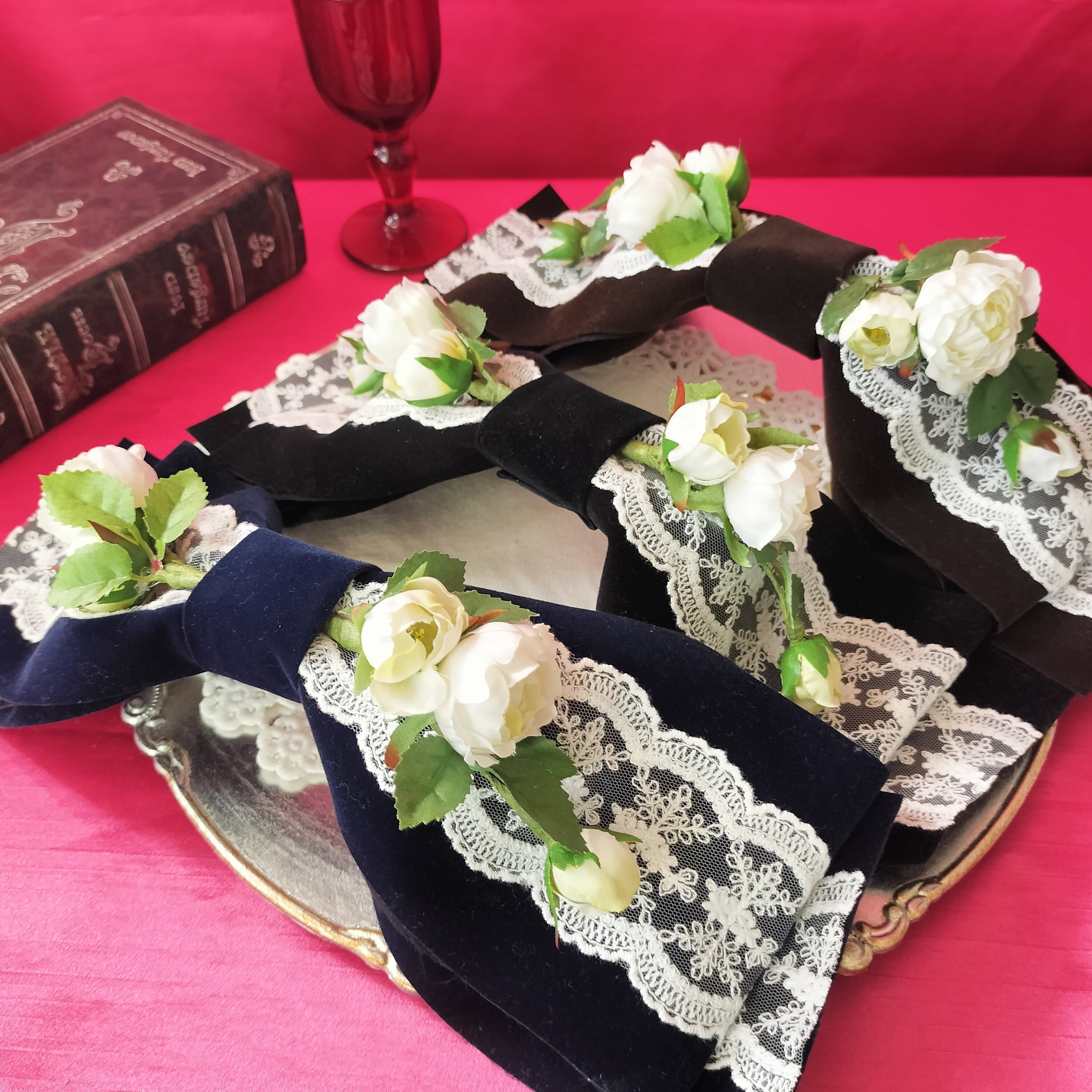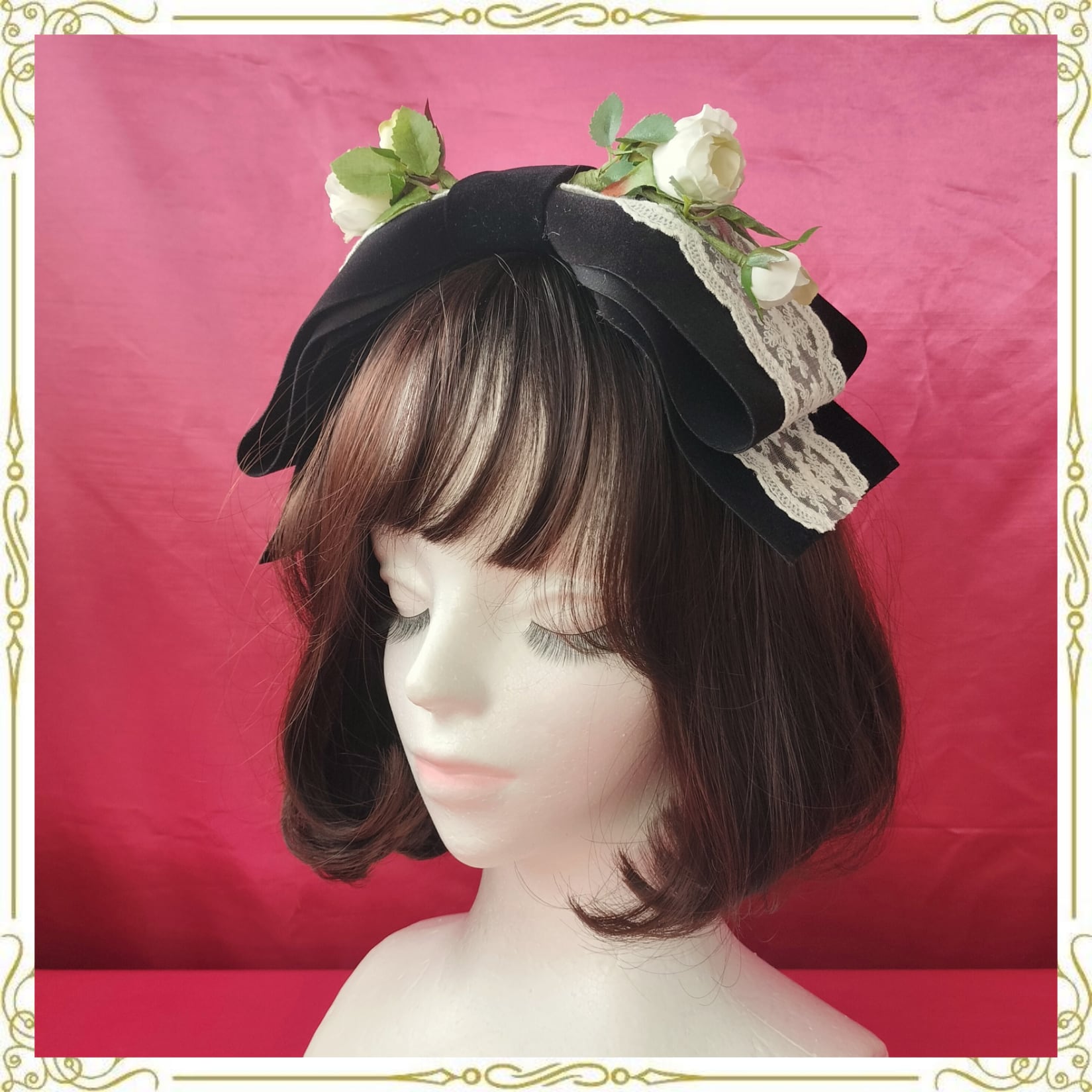 大きなベロアのリボンに美しい白薔薇をあしらったヘッドドレス