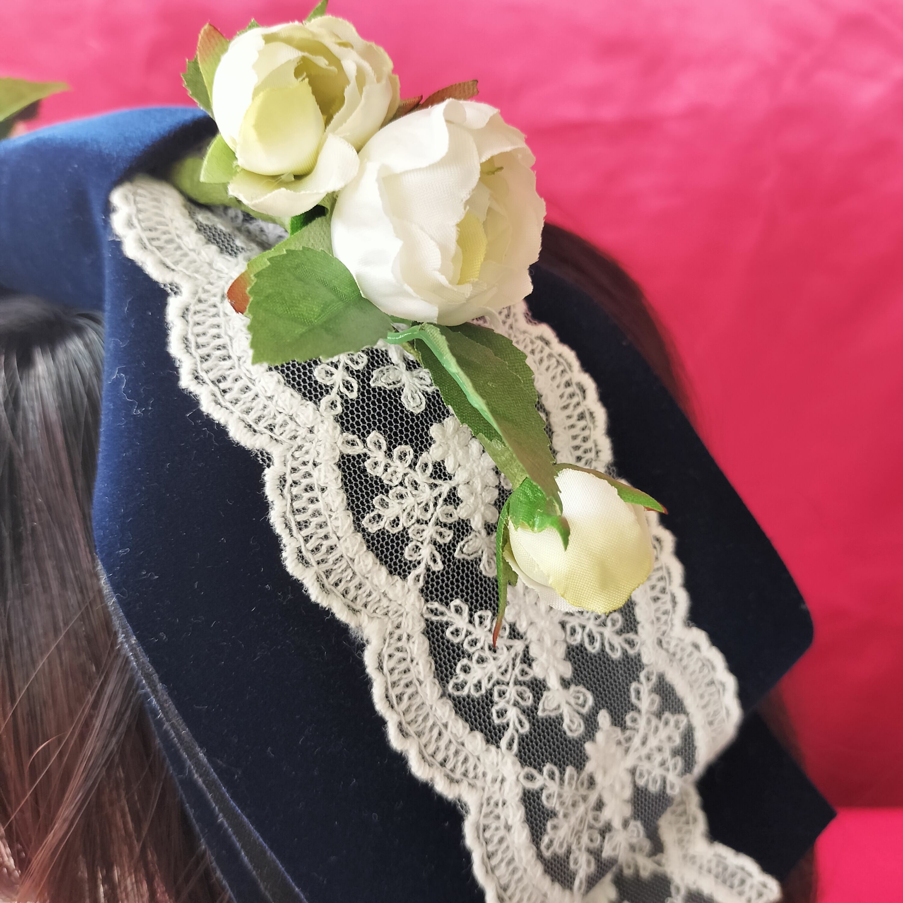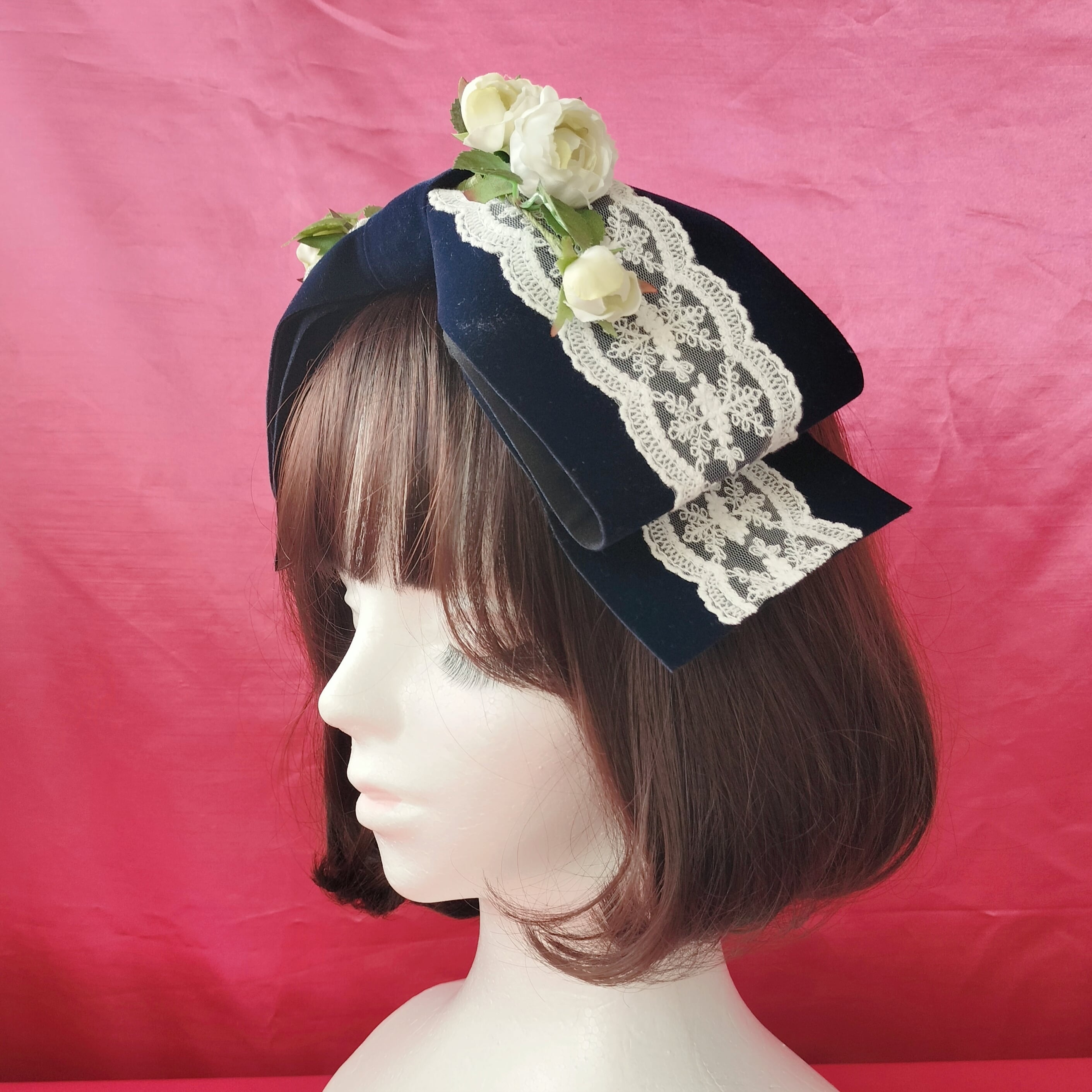 大きなベロアのリボンに美しい白薔薇をあしらったヘッドドレス