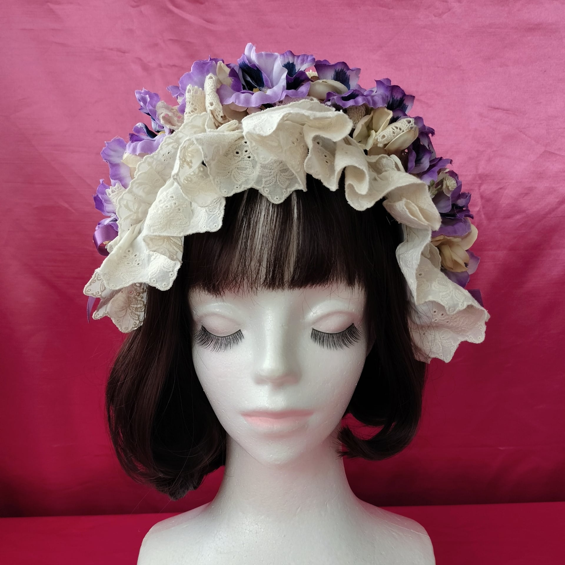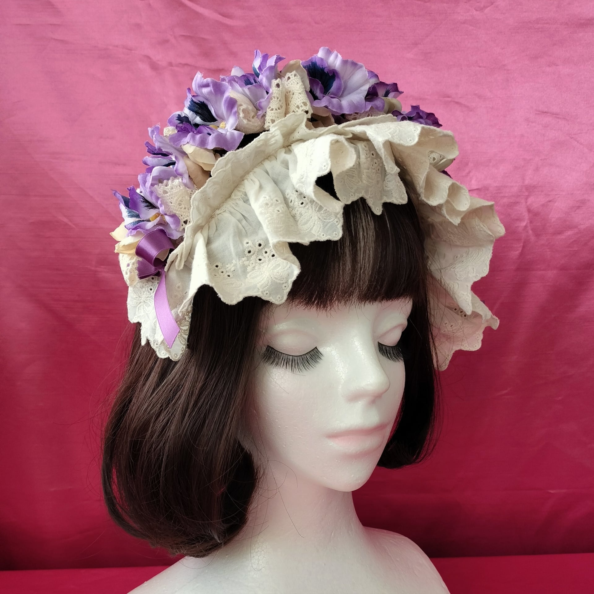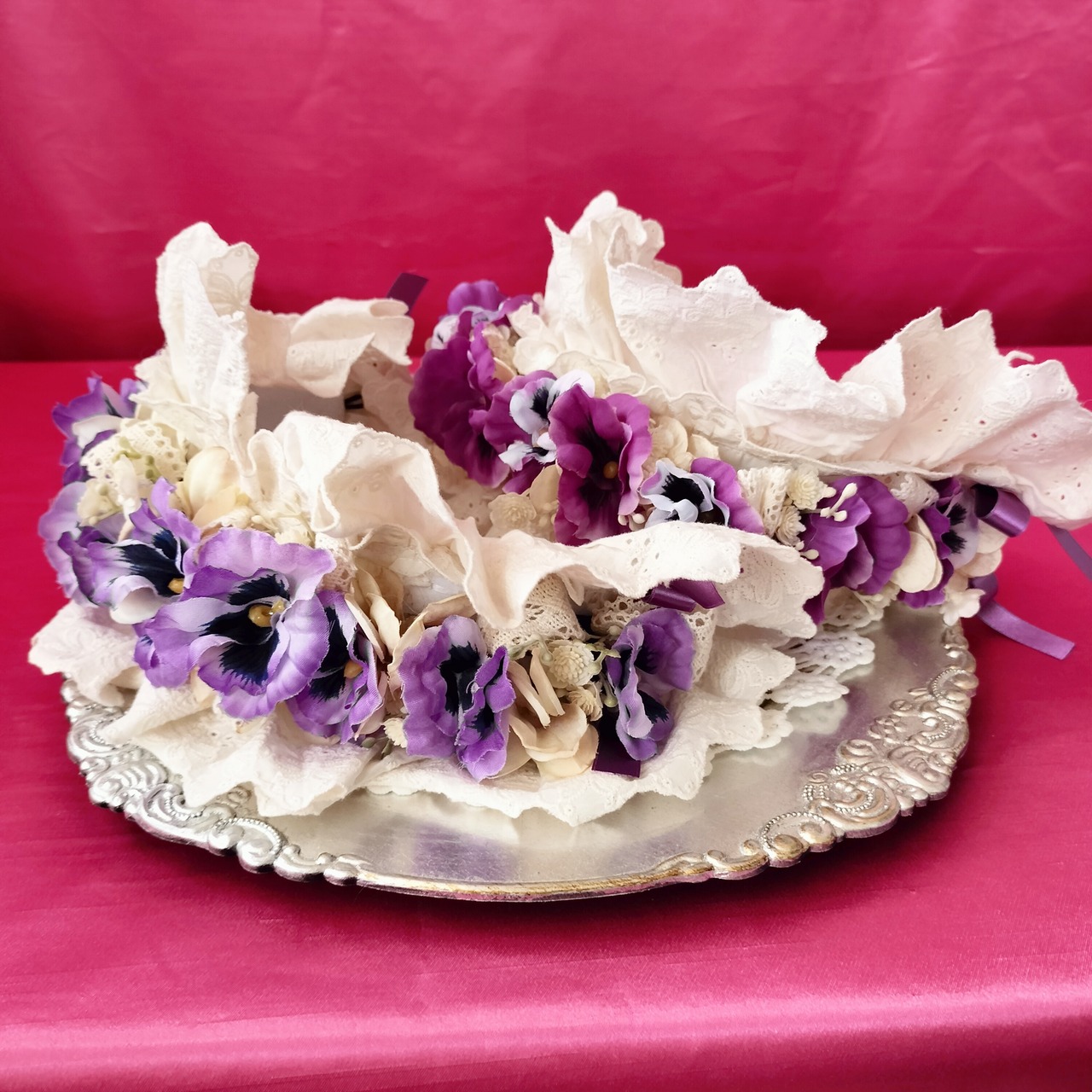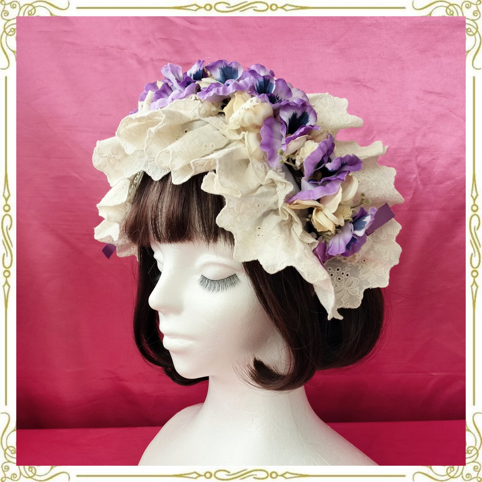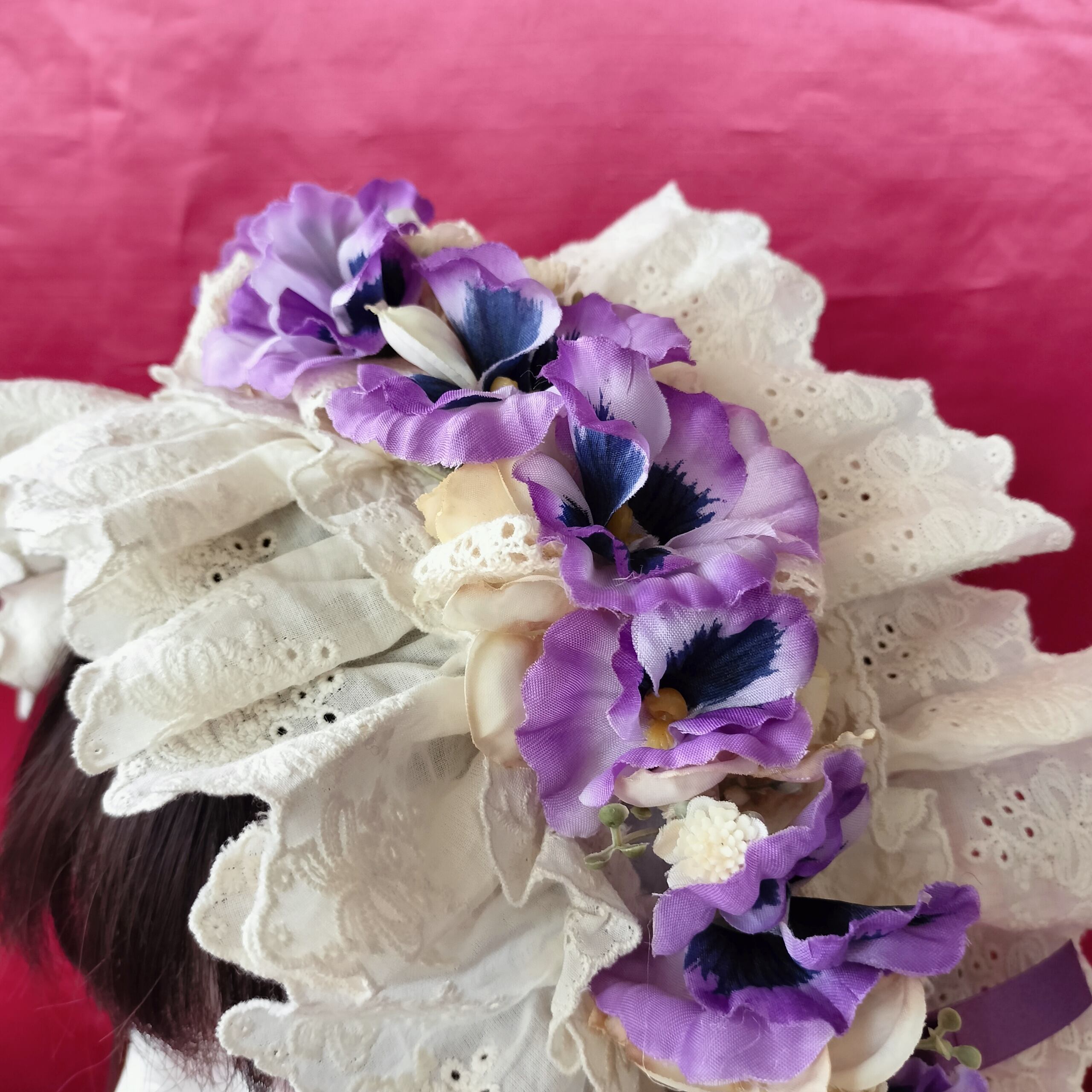 パンジーとレースやリボンを纏めたヘッドドレス