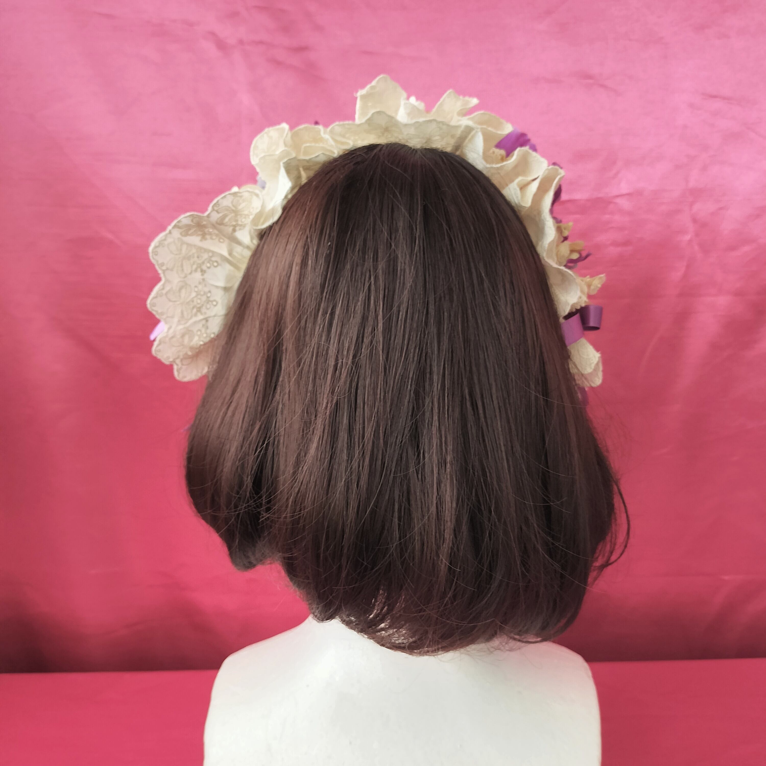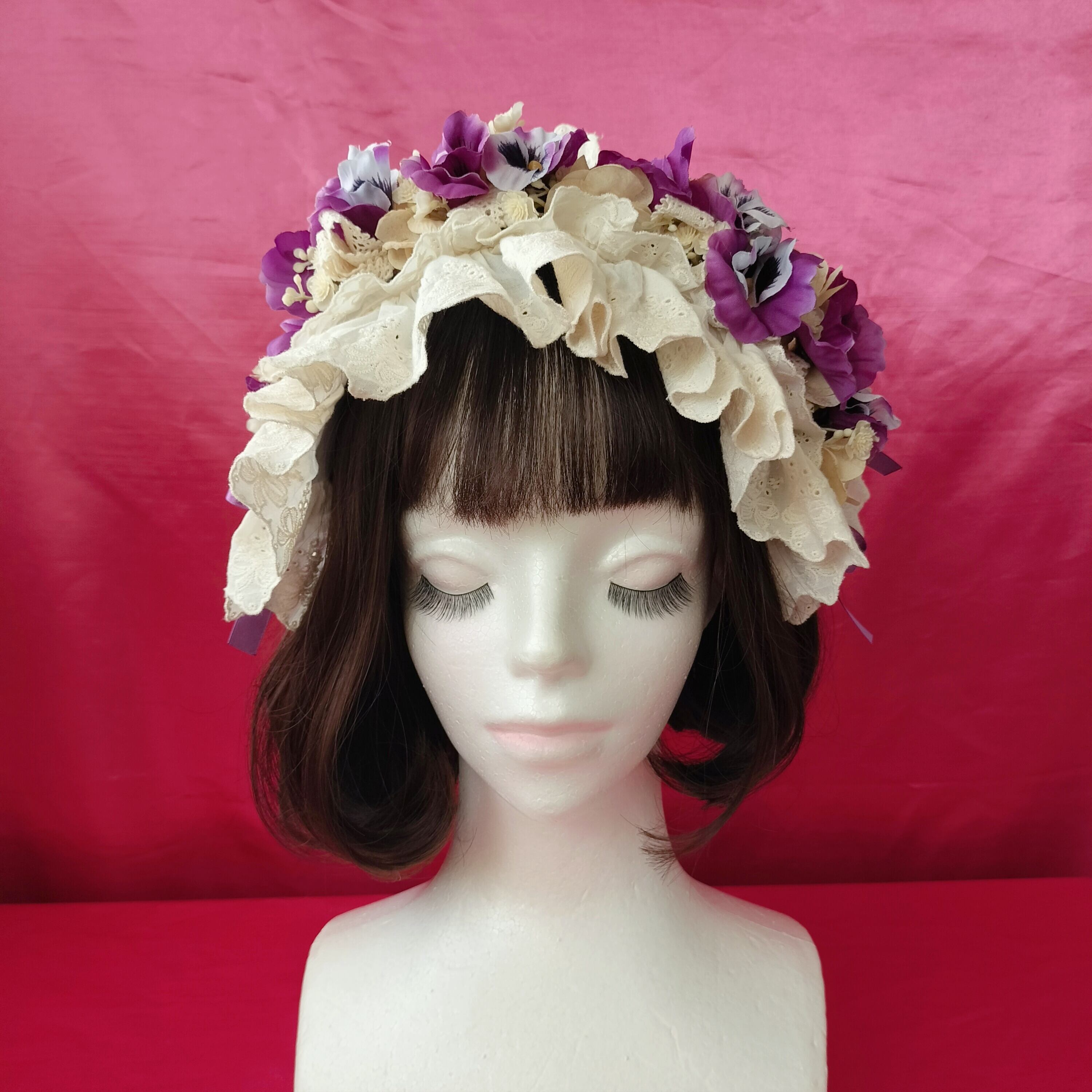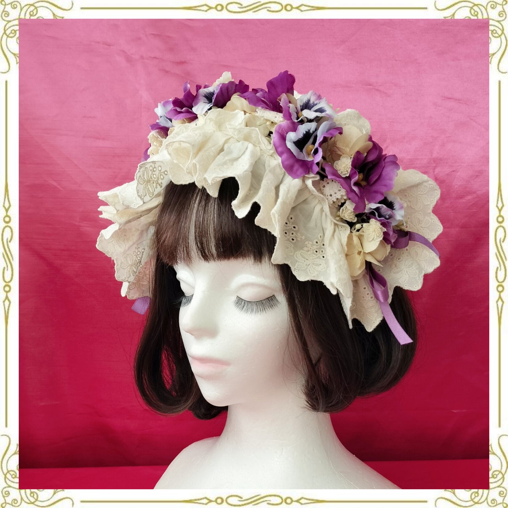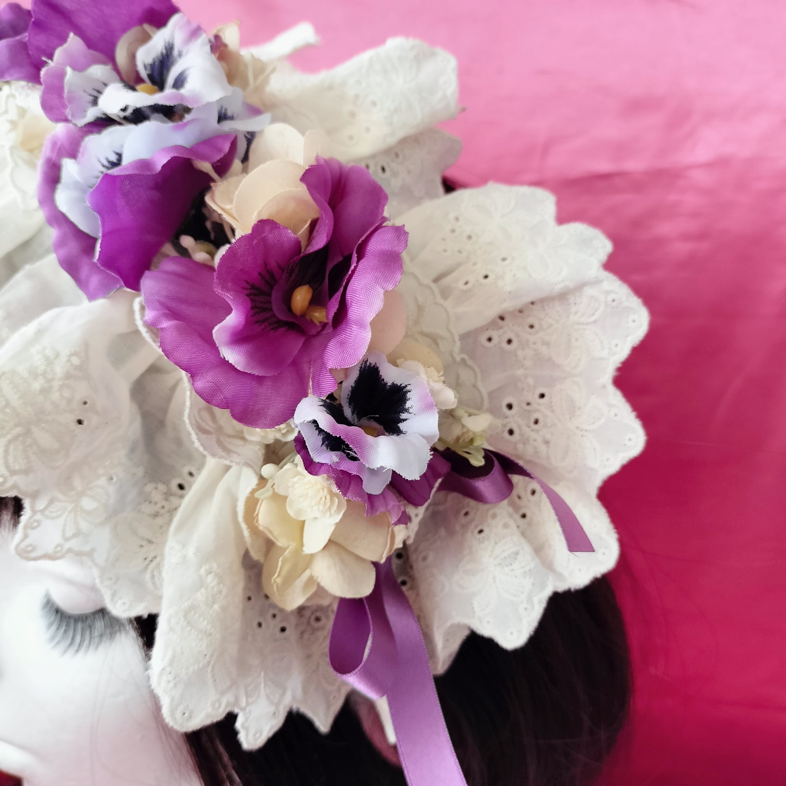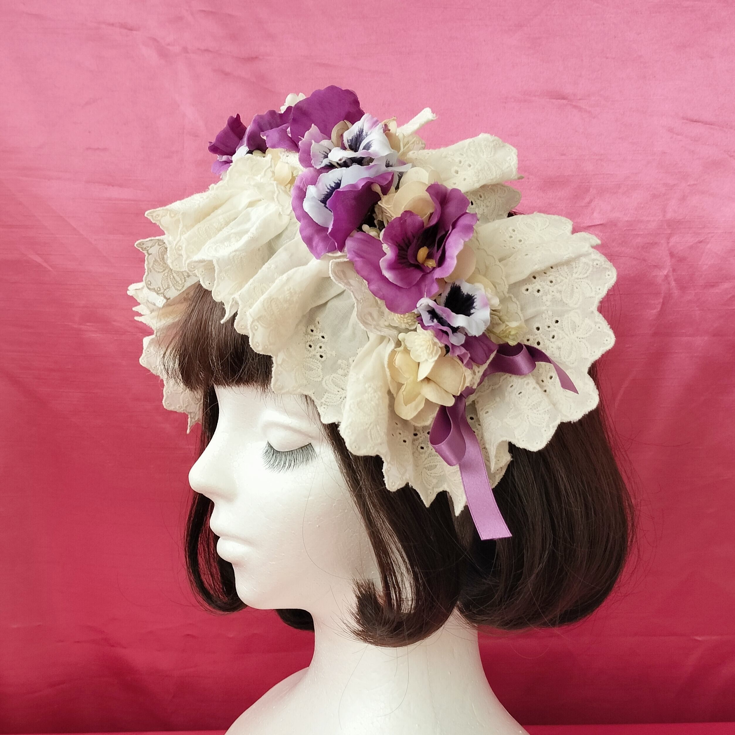パンジーとレースやリボンを纏めたヘッドドレス