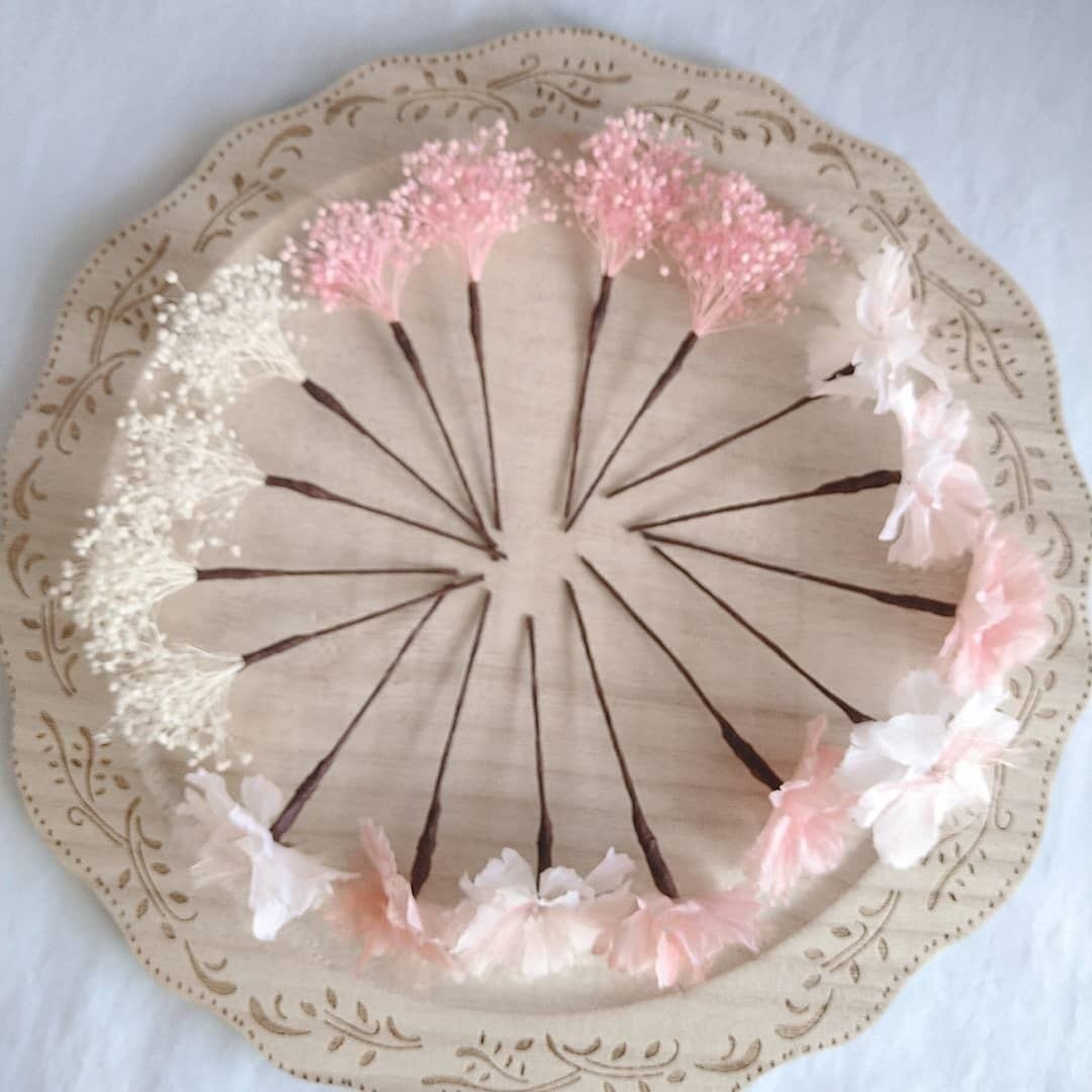 白とピンク2色のかすみ草を 各4本づつ使用しています。