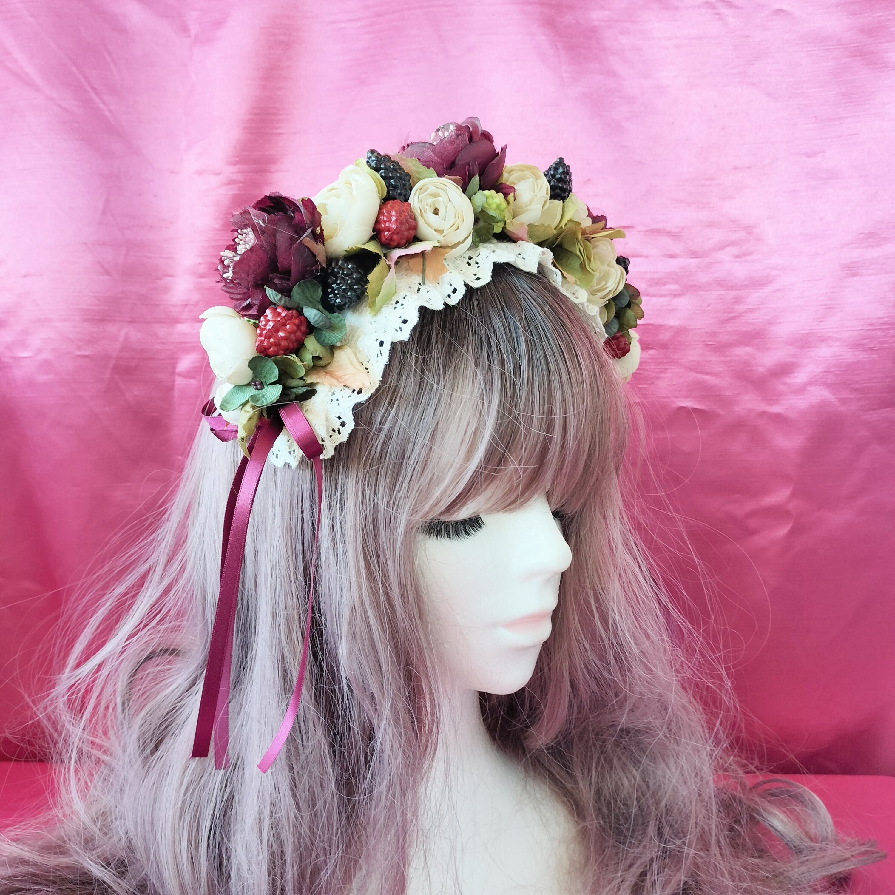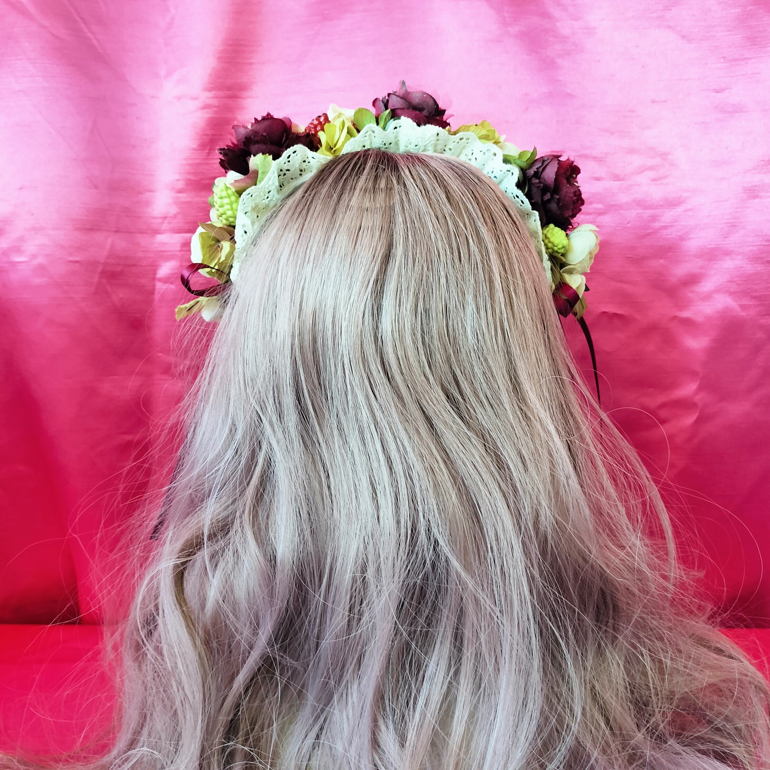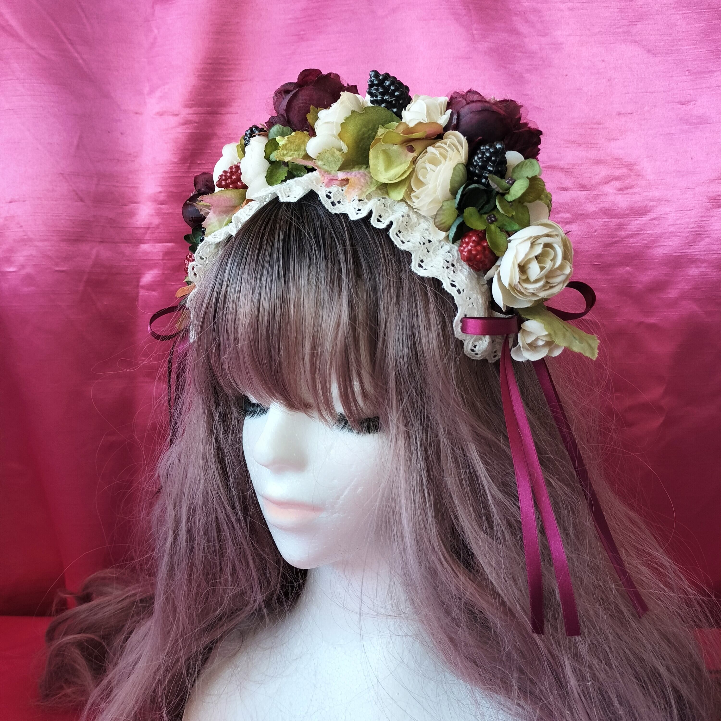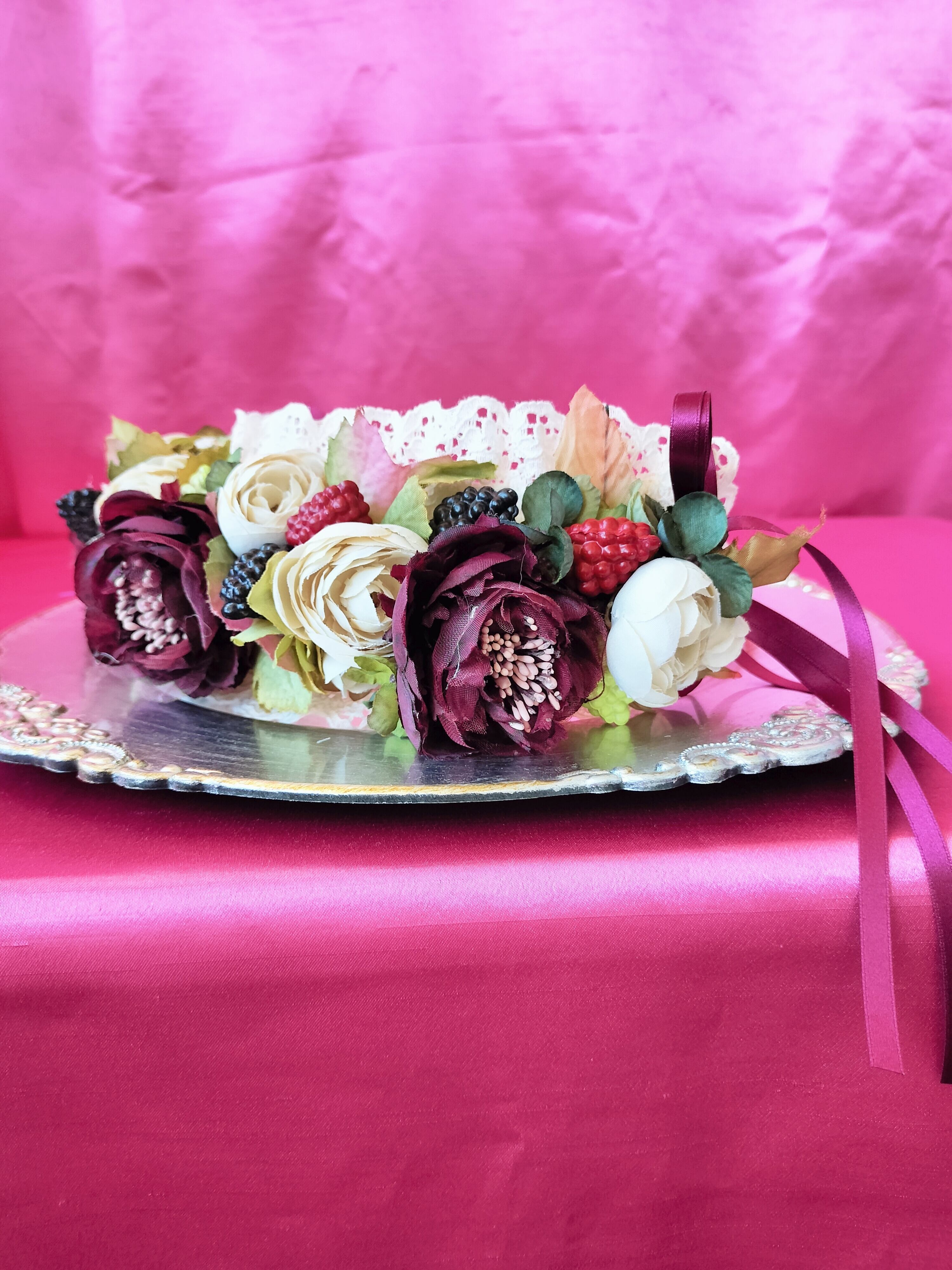 アイボリーとボルドーの薔薇にラズベリーをあしらい アンティークなレースを使用しお作りしています。