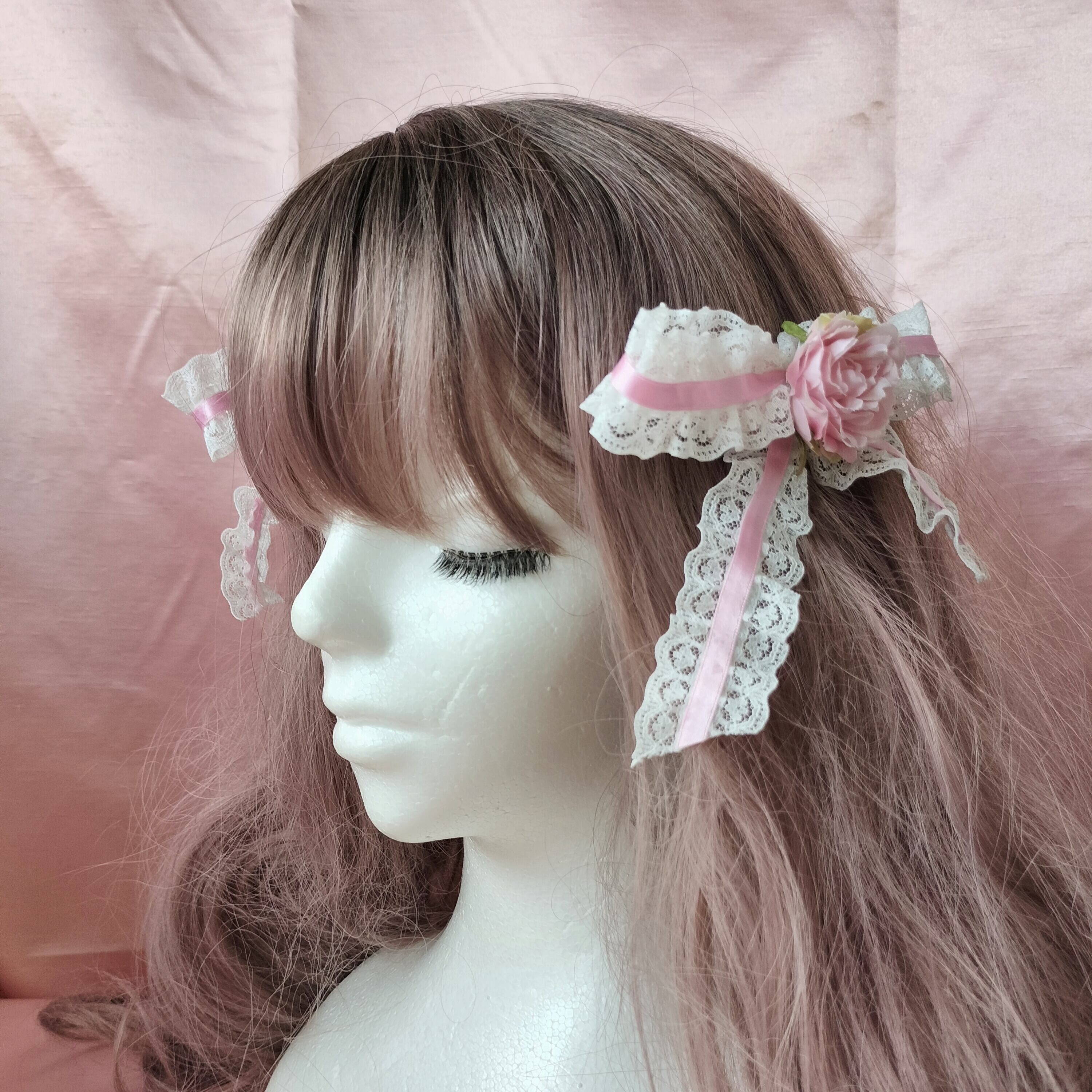 ピンクの薔薇とレースのおリボンが可愛い髪飾り (2個で1組です)