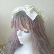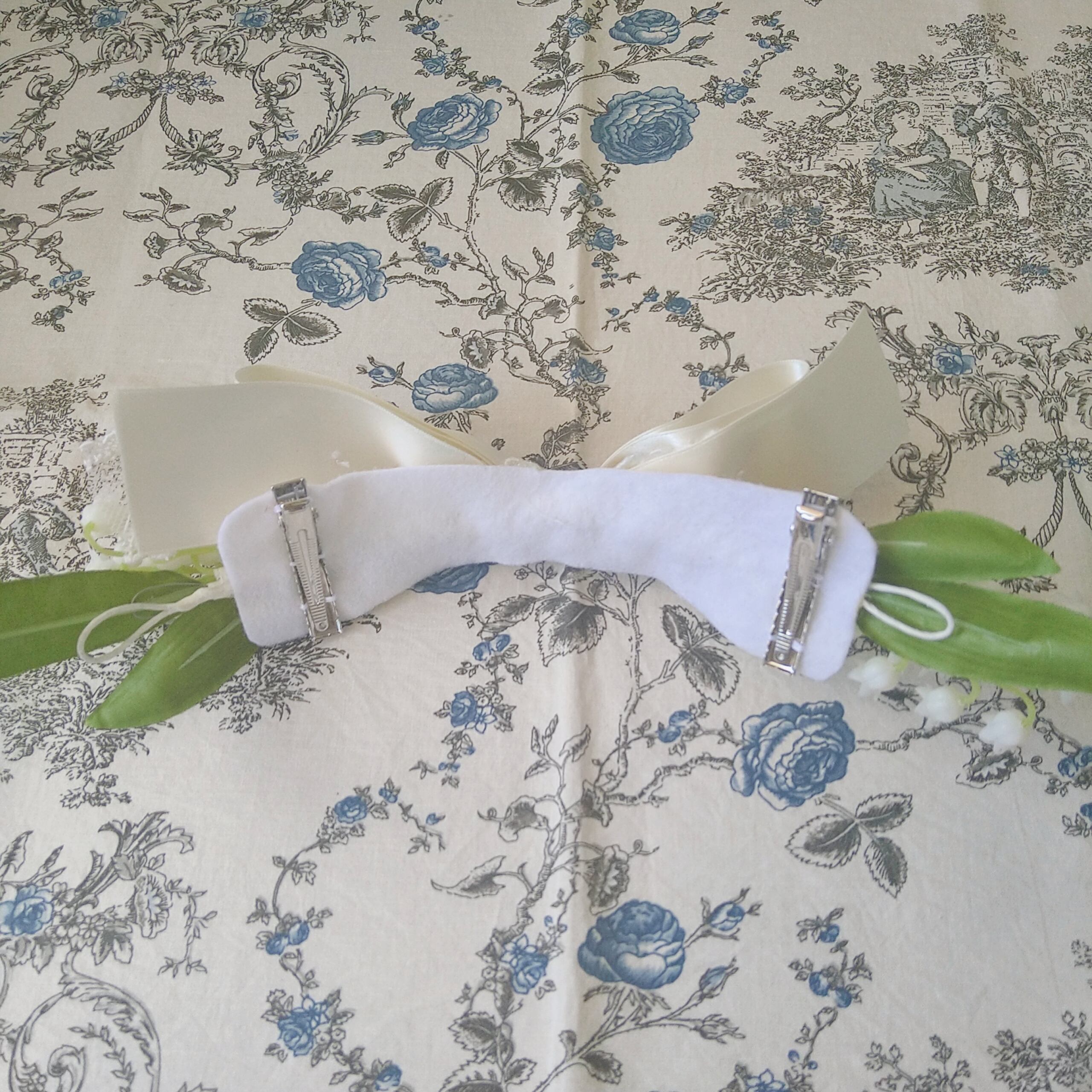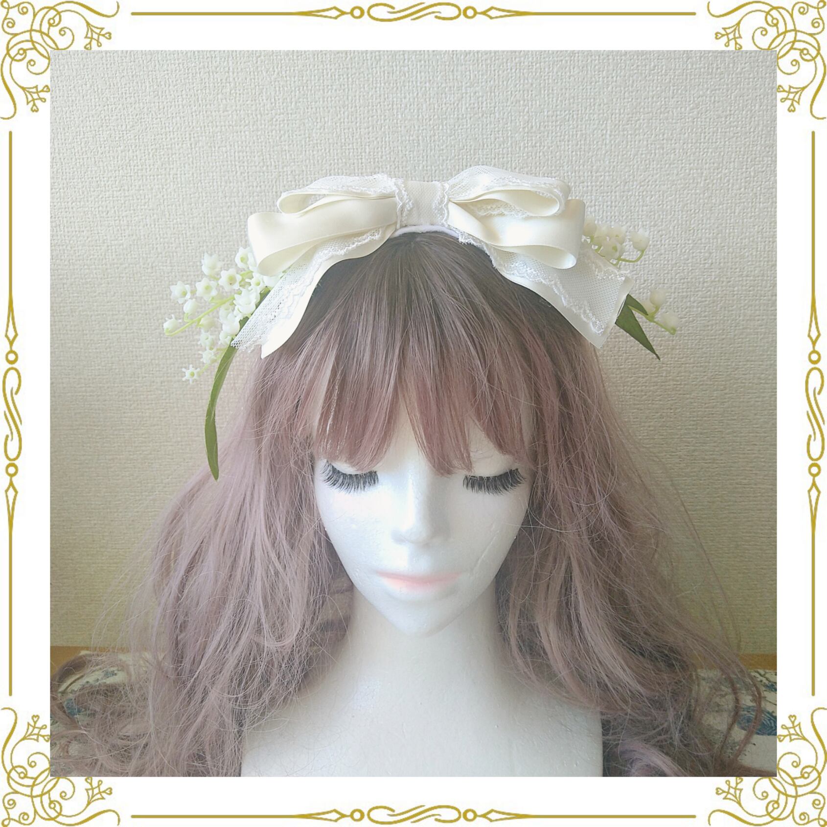 サイドのすずらんが可憐なヘッドドレス 生成りのリボンも相まって清楚な仕上がりです。