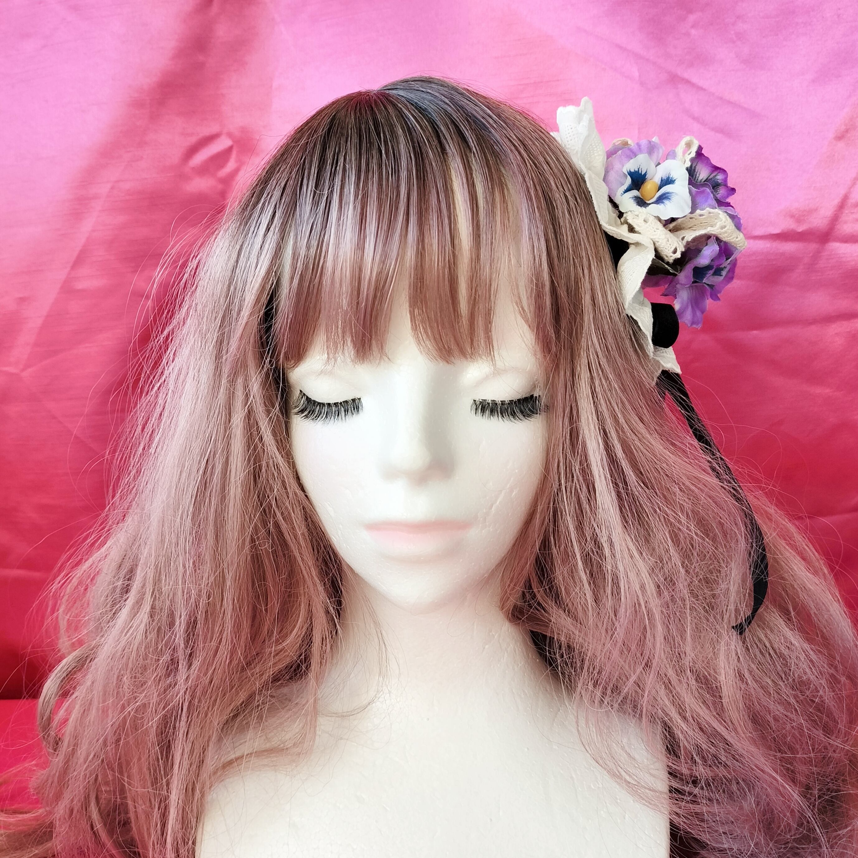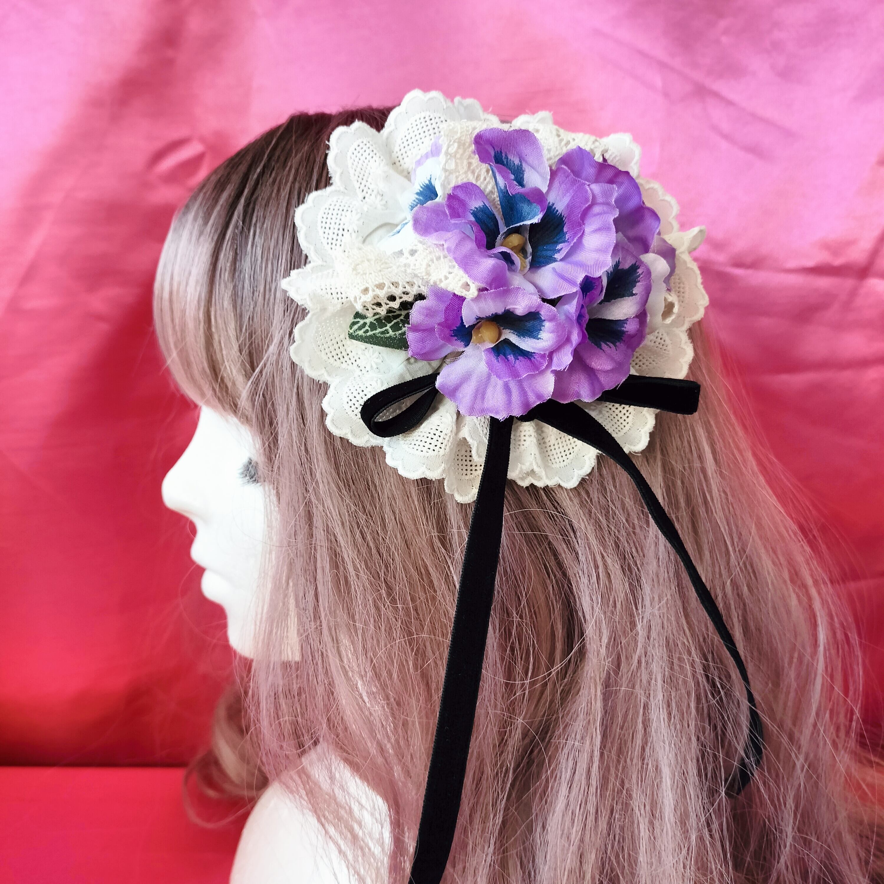 紫のパンジーと生成りのレースリボンでノスタルジックな午後をイメージした