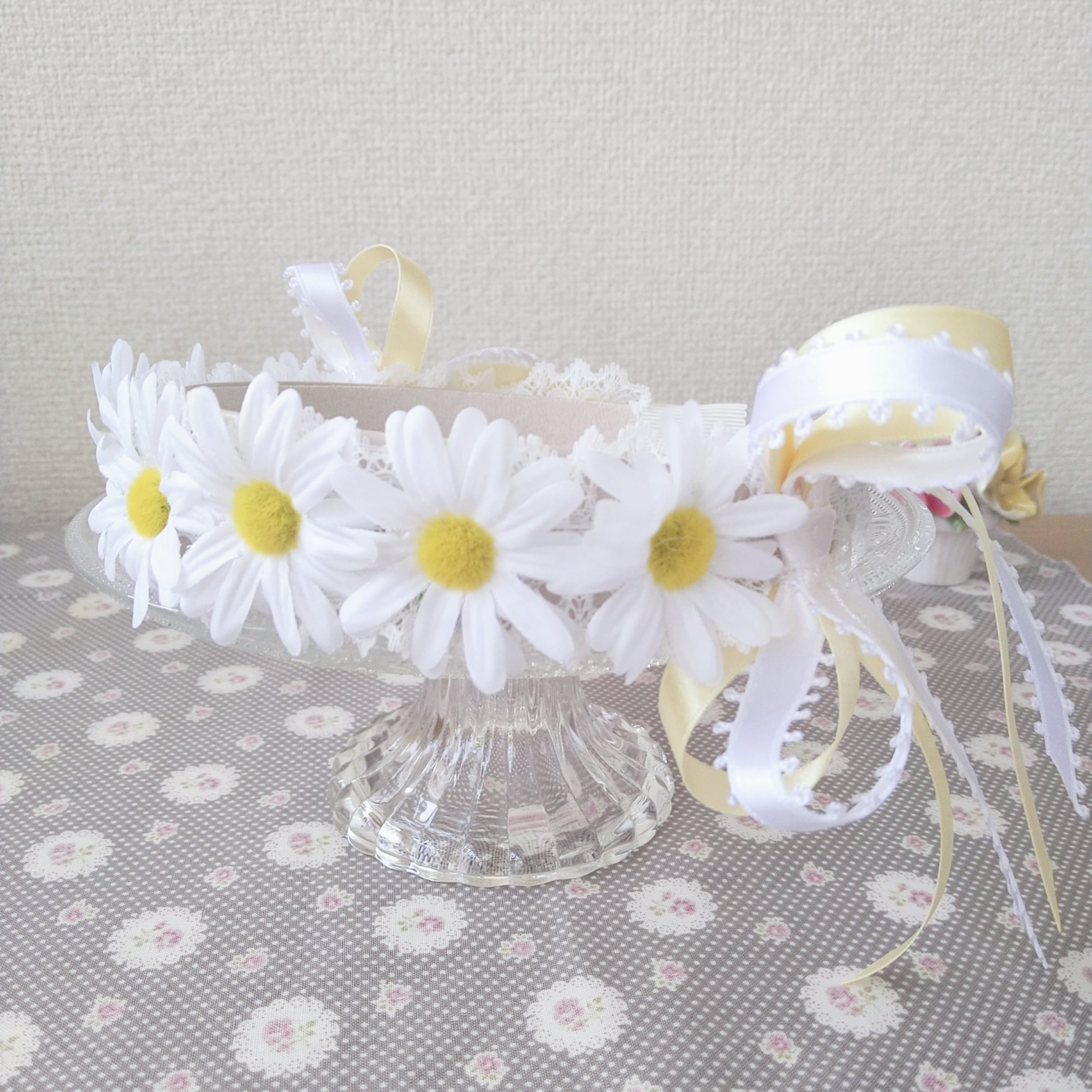 マーガレットをあしらった可憐なカチューシャサイドのリボンがポイントです。