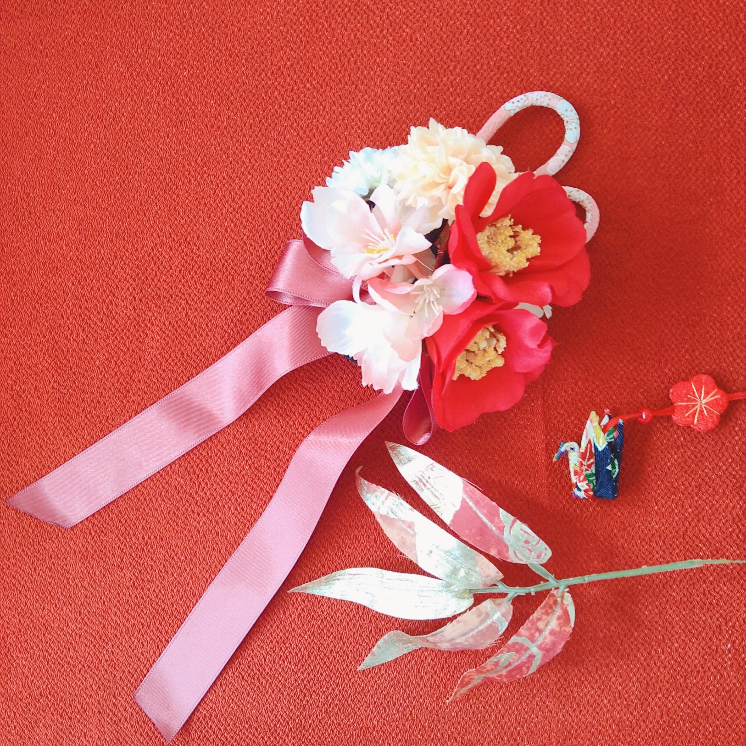 薄い紅色の和紐とリボンで凛とした椿の花を柔らかく華やかに仕上げました。