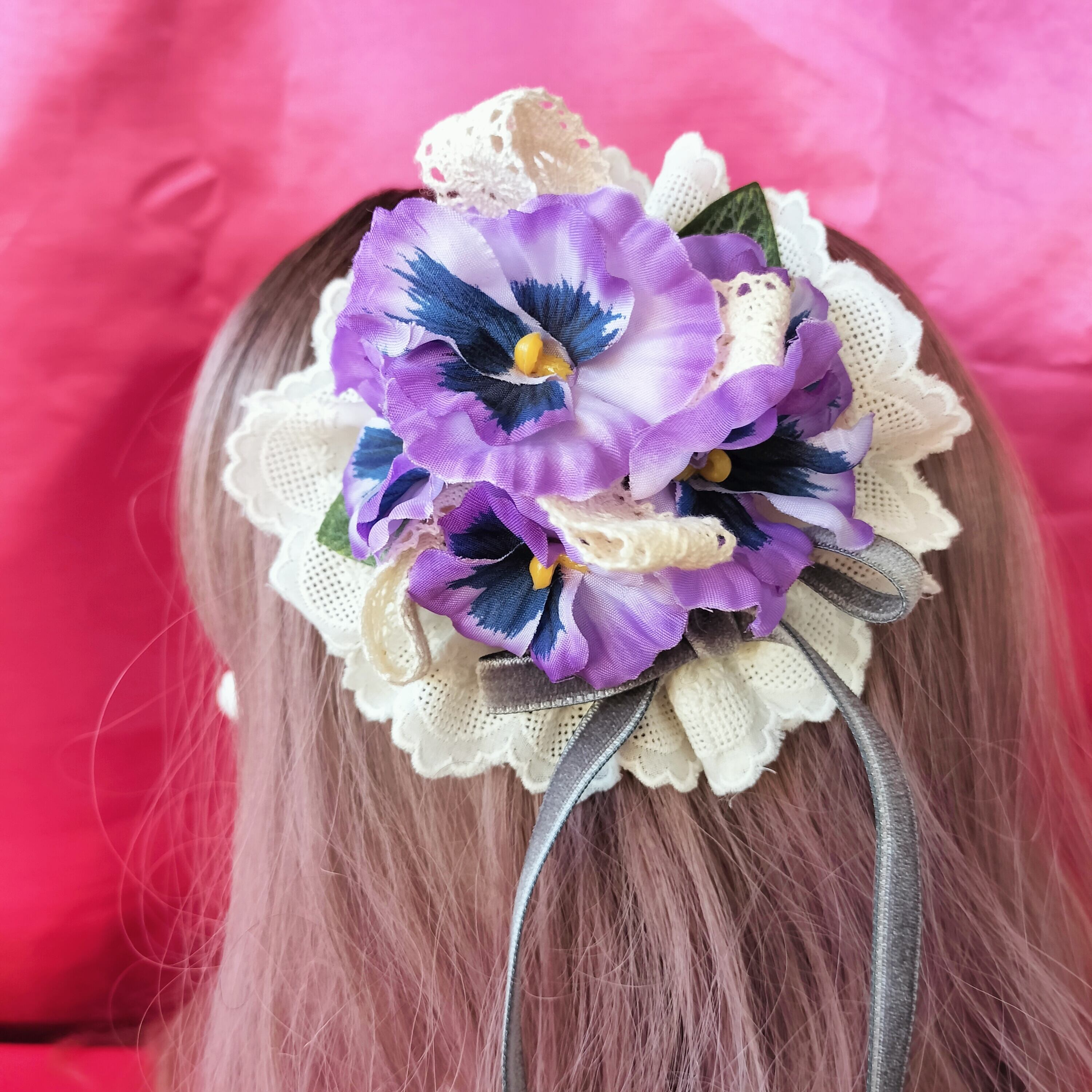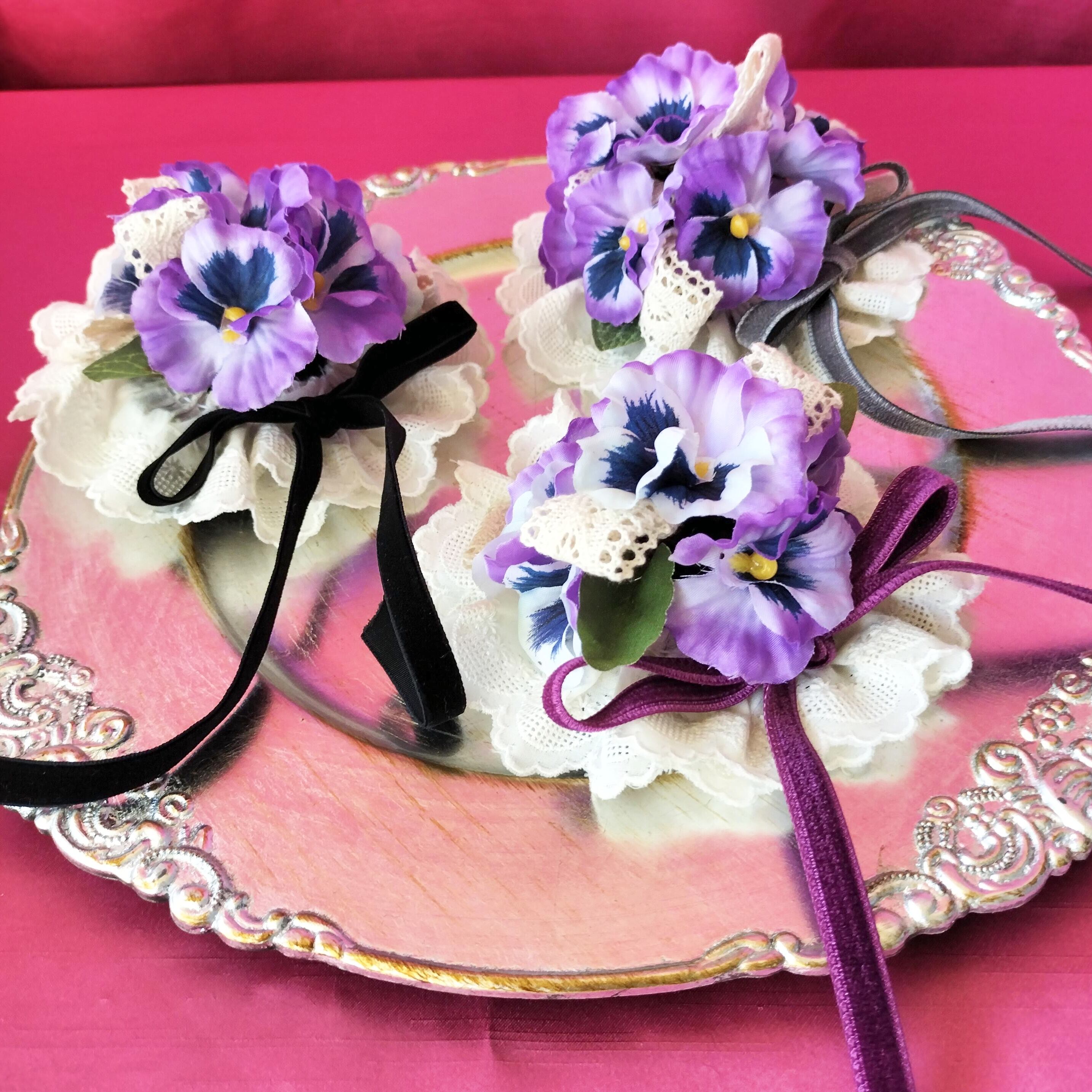 紫のパンジーと生成りのレースリボンでノスタルジックな午後をイメージした