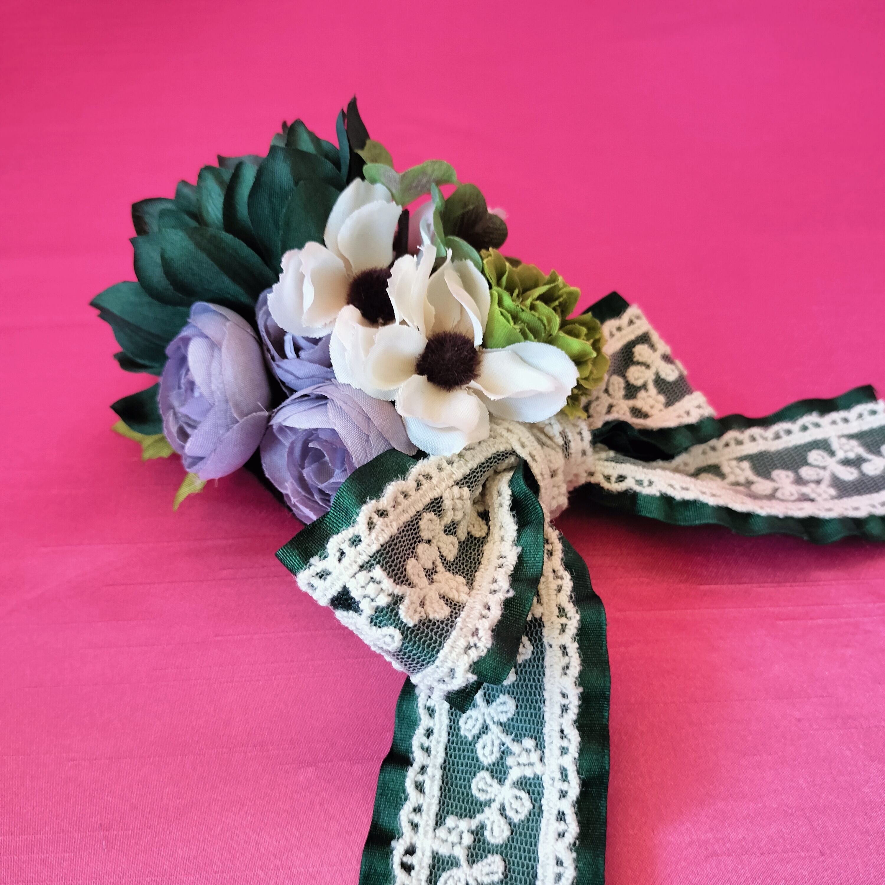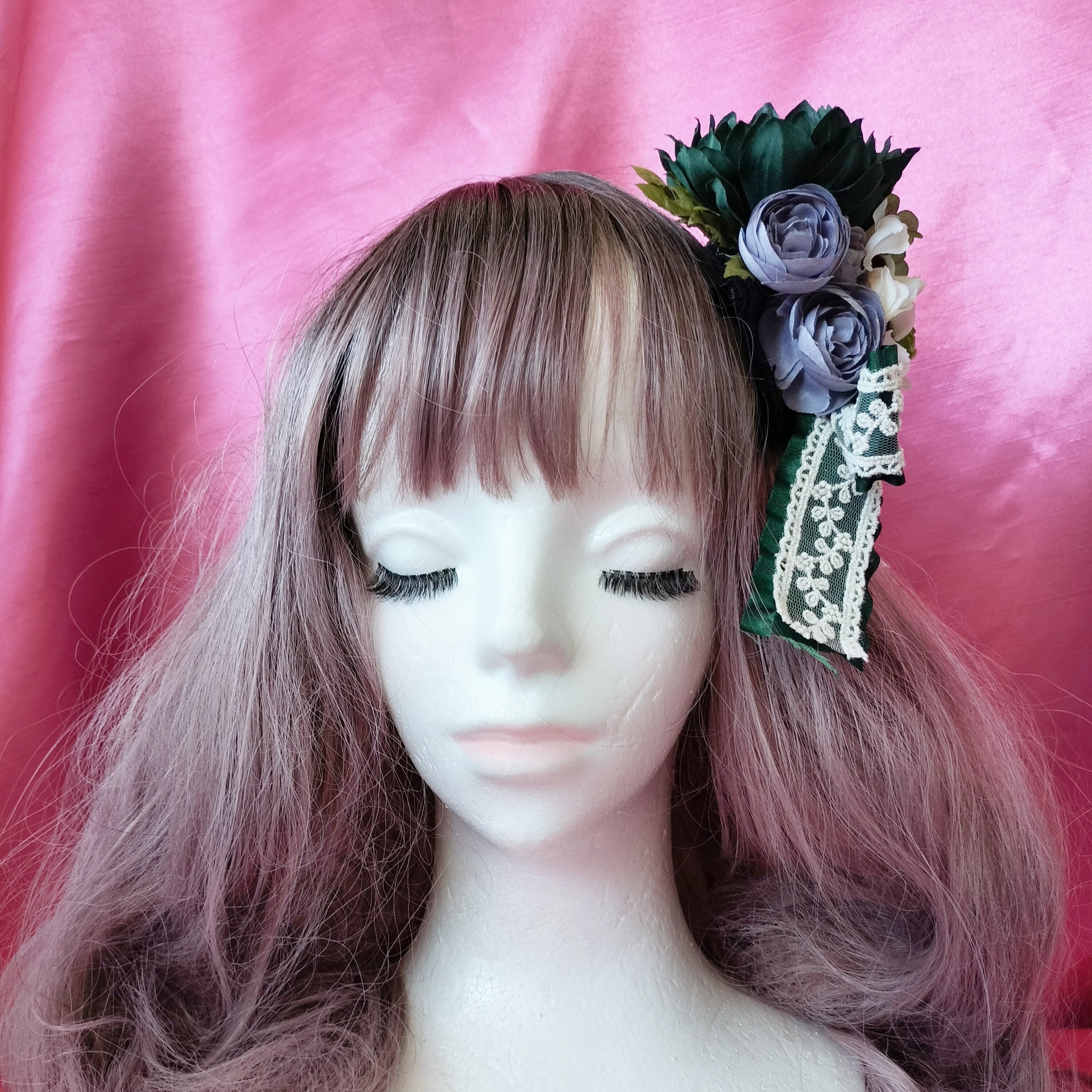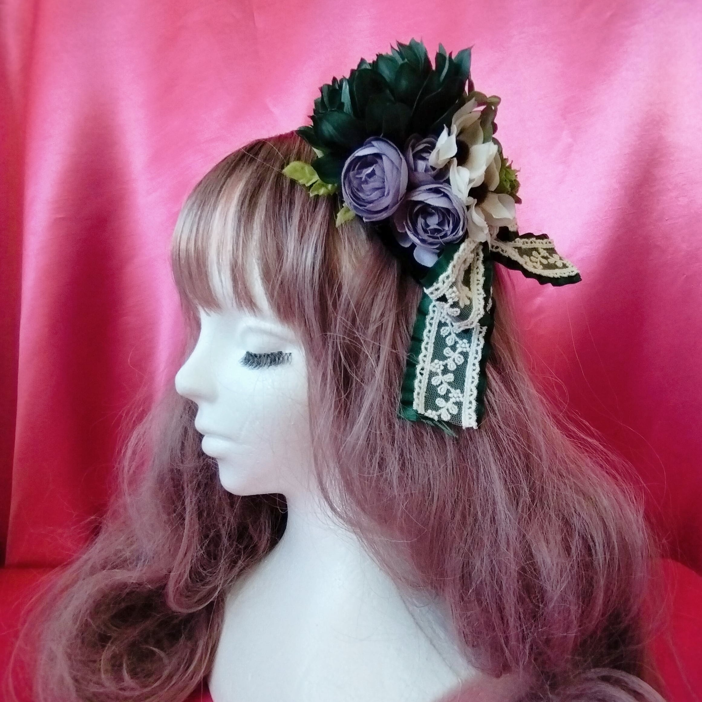 深い緑の芍薬とグレーの薔薇やアネモネ・小花を集めたヘッドドレス