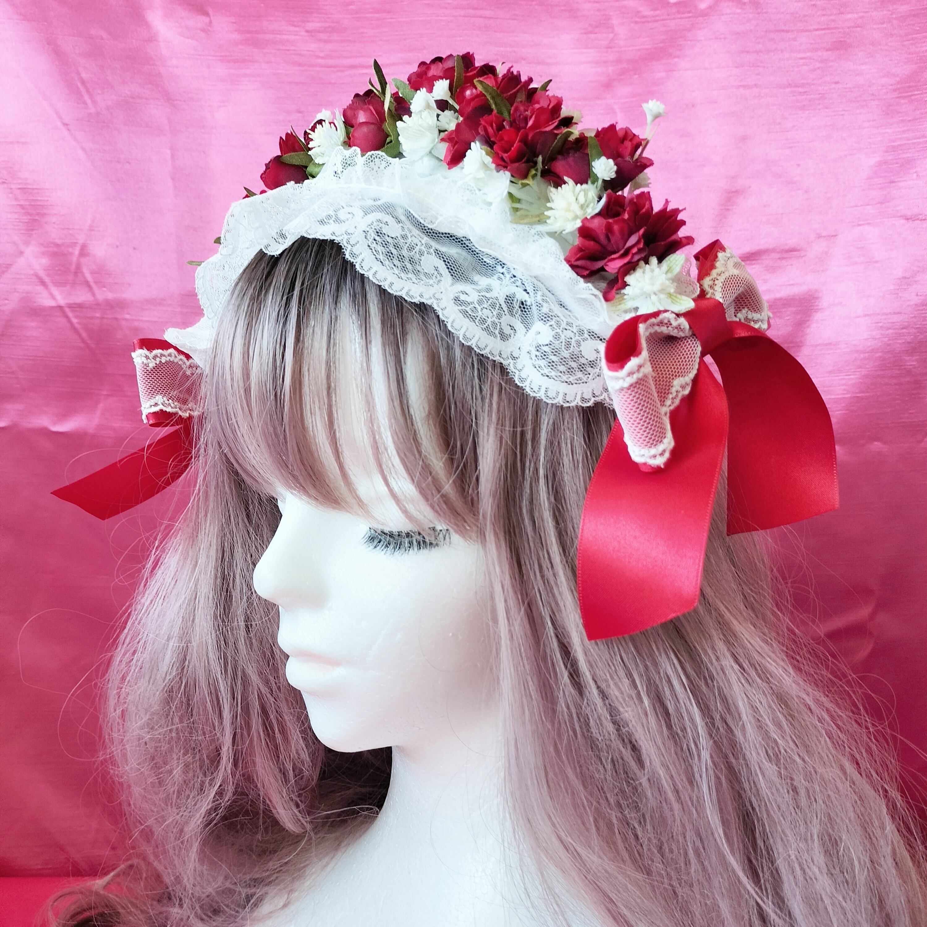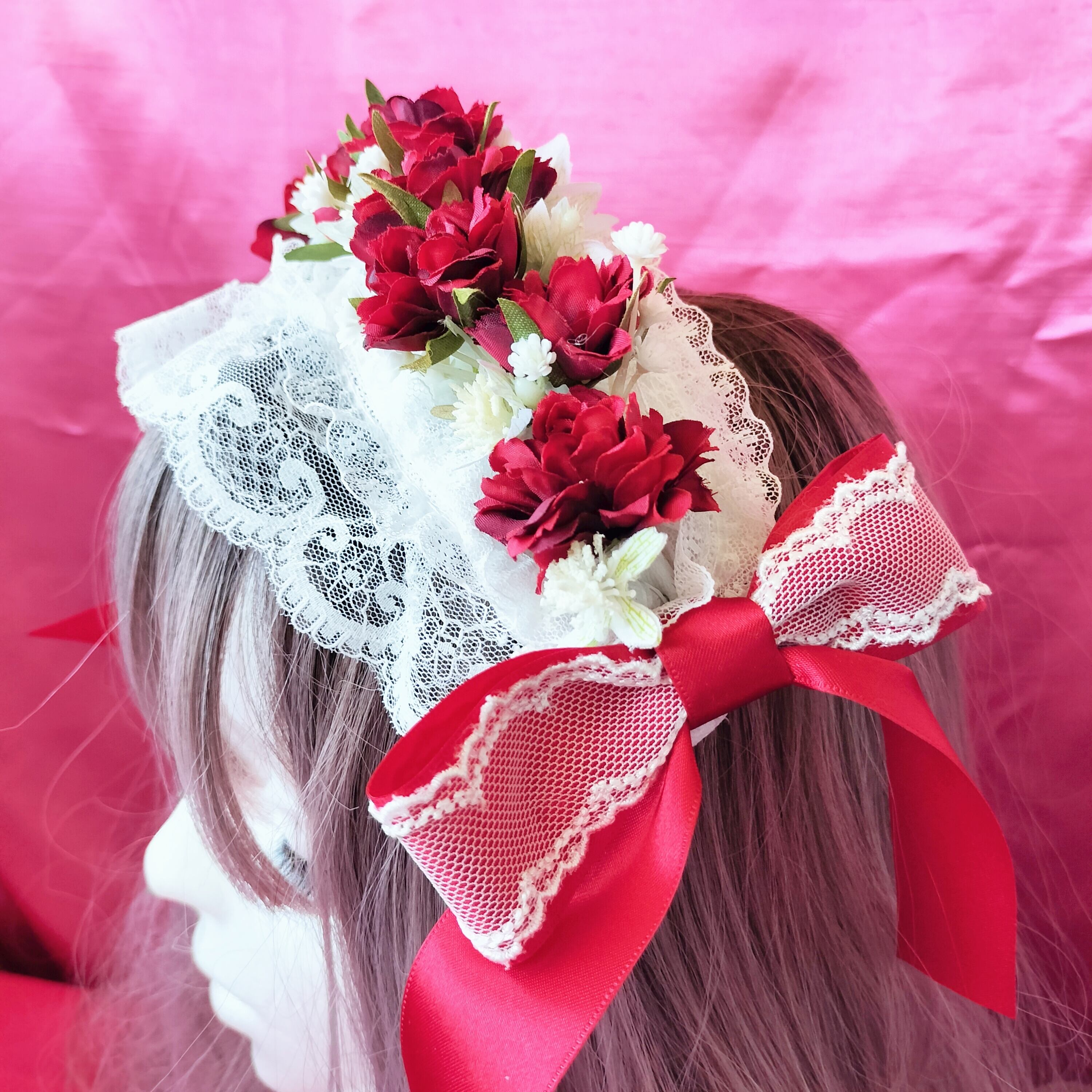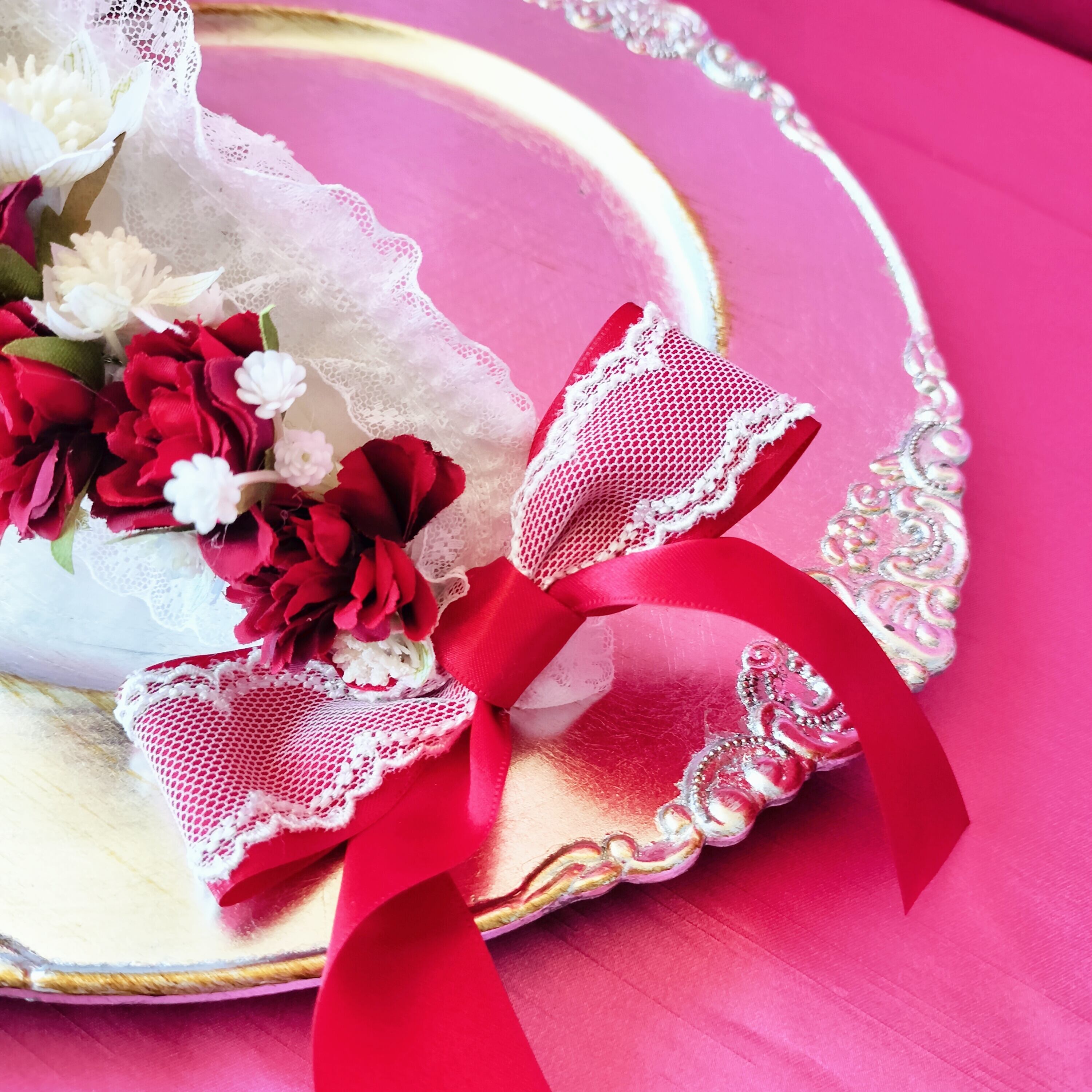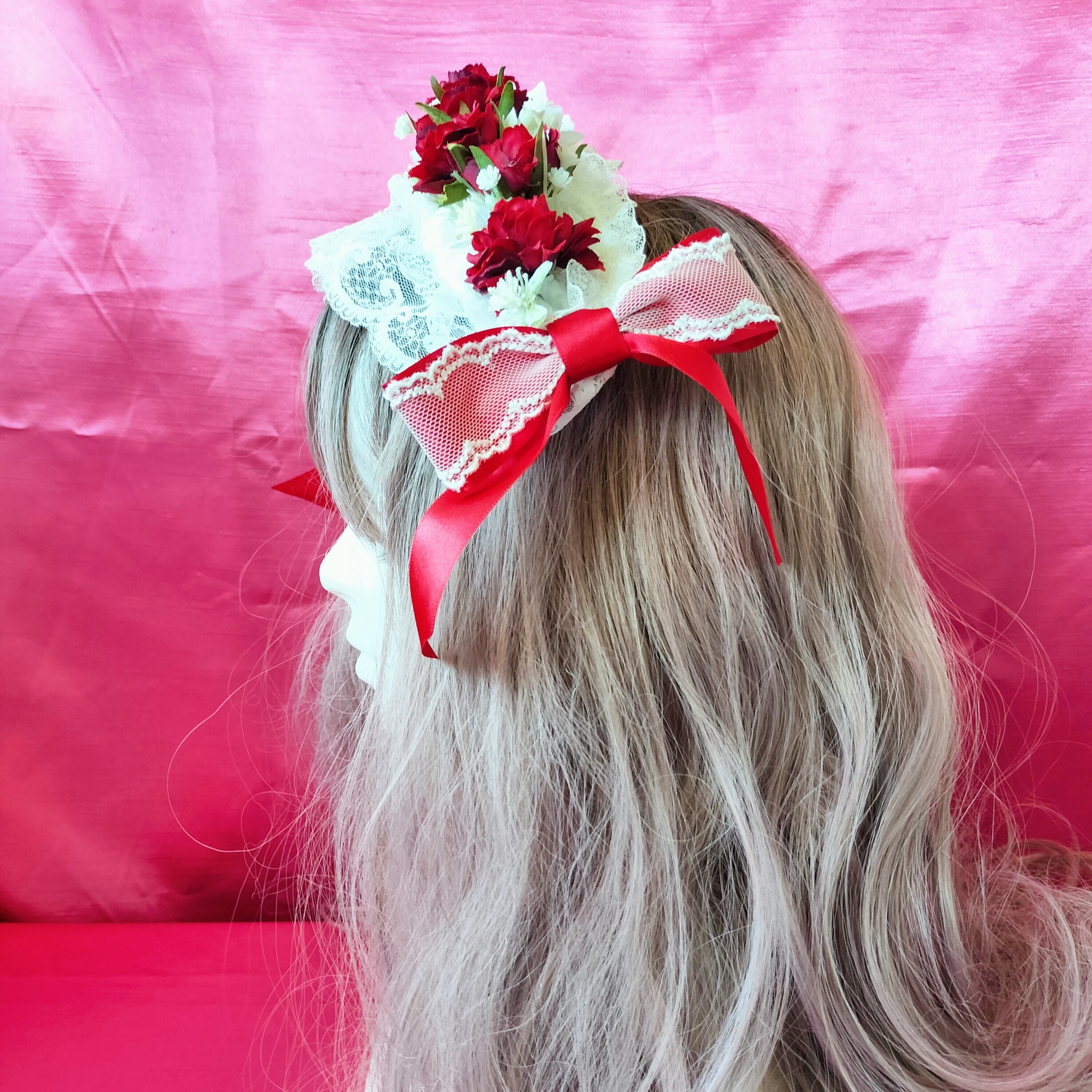 ふわっと柔らかなレースと赤いリボンで