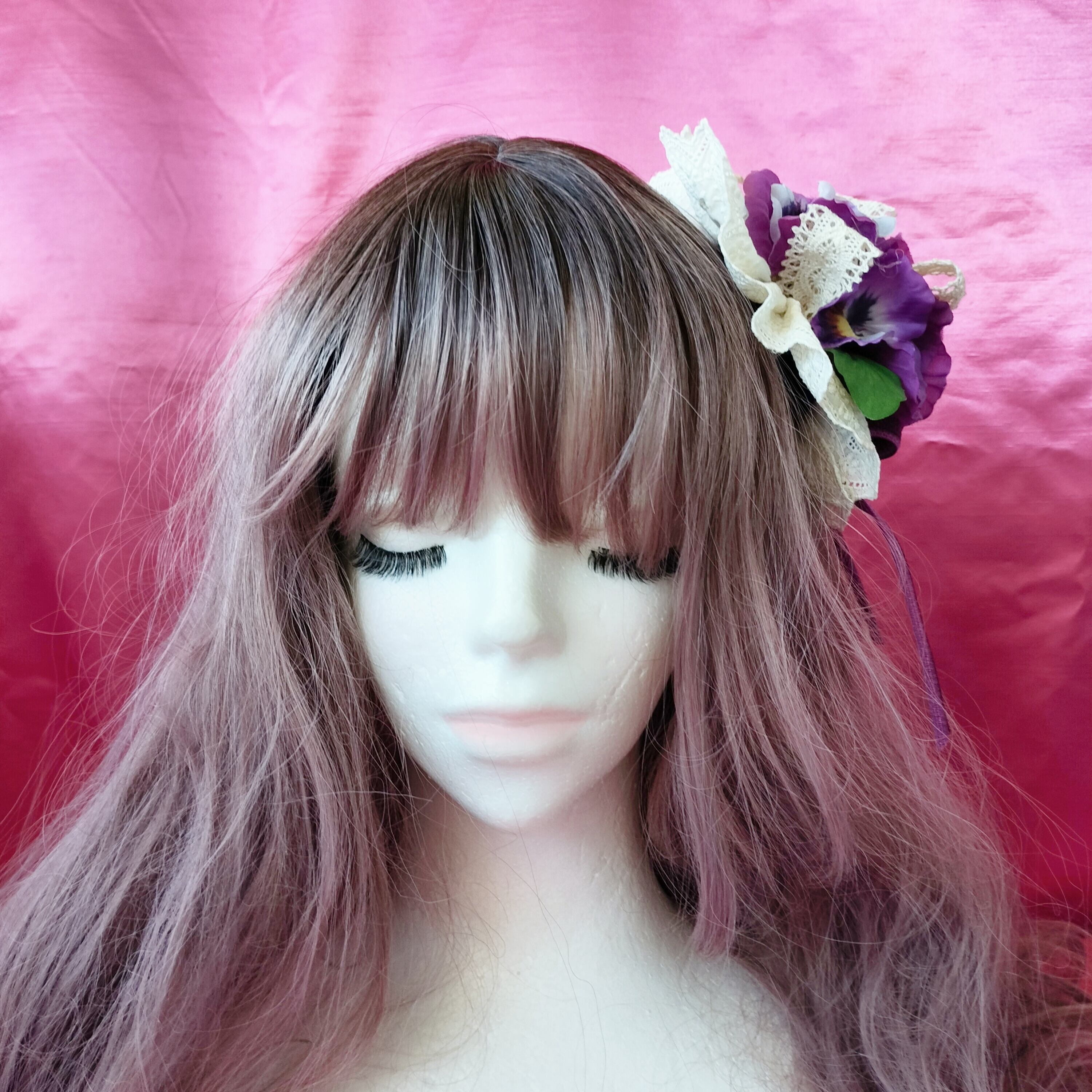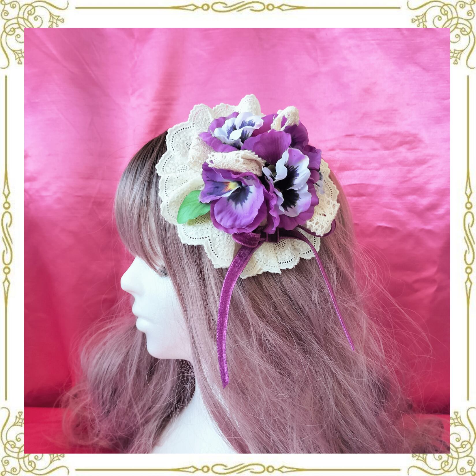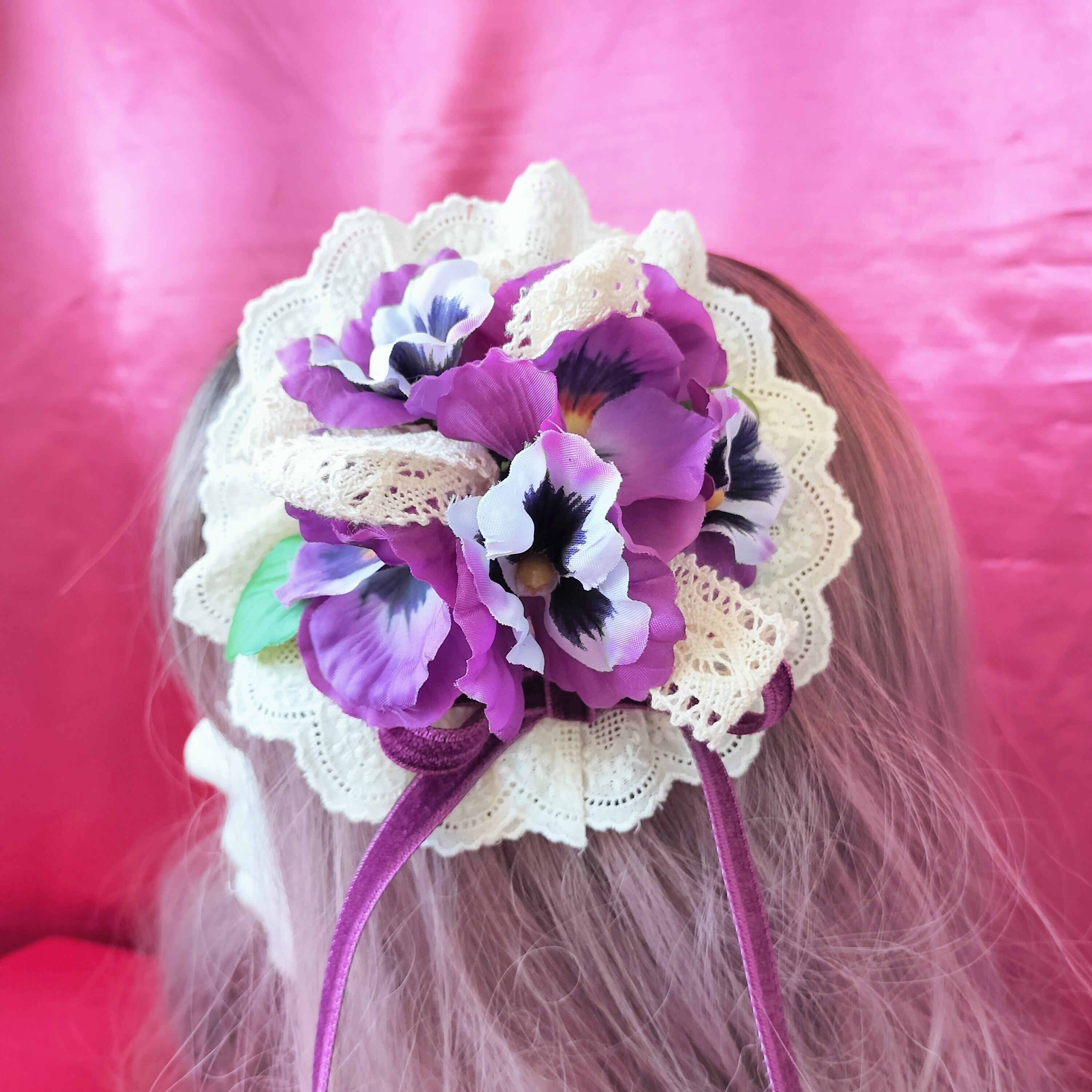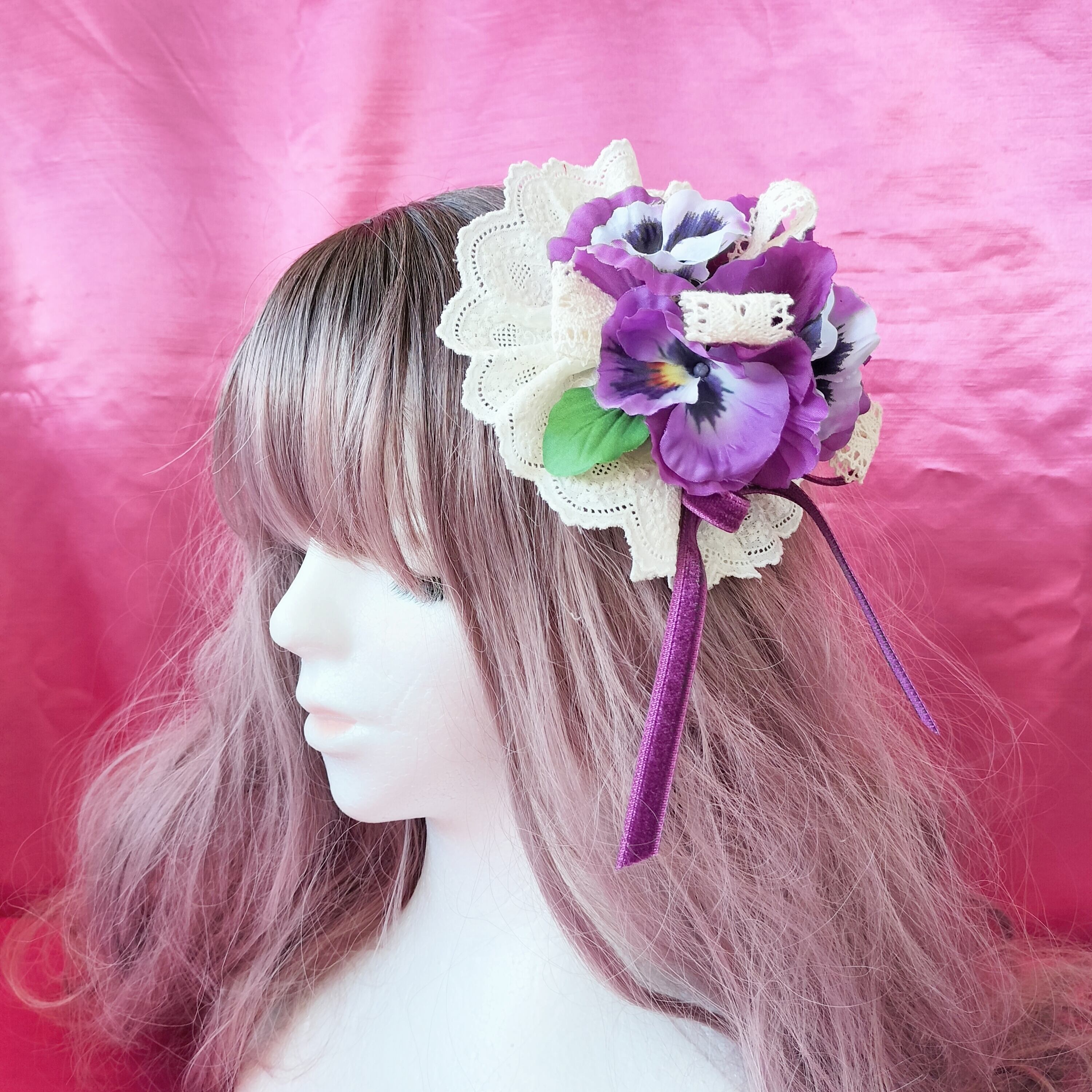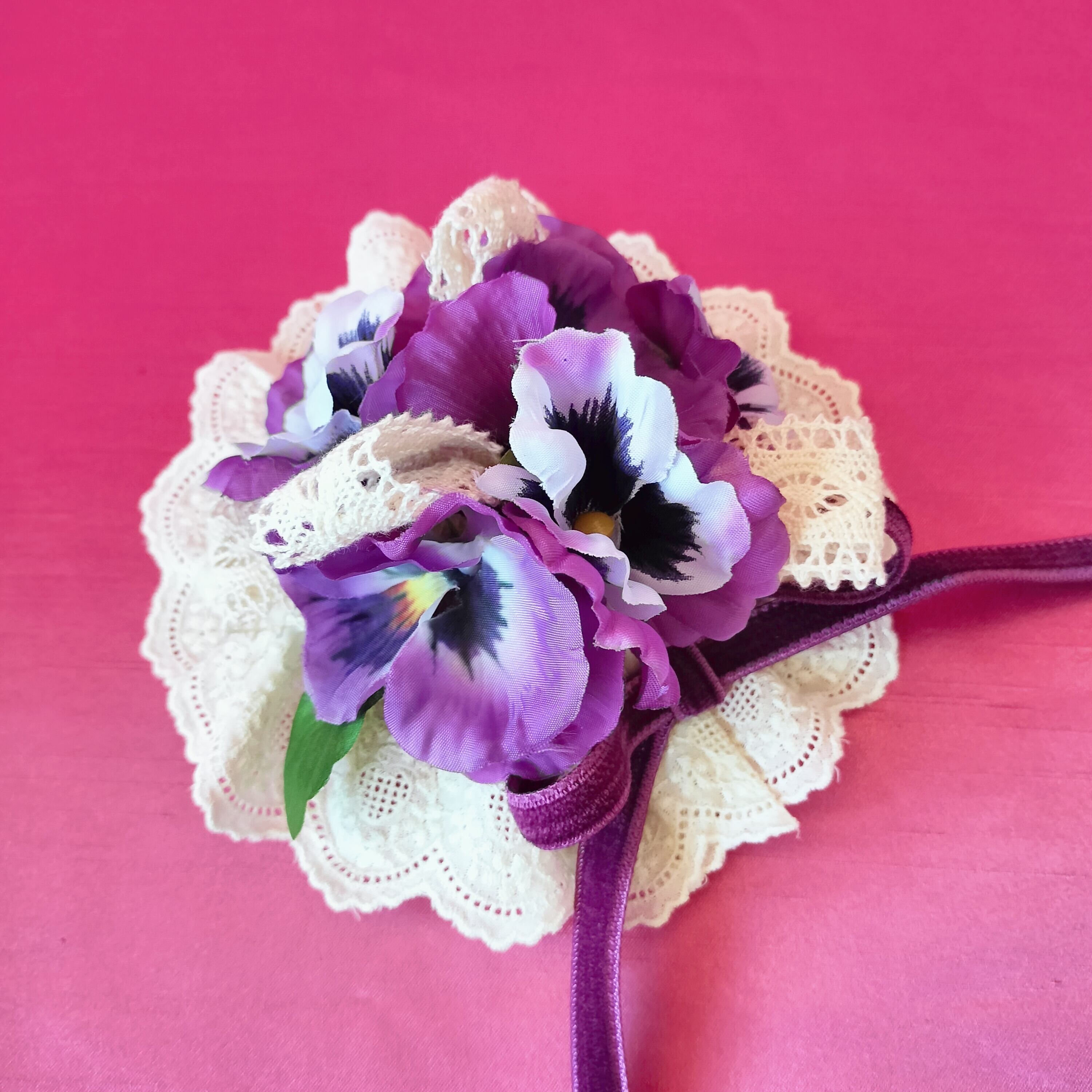 紫のパンジーと生成りのレースリボンでノスタルジックな午後をイメージした