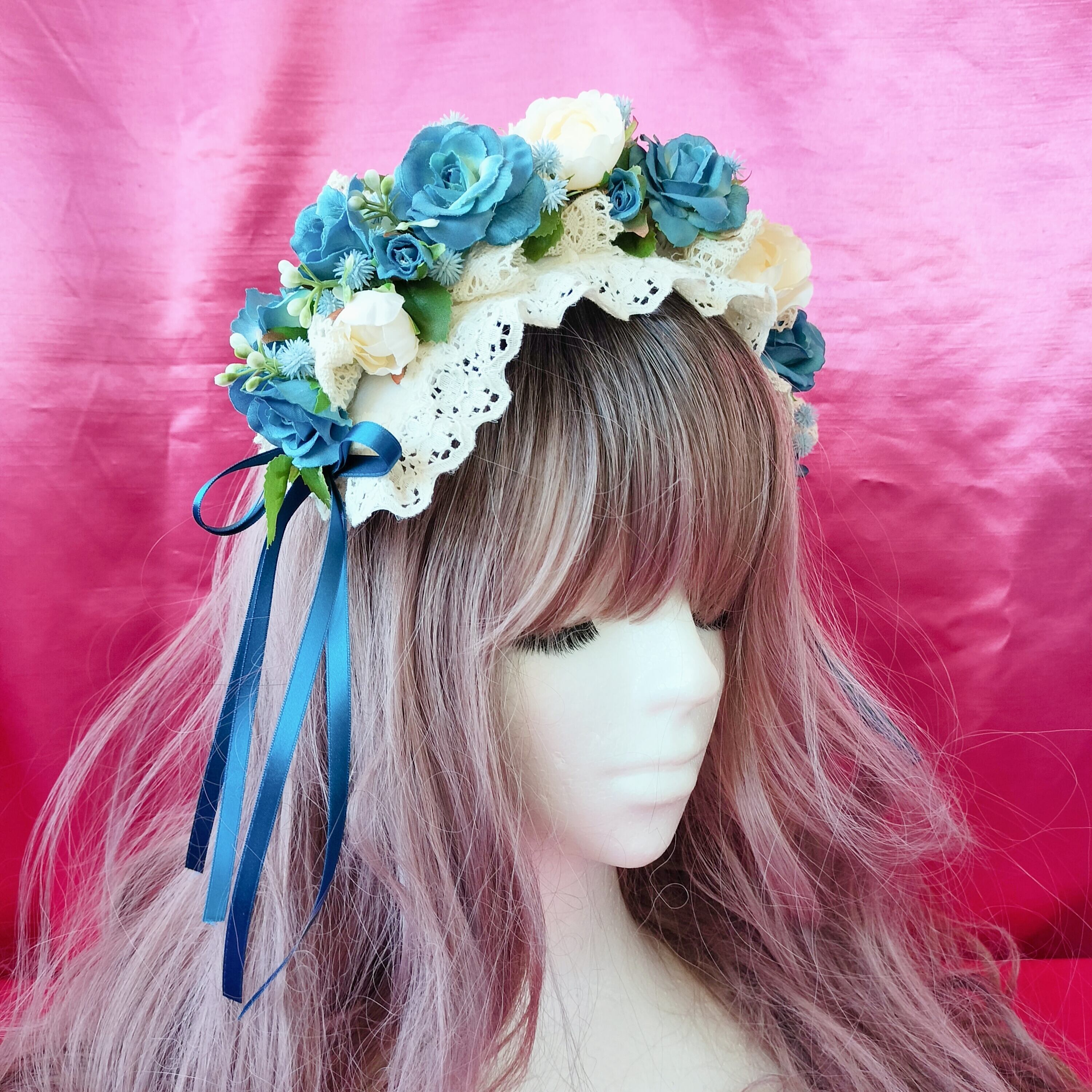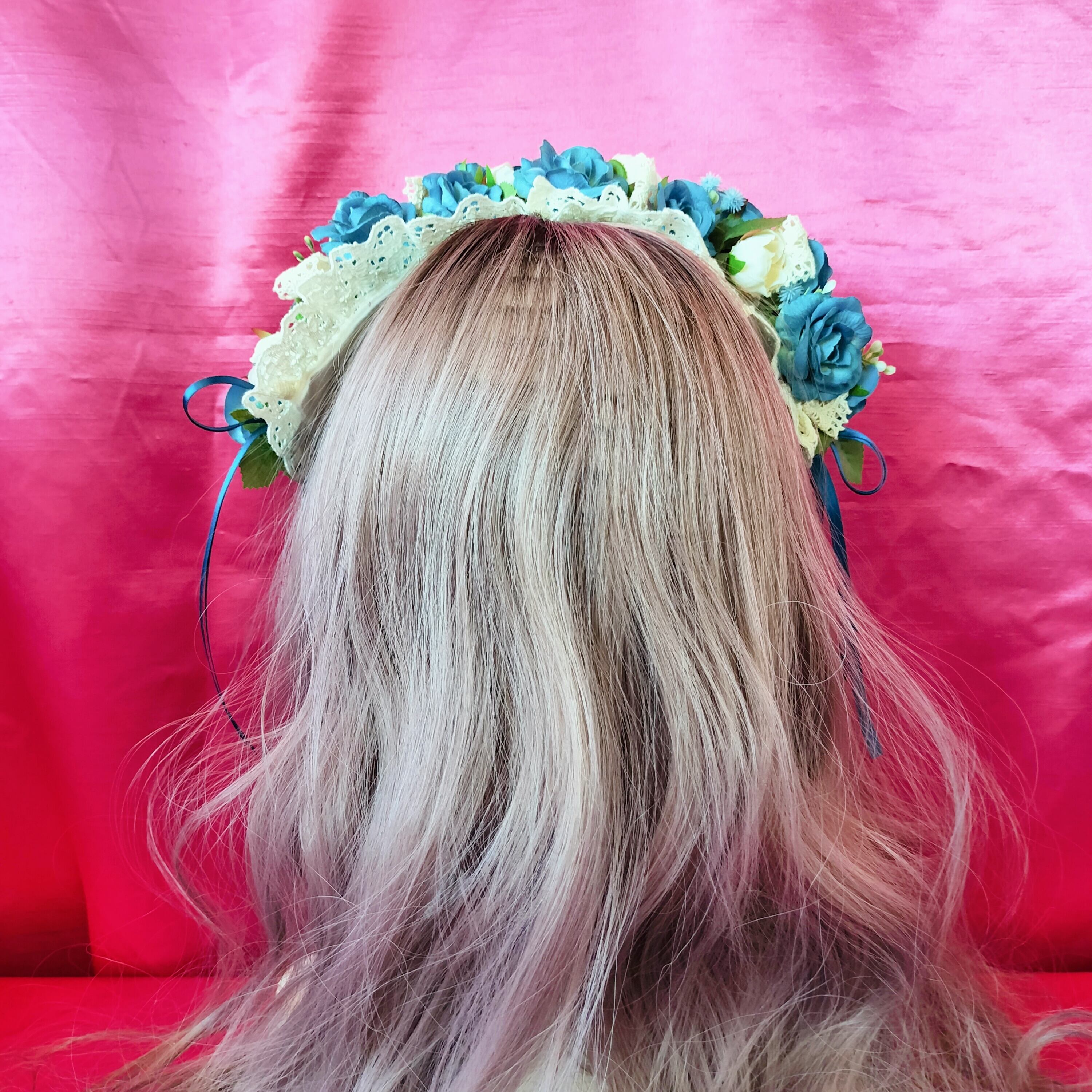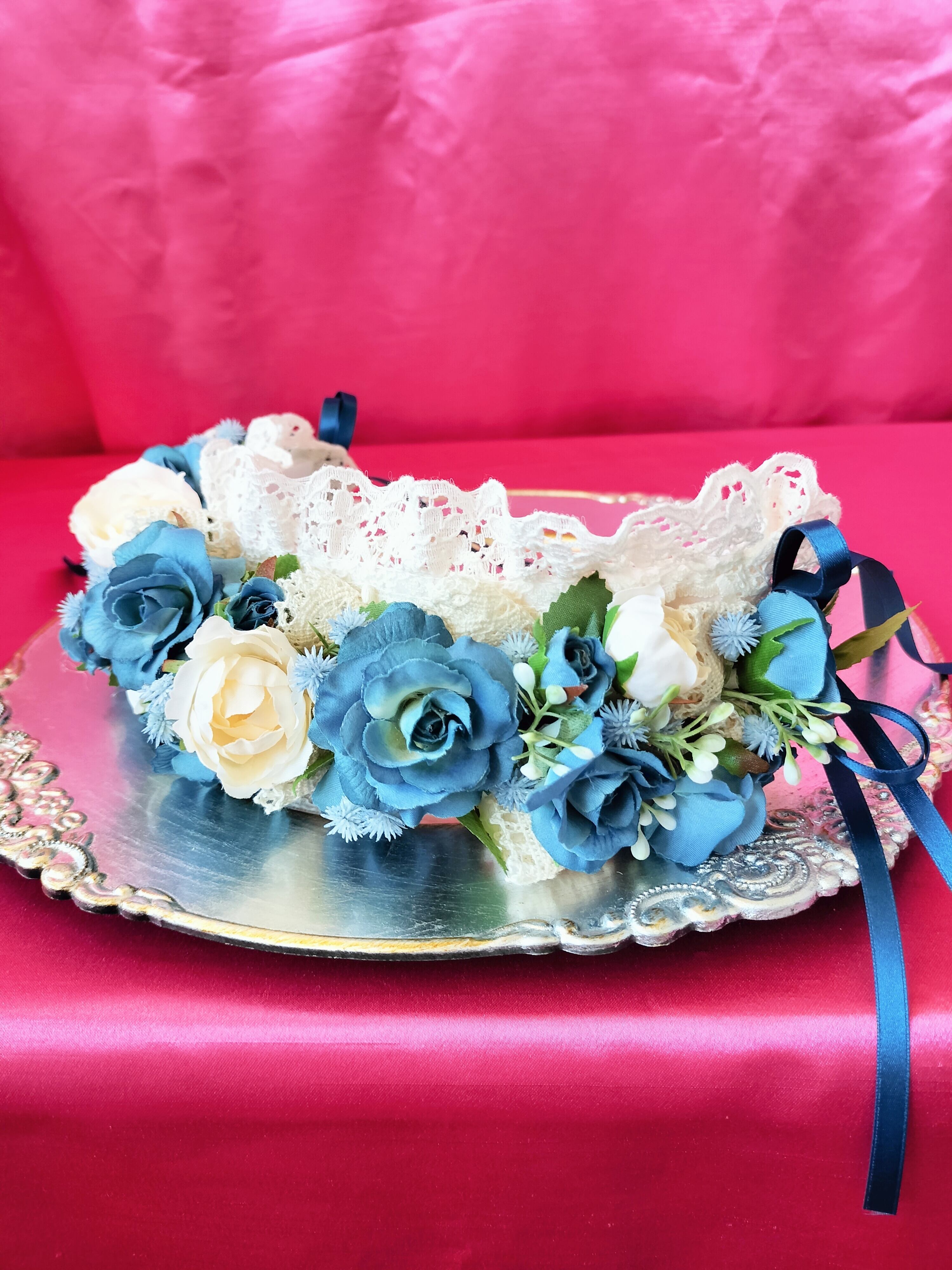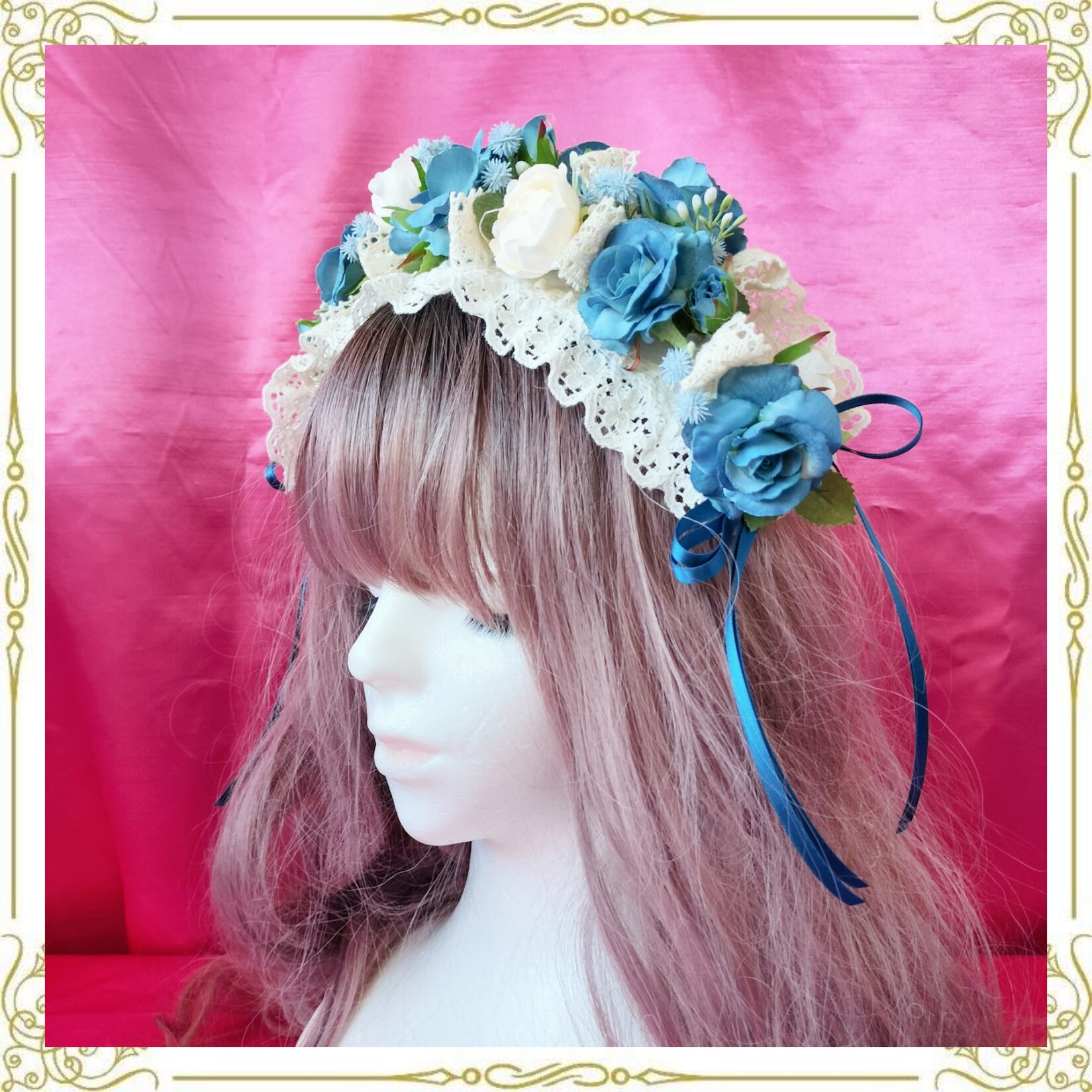 少しくすんだ青薔薇とアイボリーの薔薇・生成りのリボンをあしらったヘッドドレス