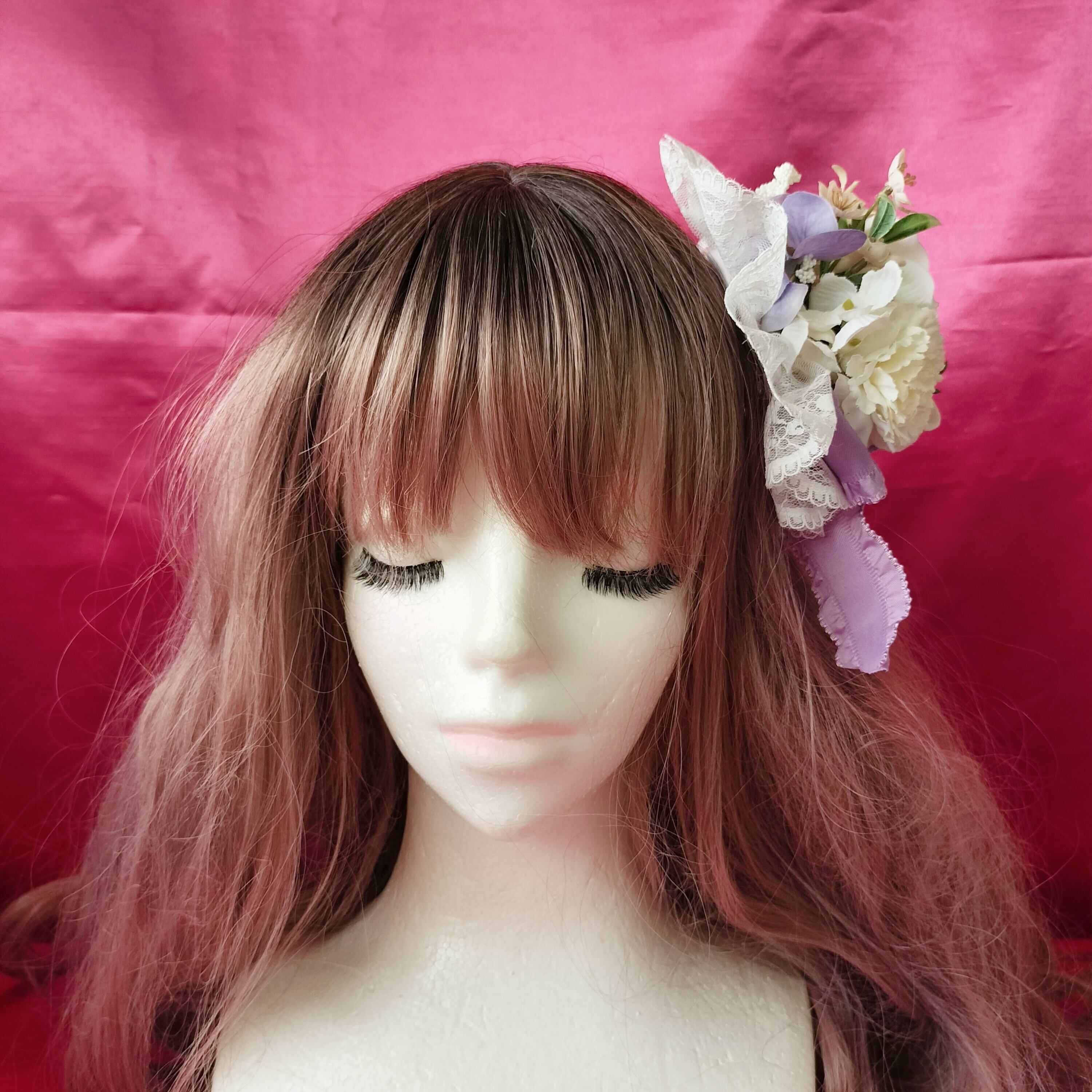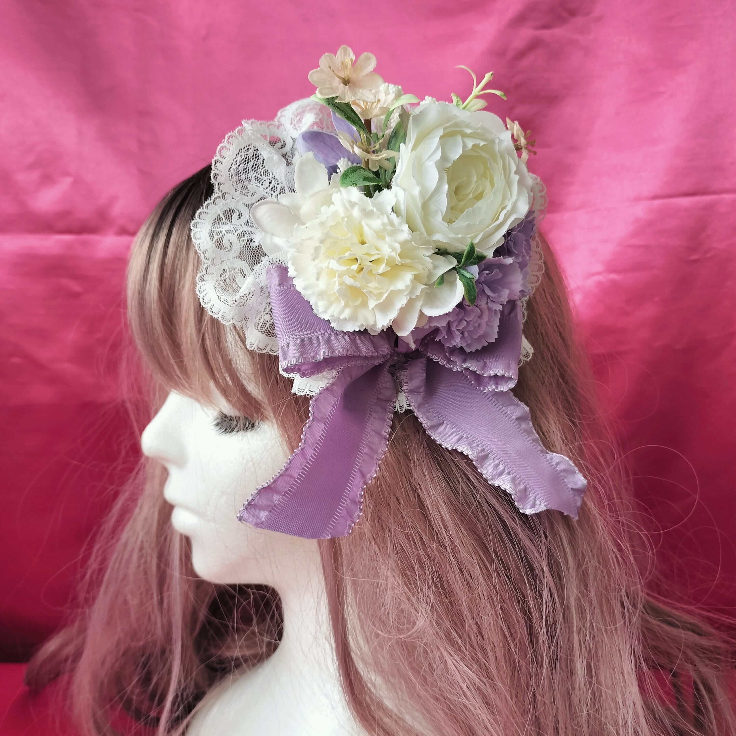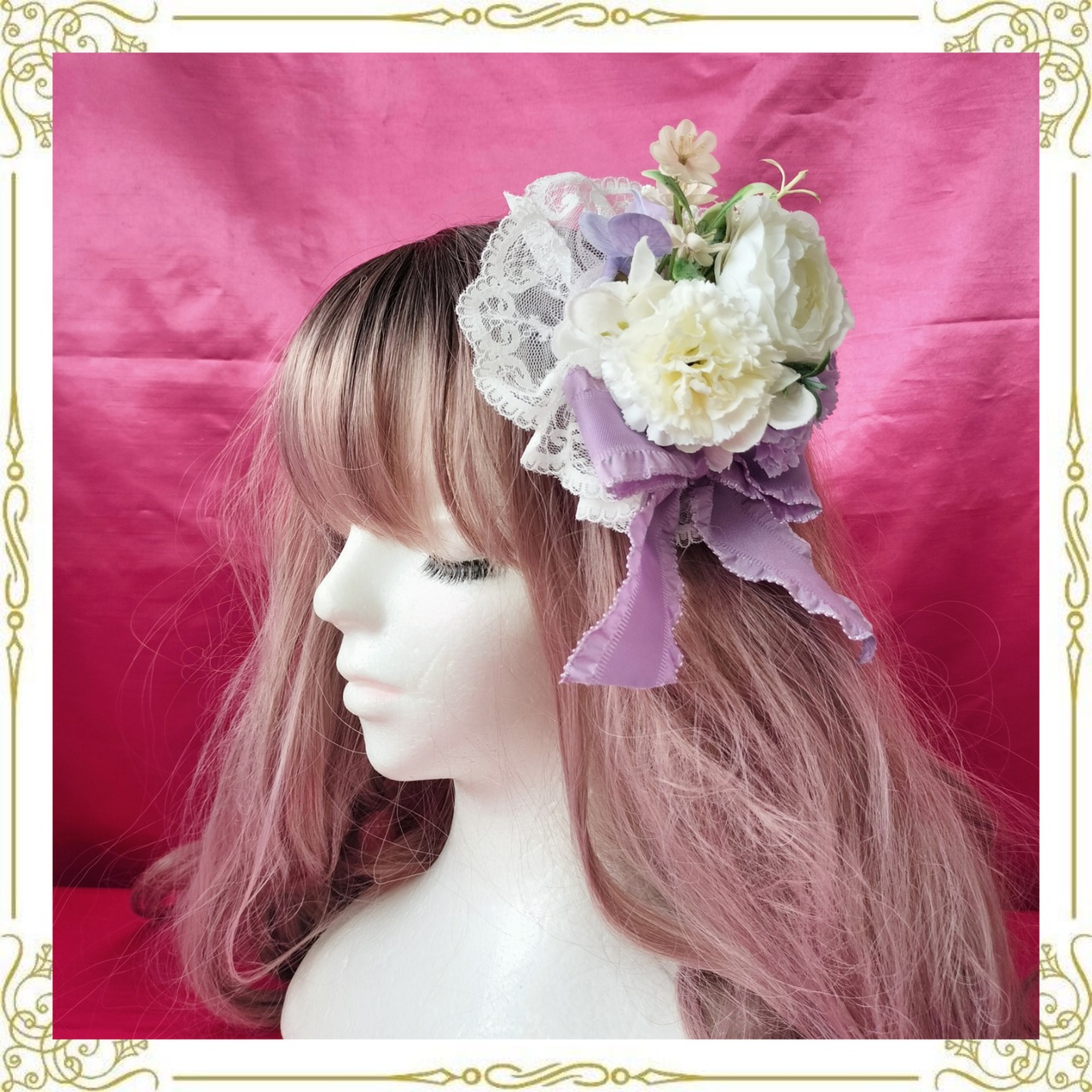 お揃いのパープルのリボンで纏めたヘッドドレス