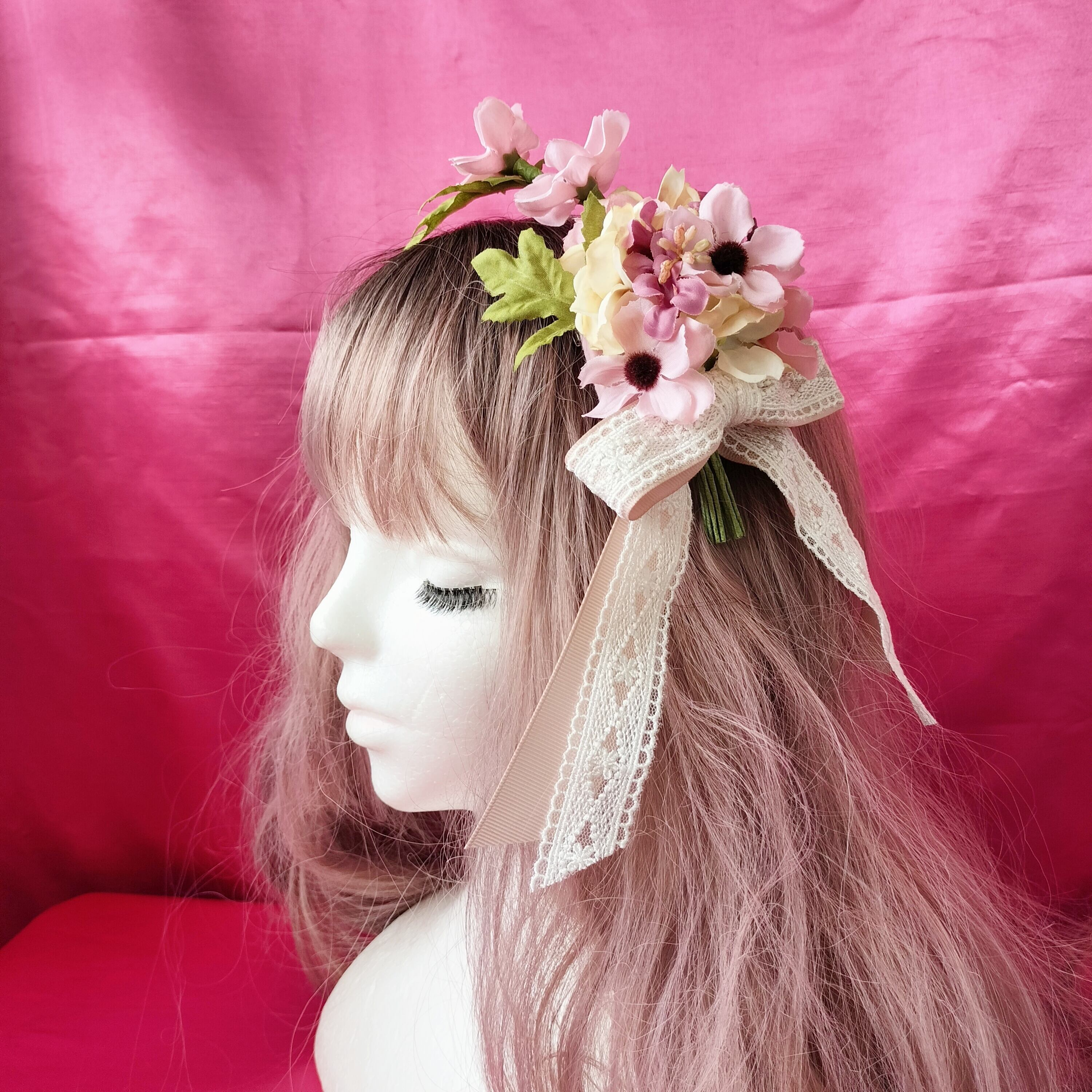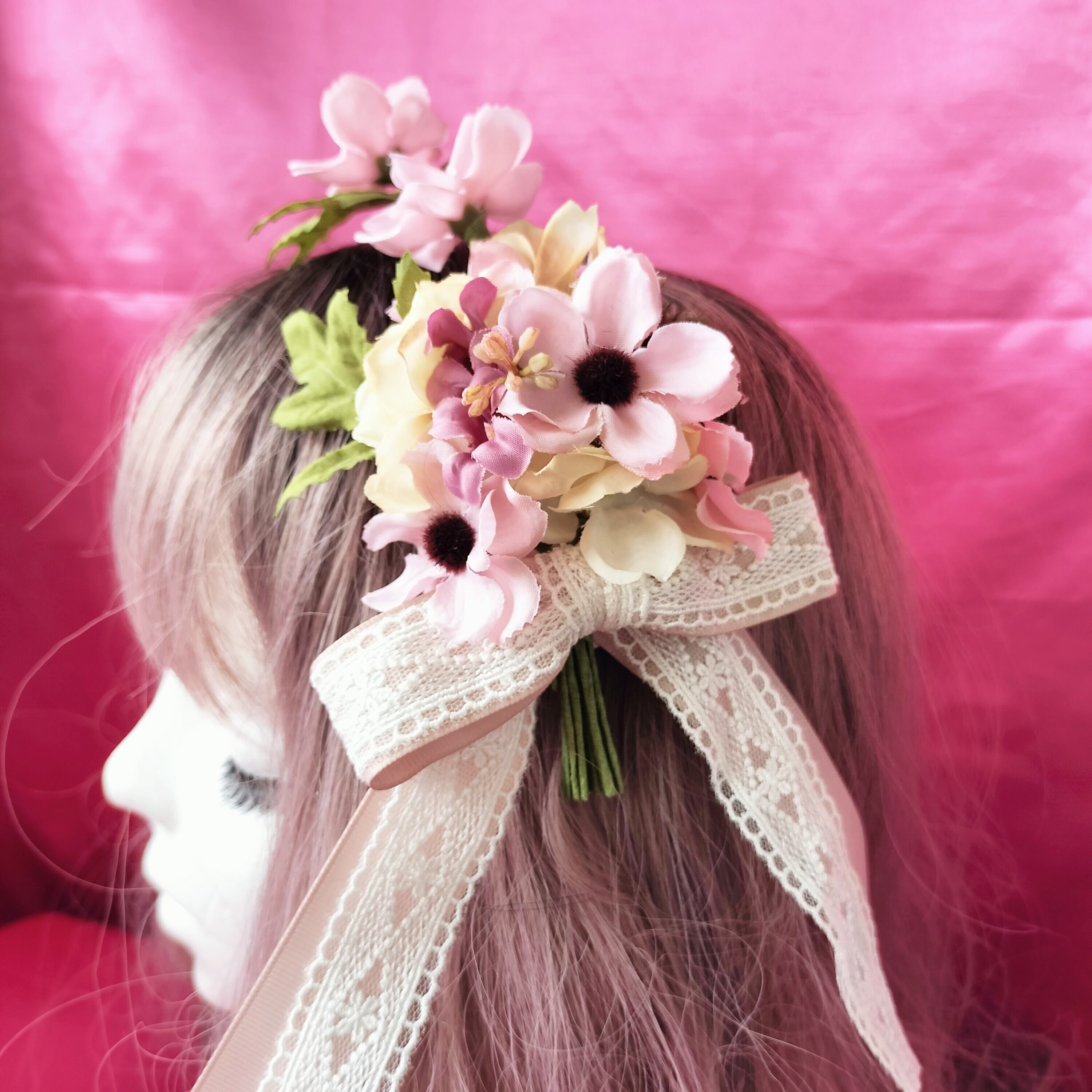 ピンクのアネモネとアジサイ・小花を花束のように束ねてリボンで結んだヘッドドレス。