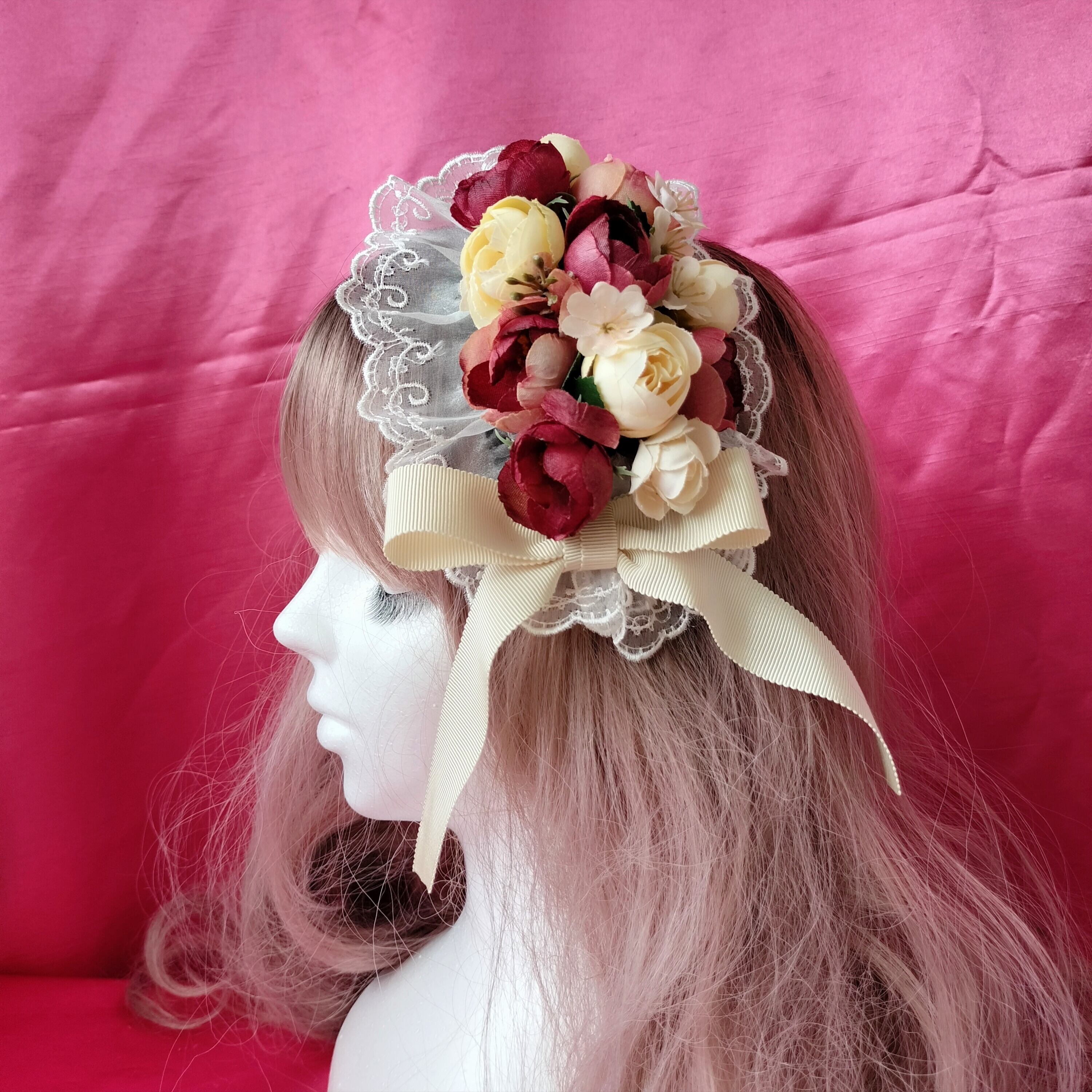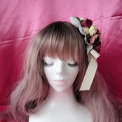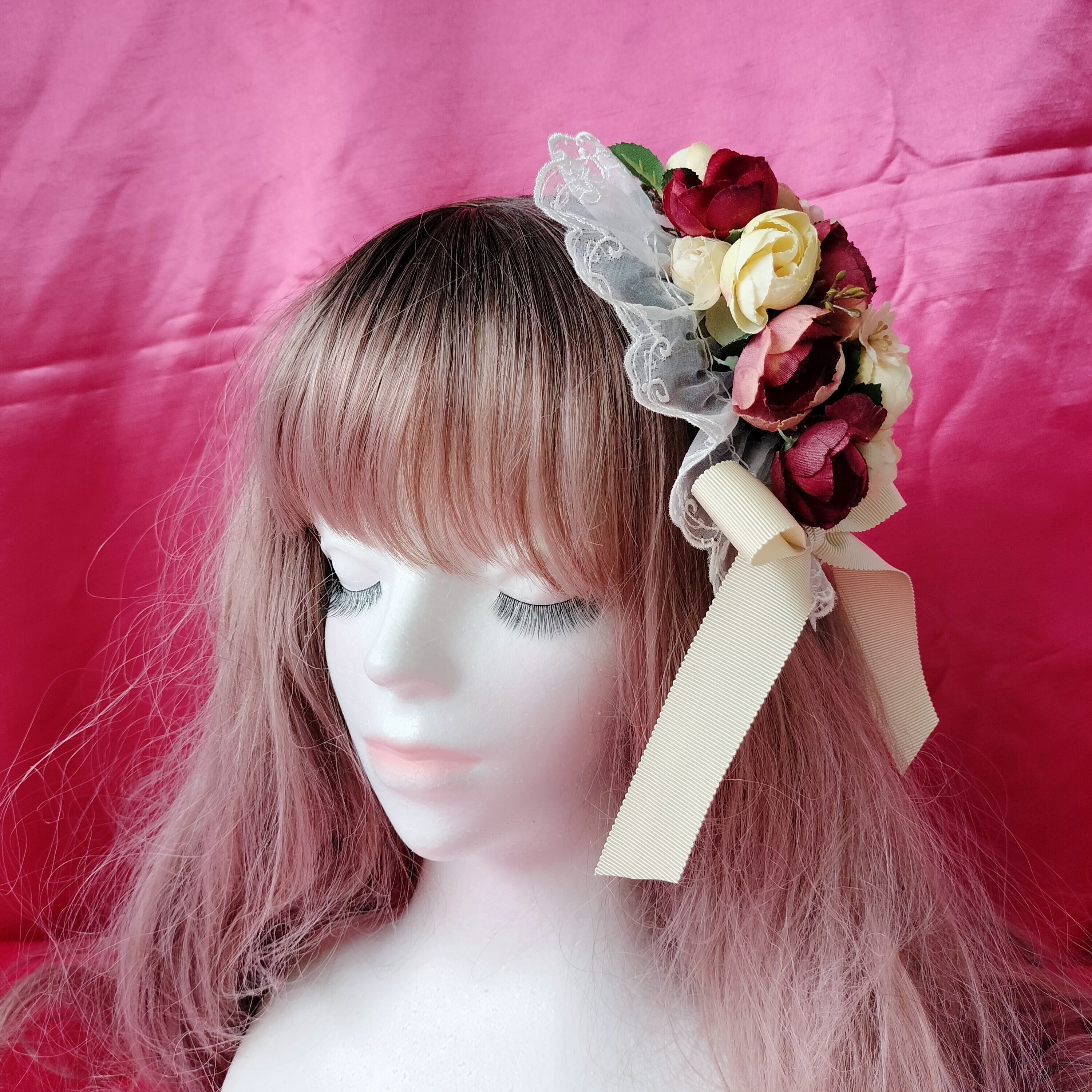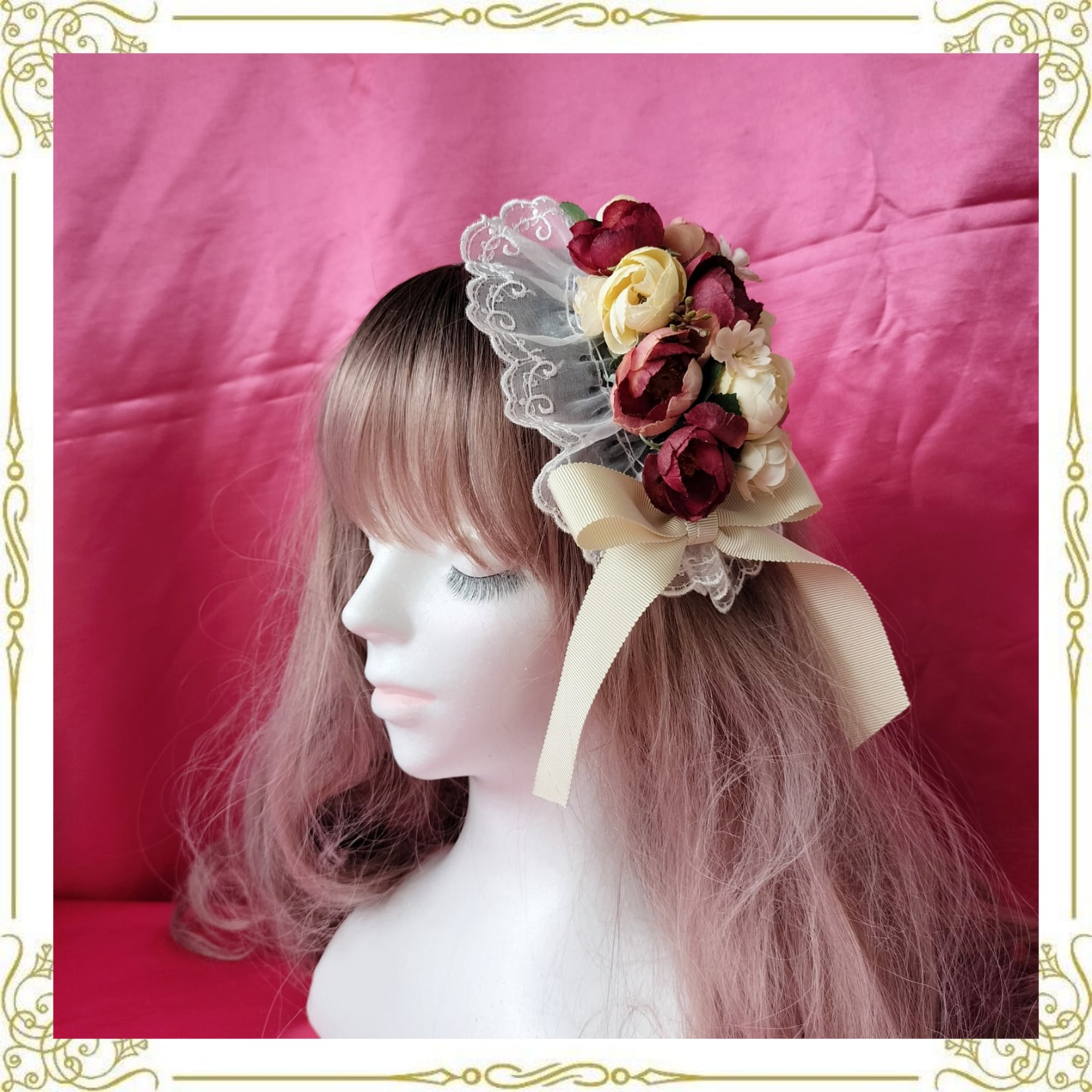 コロンと丸い生成りの薔薇とボルドー色のラナンキュラスを集めたヘッドドレス