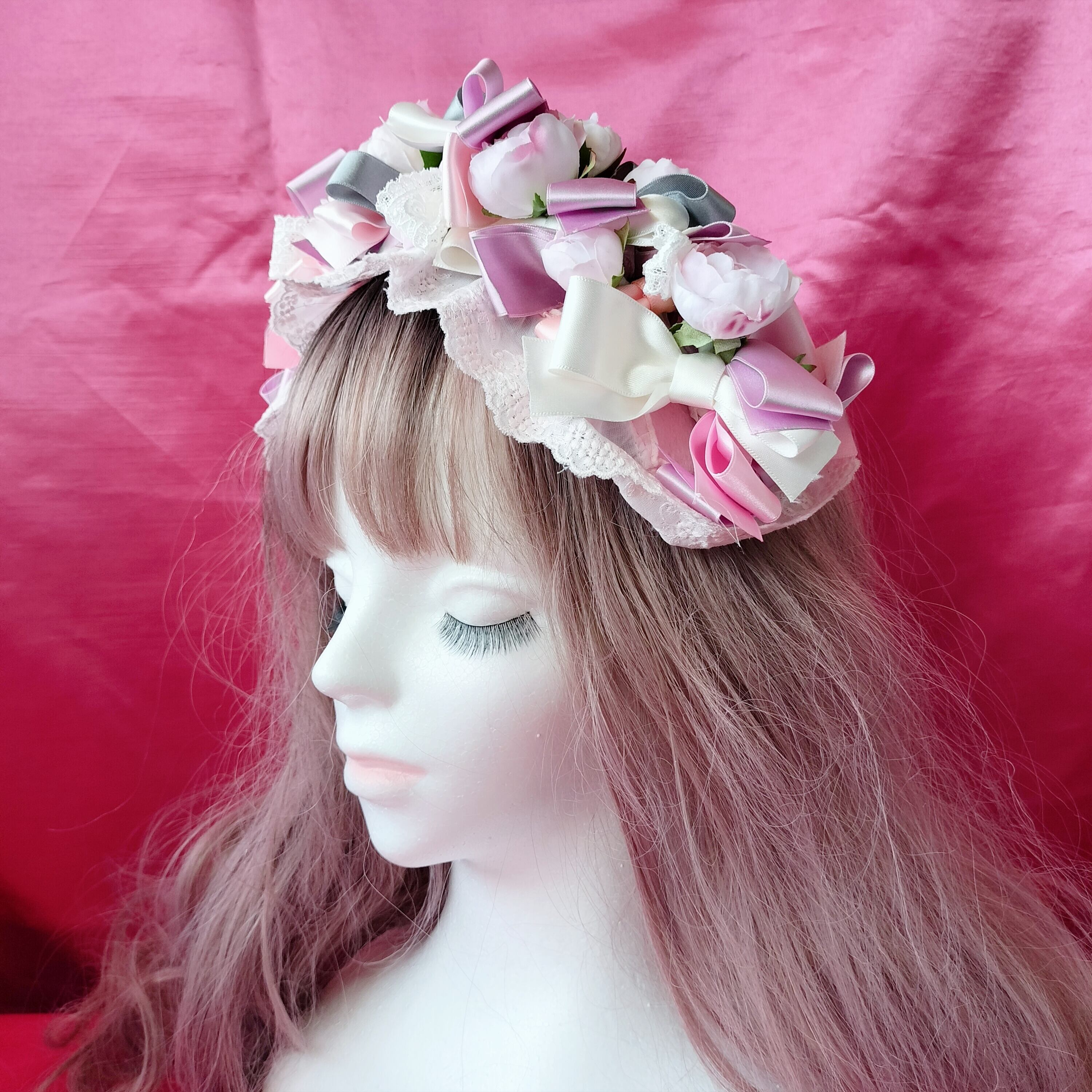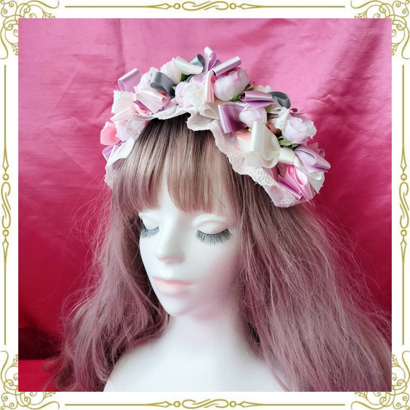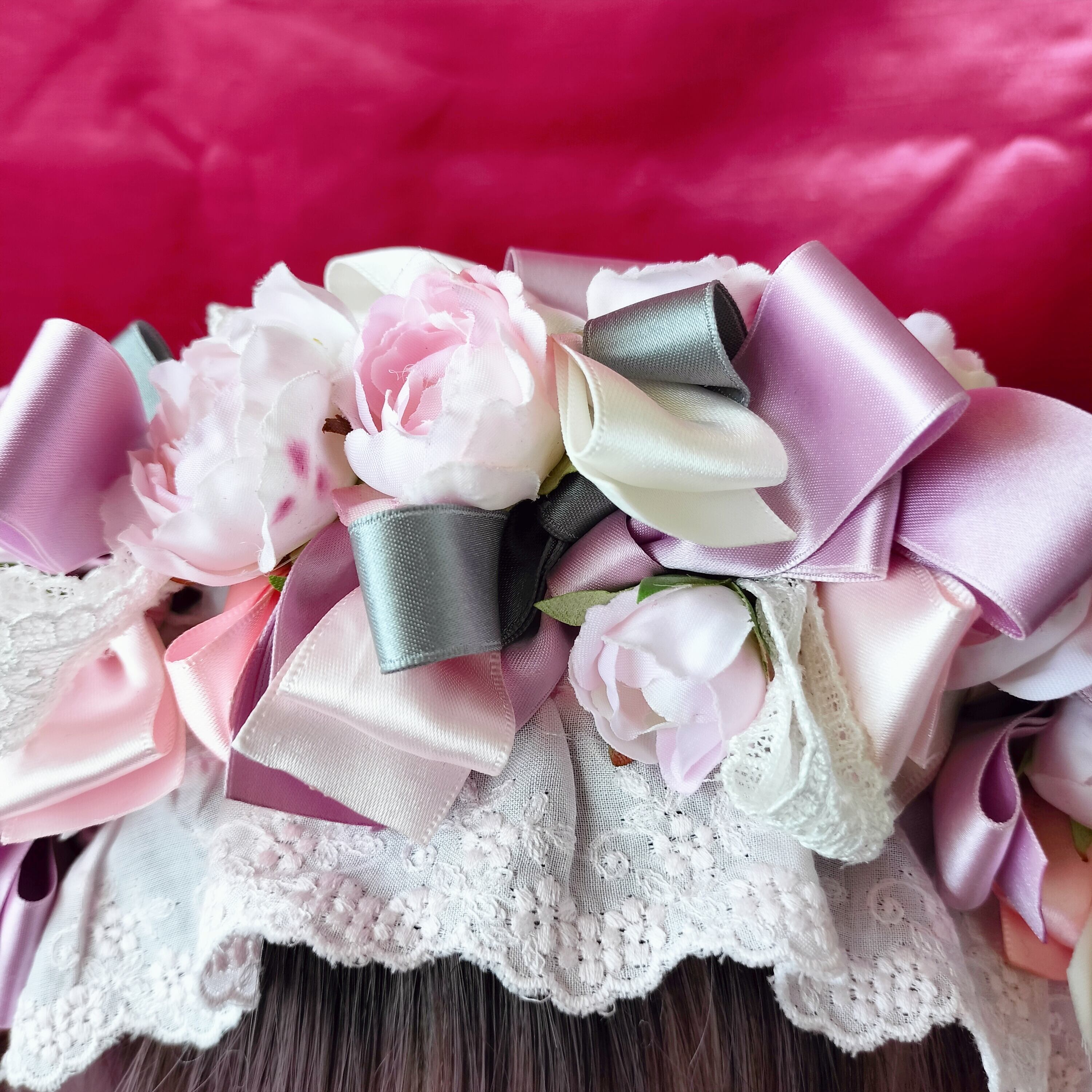 3色のピンクとグレー、ホワイト、レースのリボンとピンク薔薇を集めたヘッドドレス