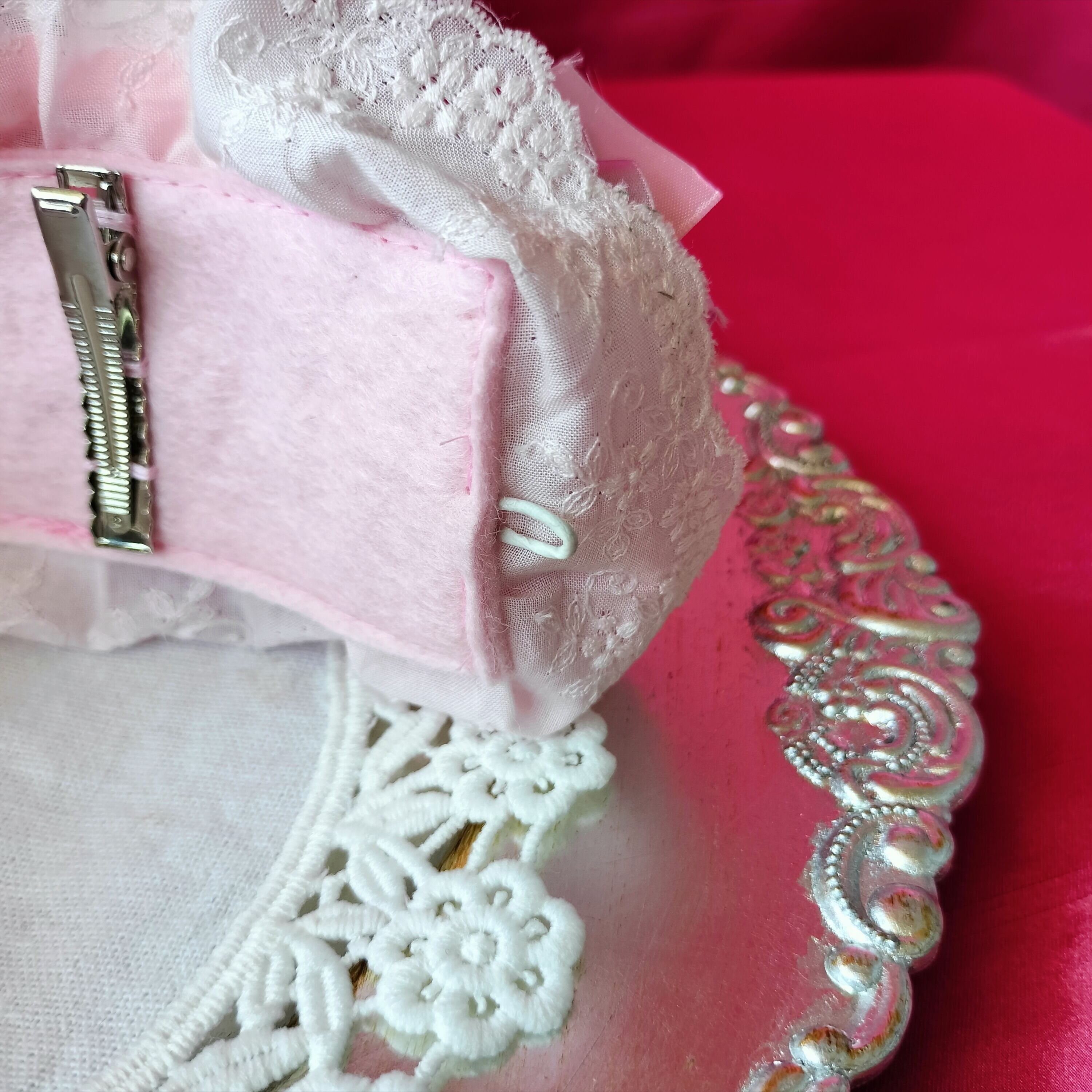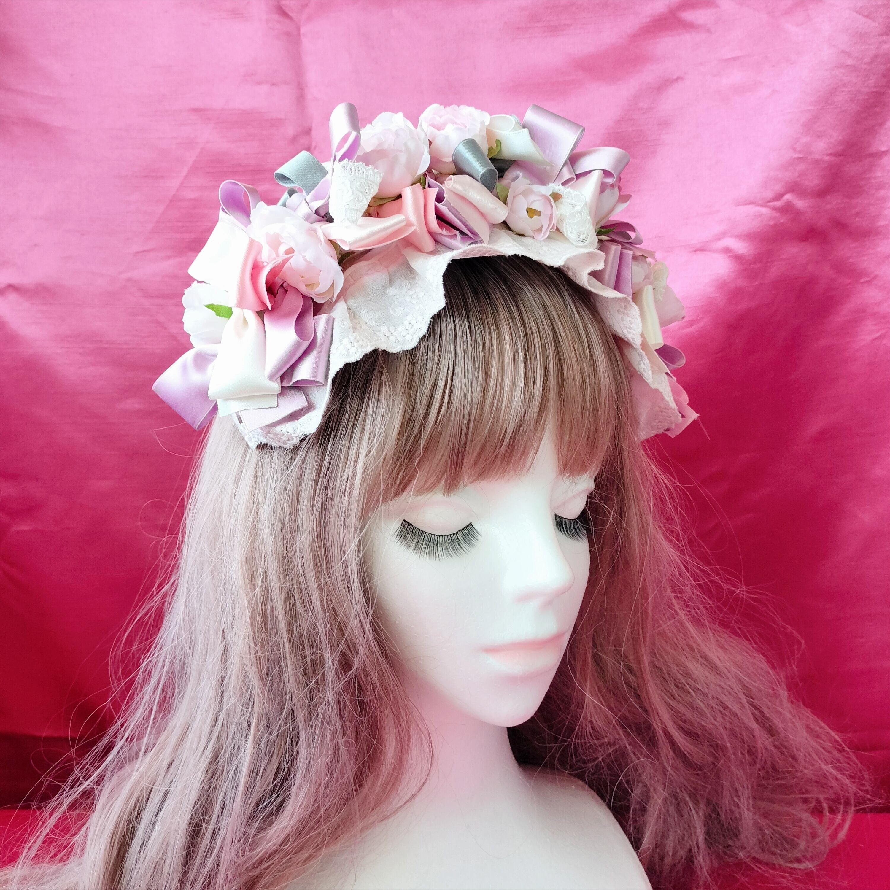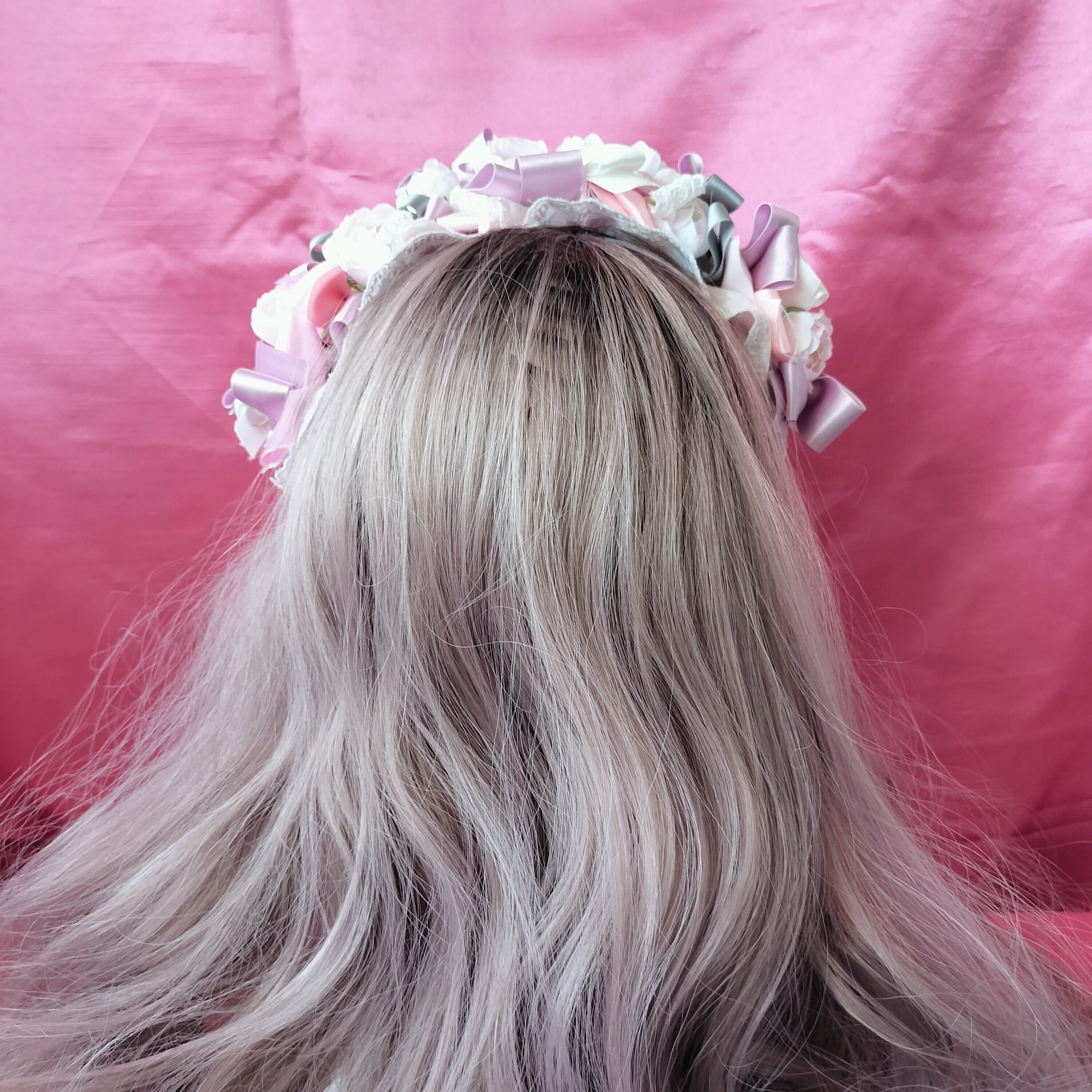 3色のピンクとグレー、ホワイト、レースのリボンとピンク薔薇を集めたヘッドドレス