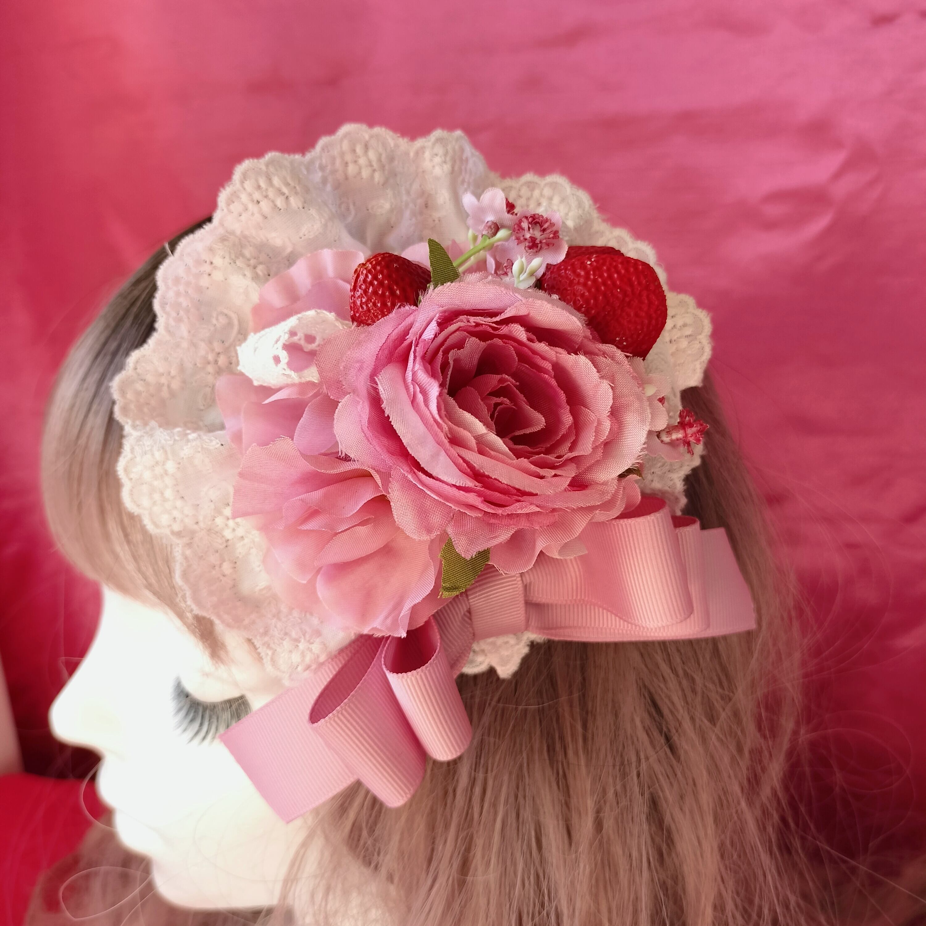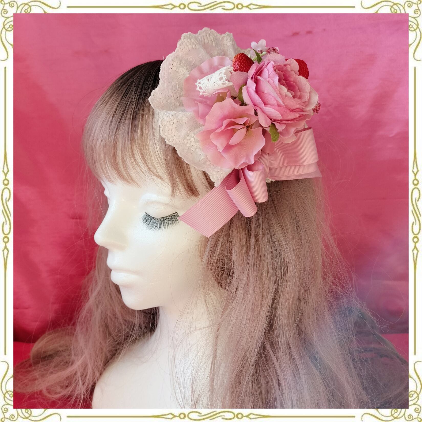 いちごとピンクの薔薇をメインにスィートピーや小花を集めた甘くて可愛いヘッドドレス