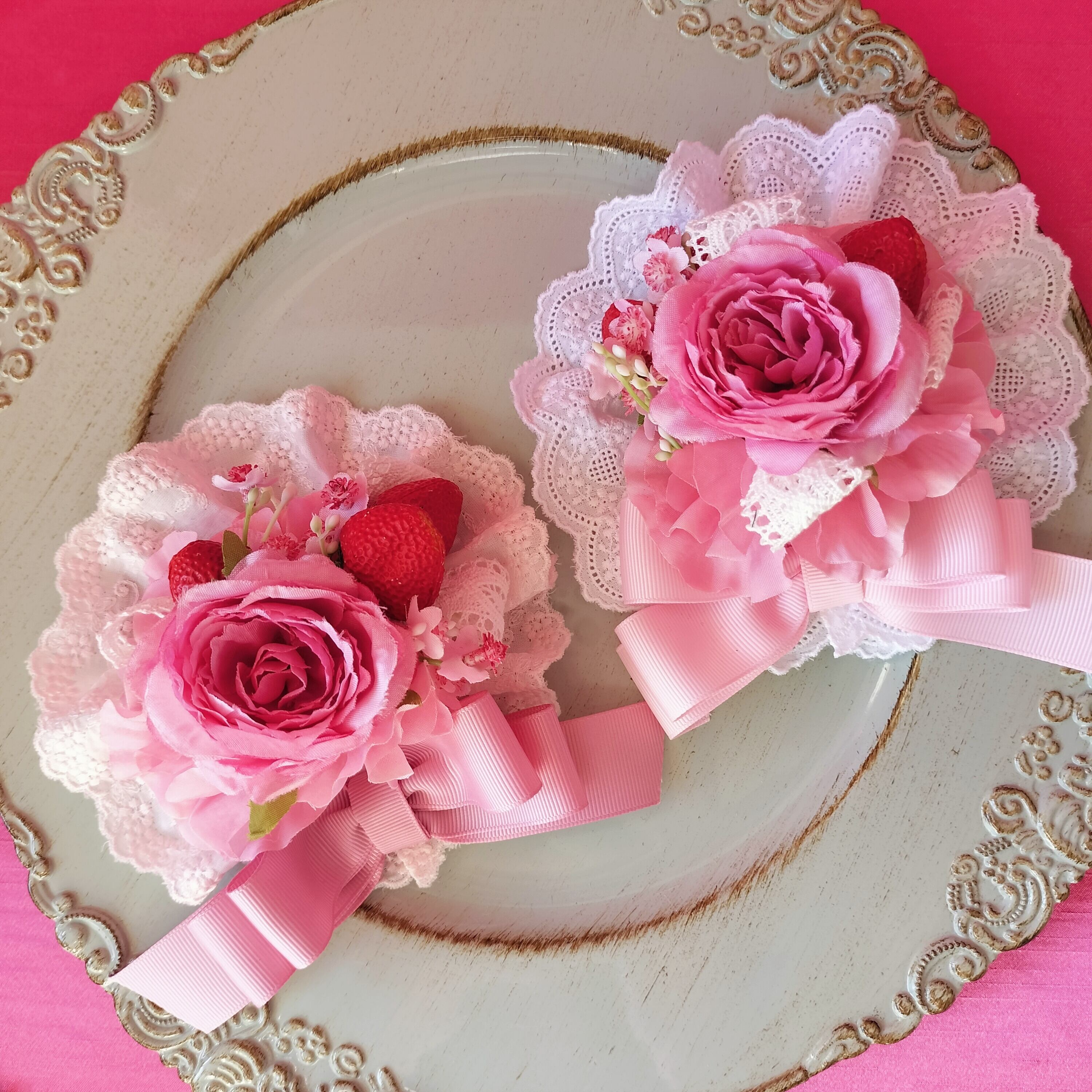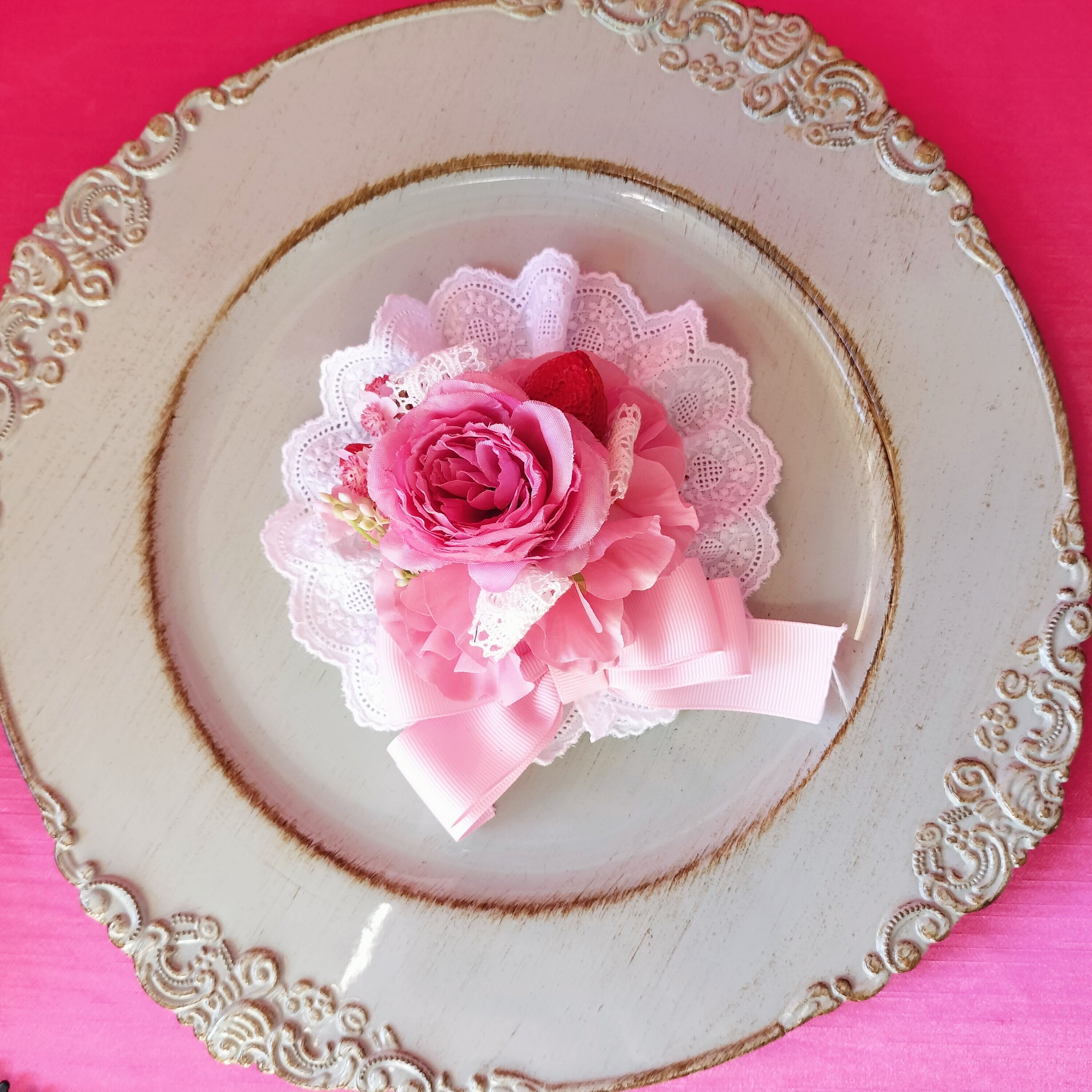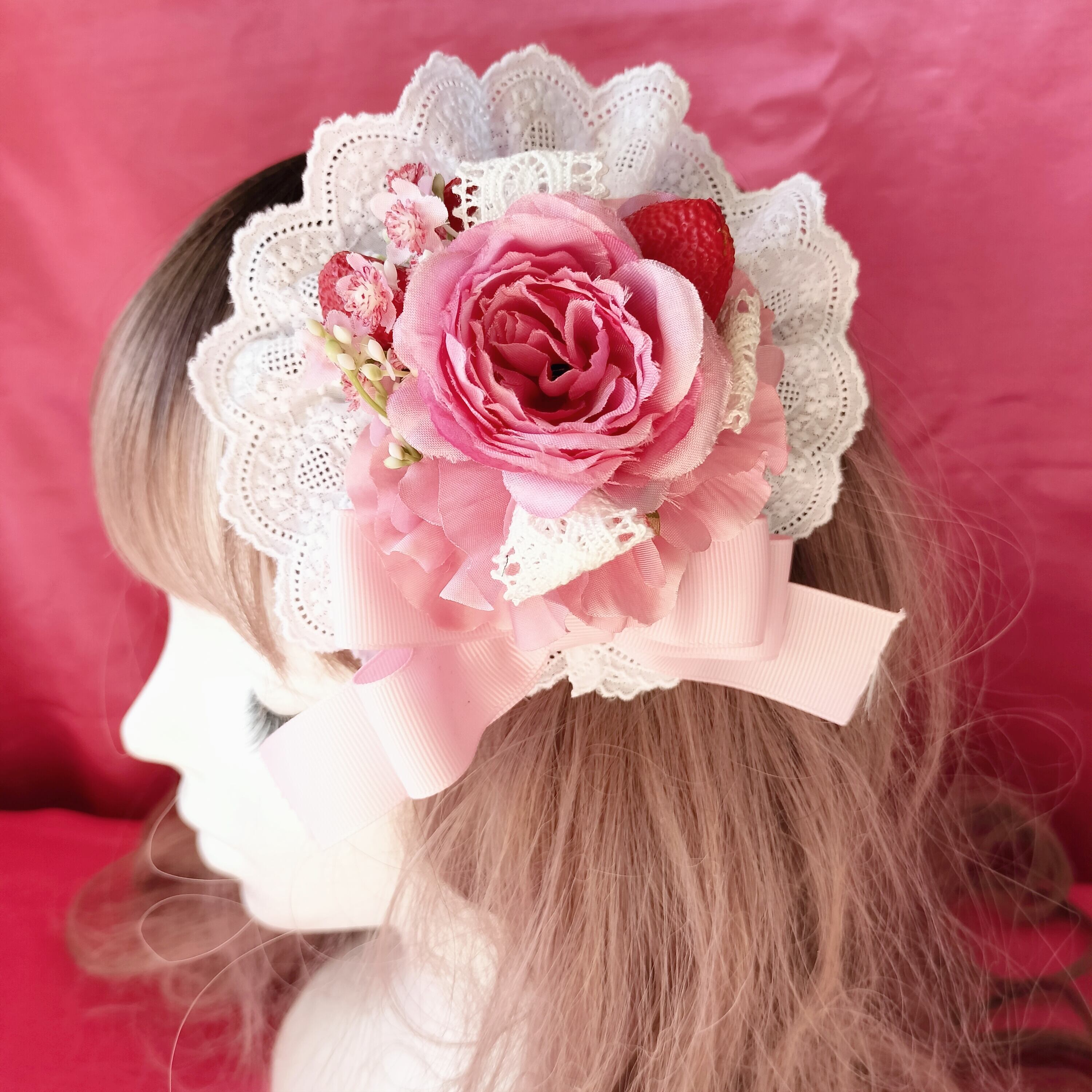 いちごとピンクの薔薇をメインにスィートピーや小花を集めた可愛いヘッドドレス