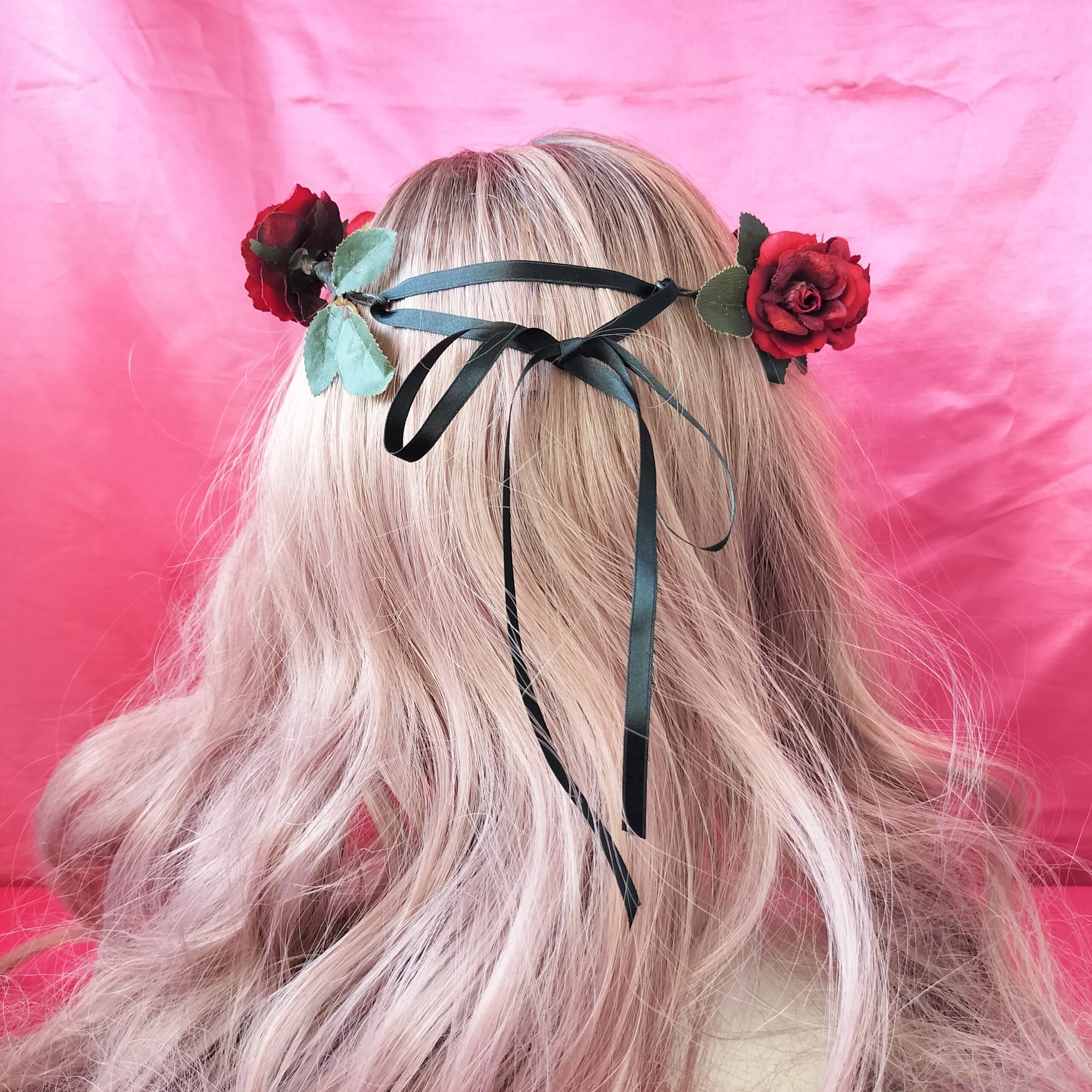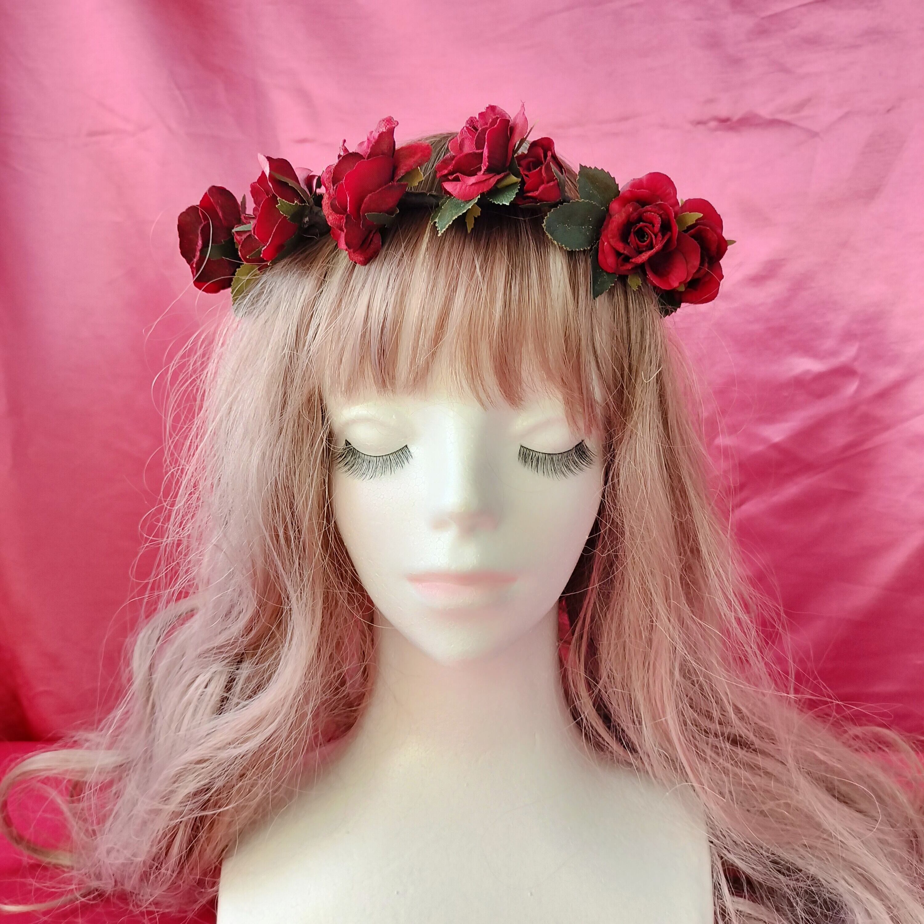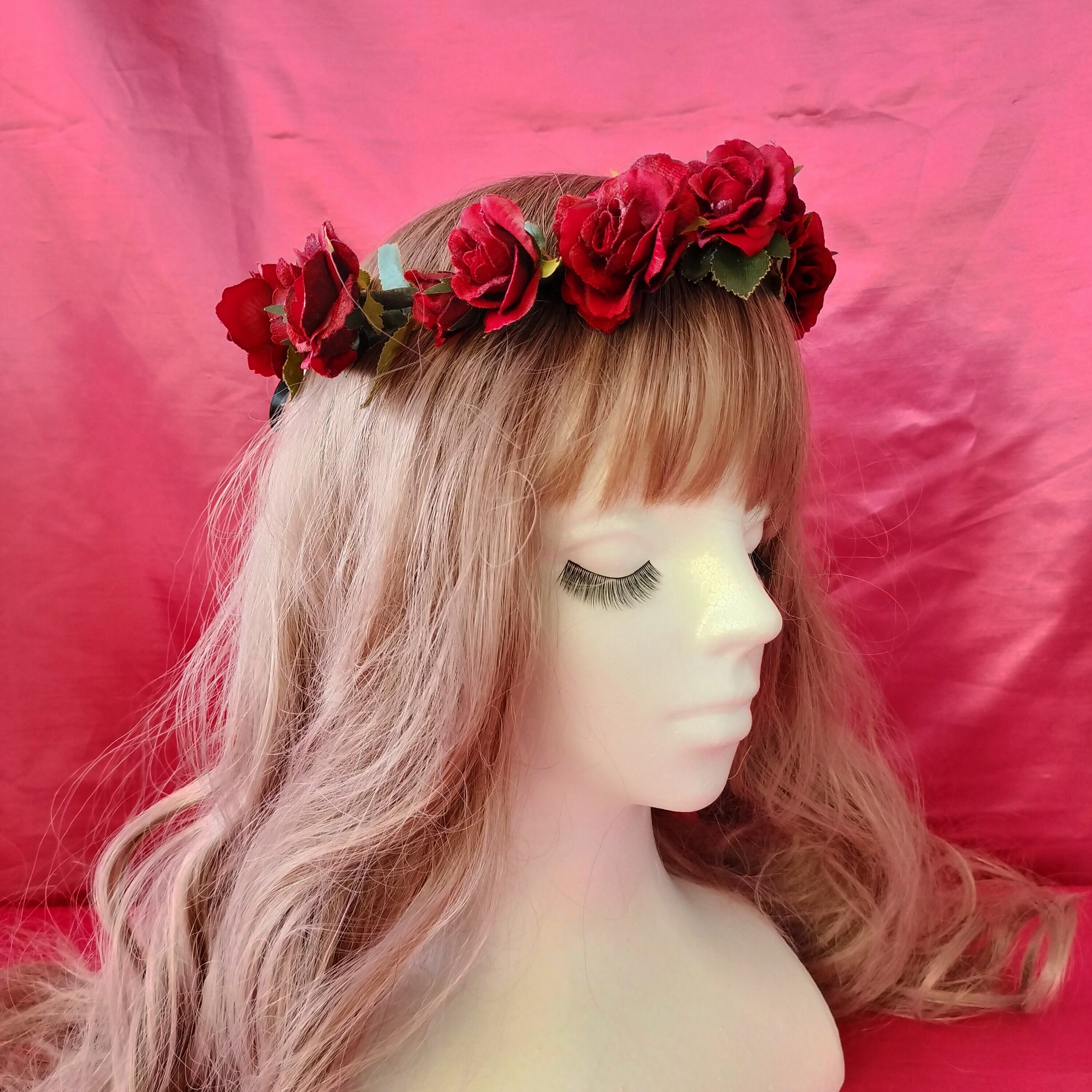ダークな赤薔薇と深緑の薔薇の葉の花冠