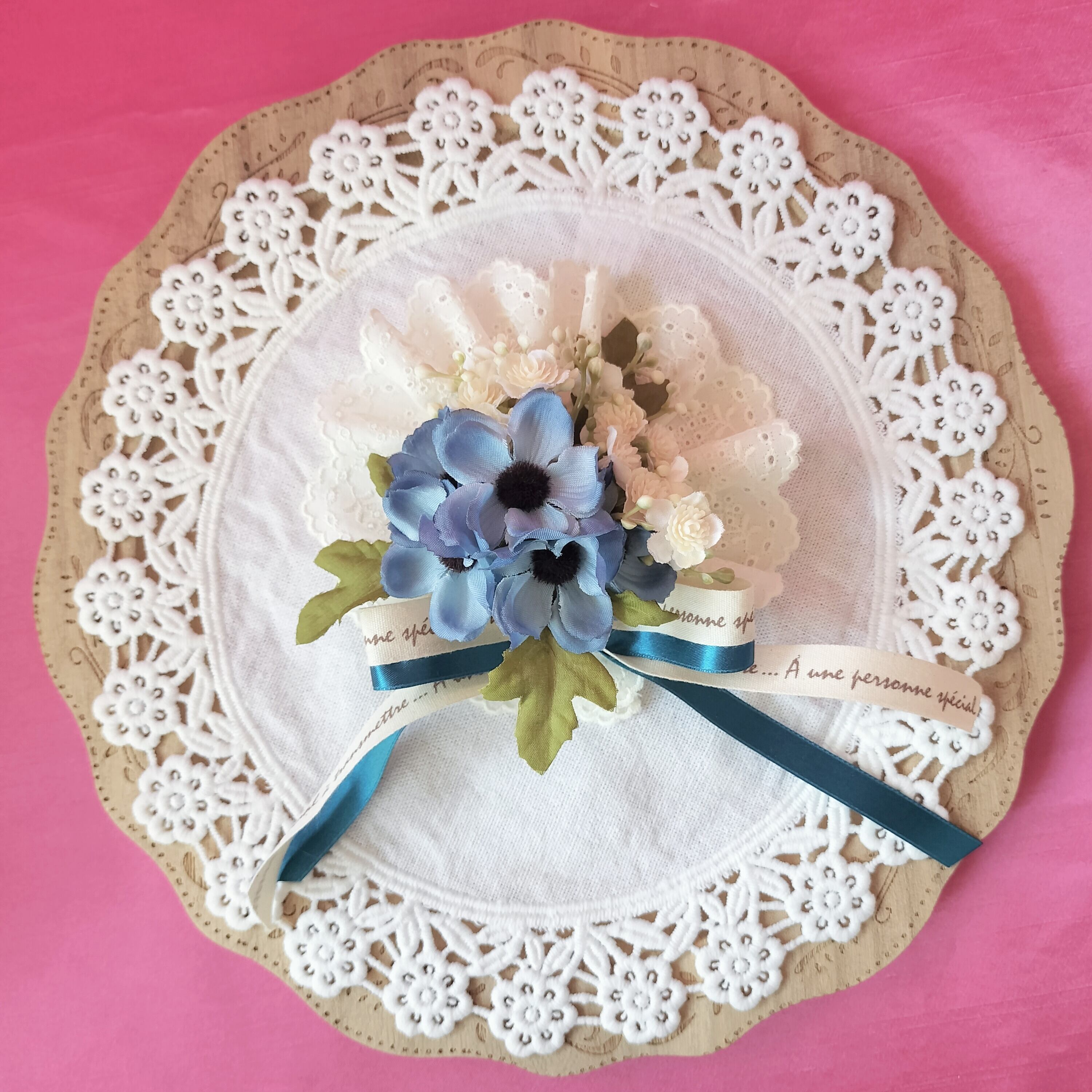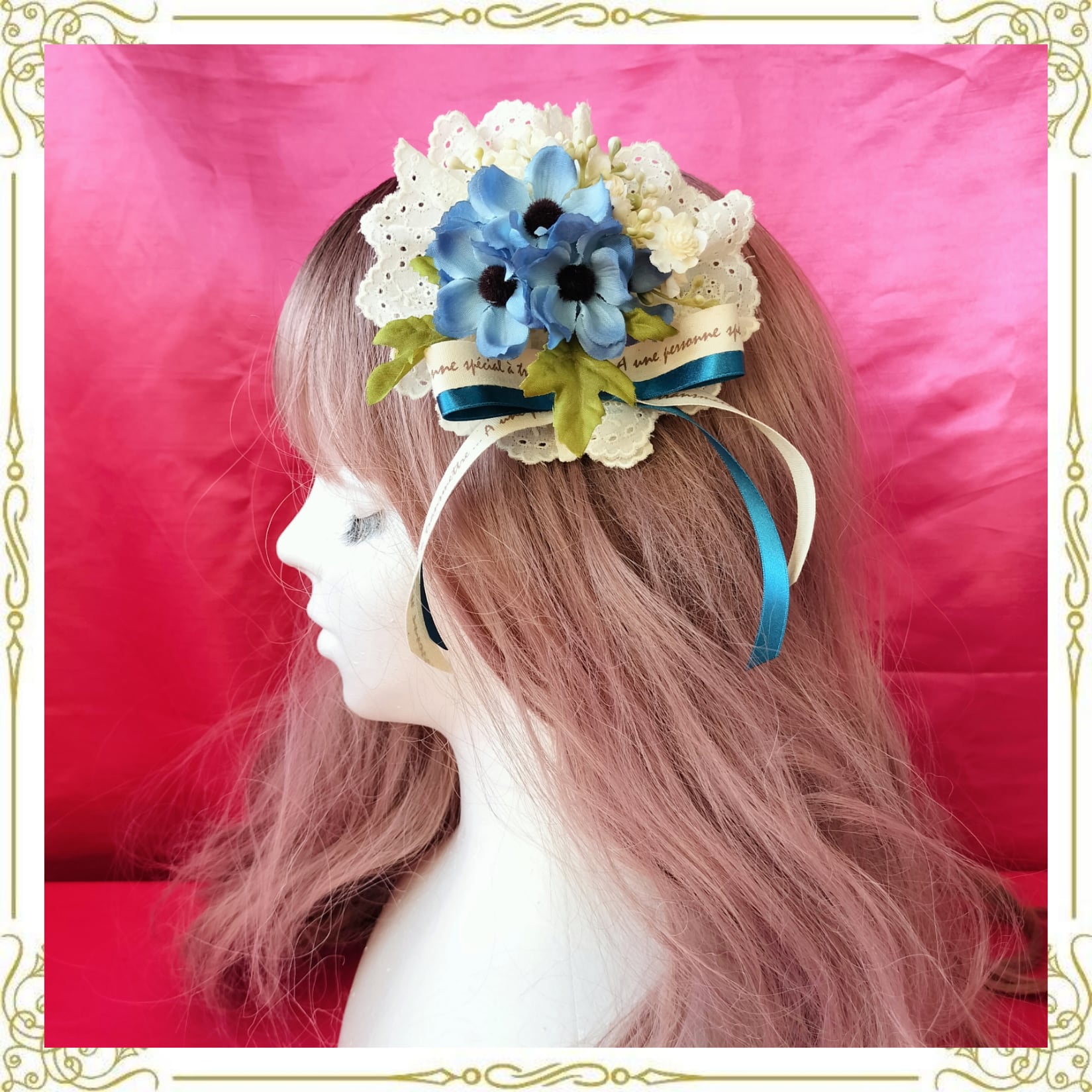 青いアネモネと小花を生成りのレースで纏めたヘッドドレス