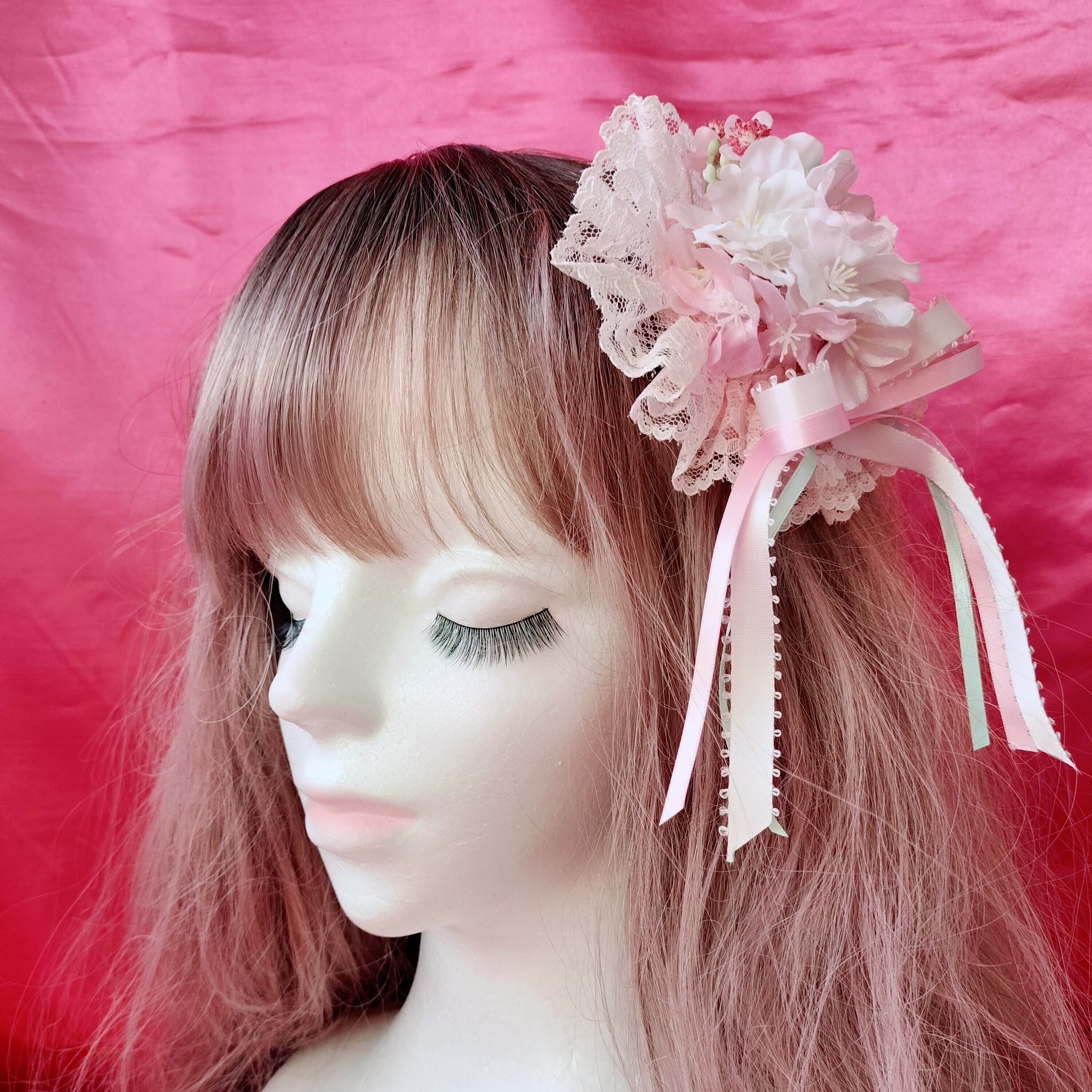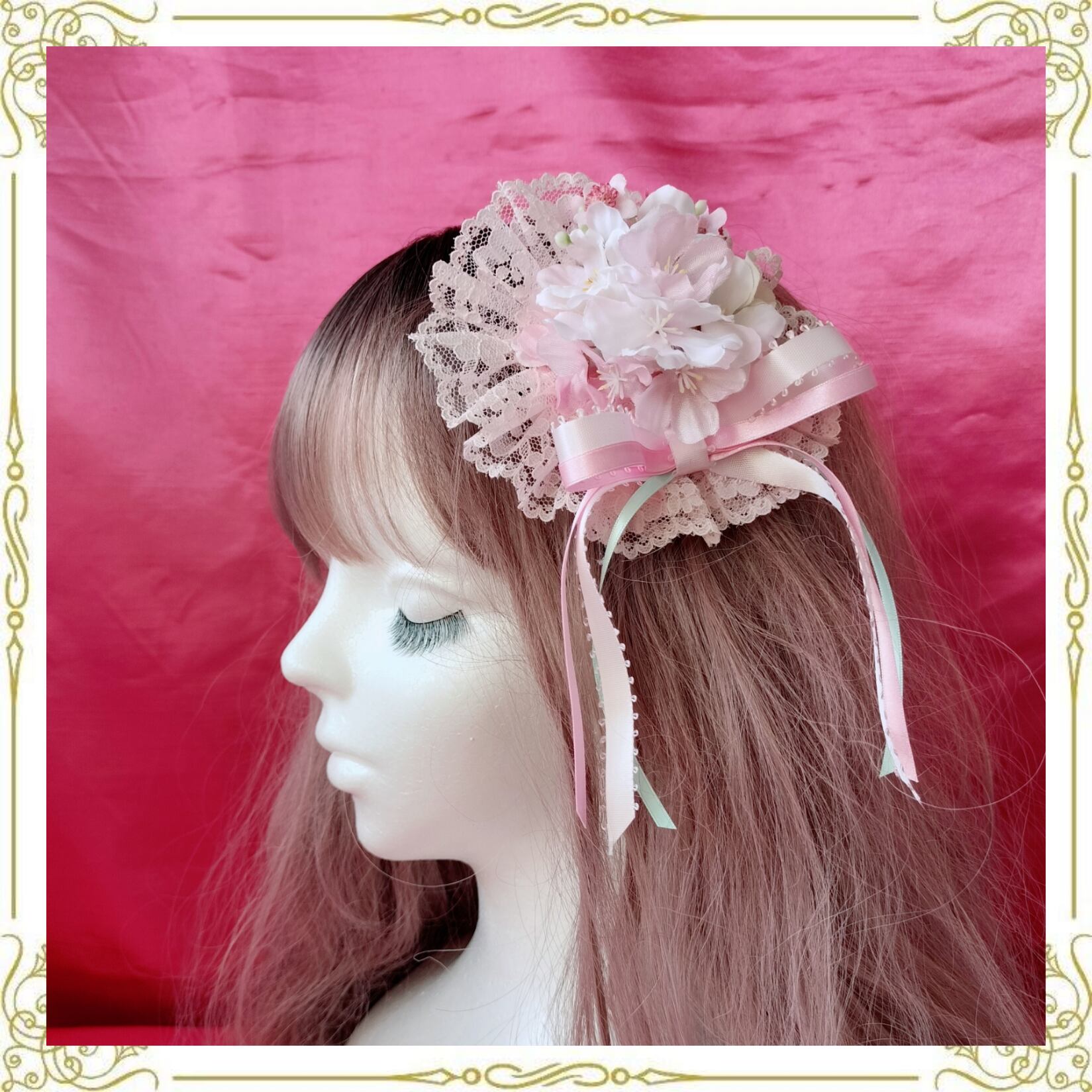 ピンクのレースと3色(ピンク、淡いピンク、淡いミント)のリボンがとても愛らしいです。